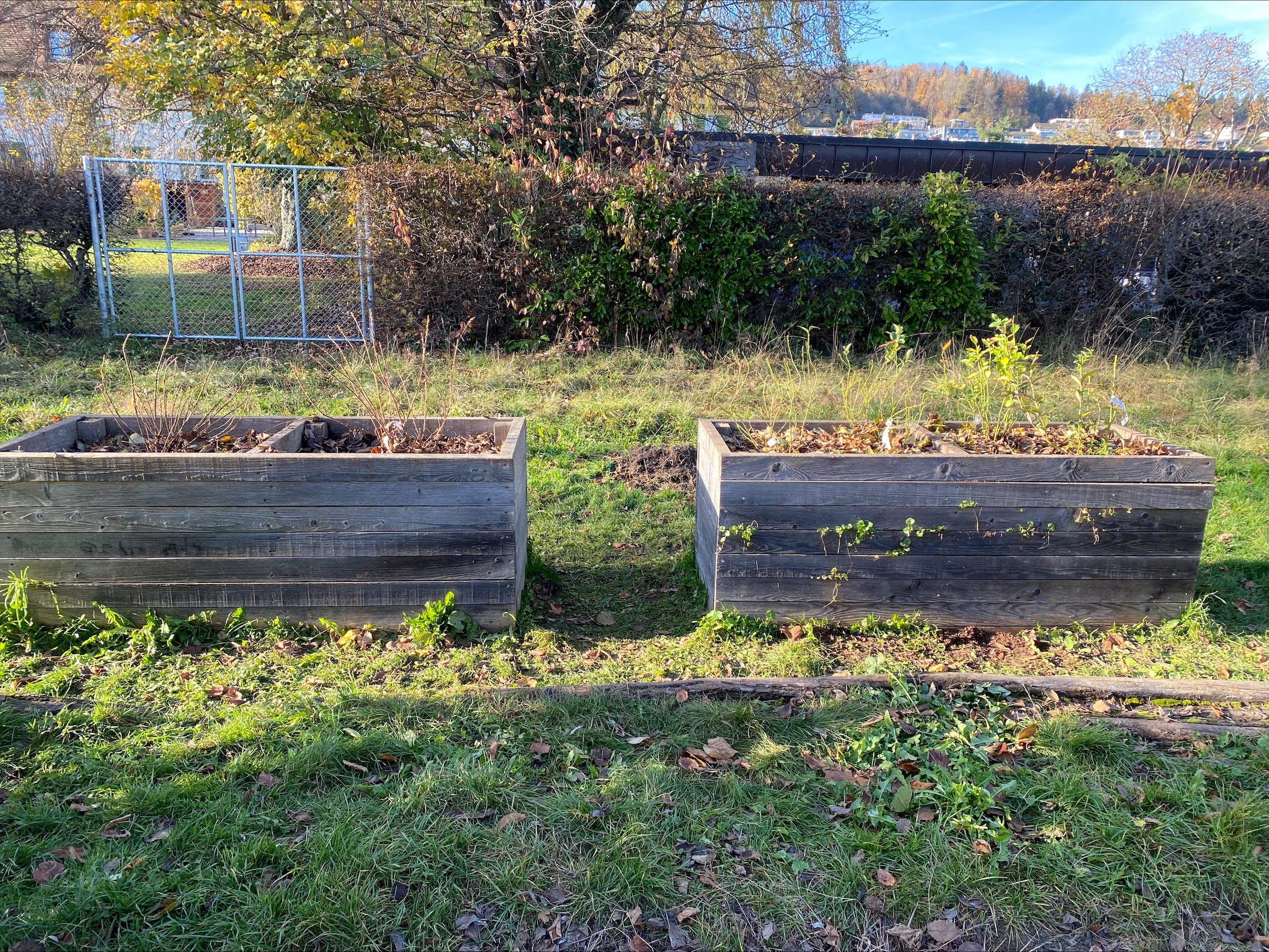 Die erste Klasse hat in den letzten Wochen in beiden Beeten gejätet und neu mit Erde aufgefüllt. In einem Beet haben wir ein Moorbeet angelegt und Heidelbeersträucher gepflanzt. Die Heidelbeeren sind dann im August reif. Im anderen Beet hat es zwei Honigbeersträucher, deren Beeren man im Juni essen kann.