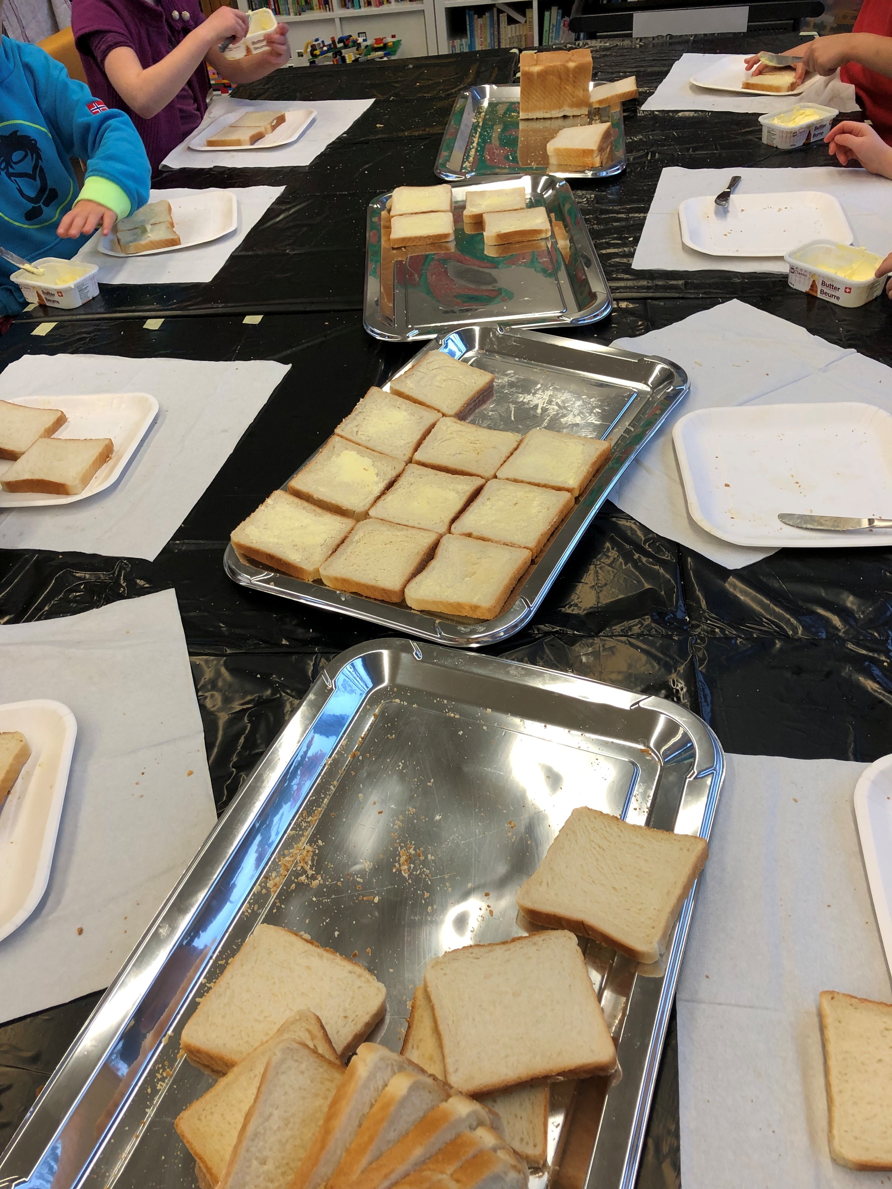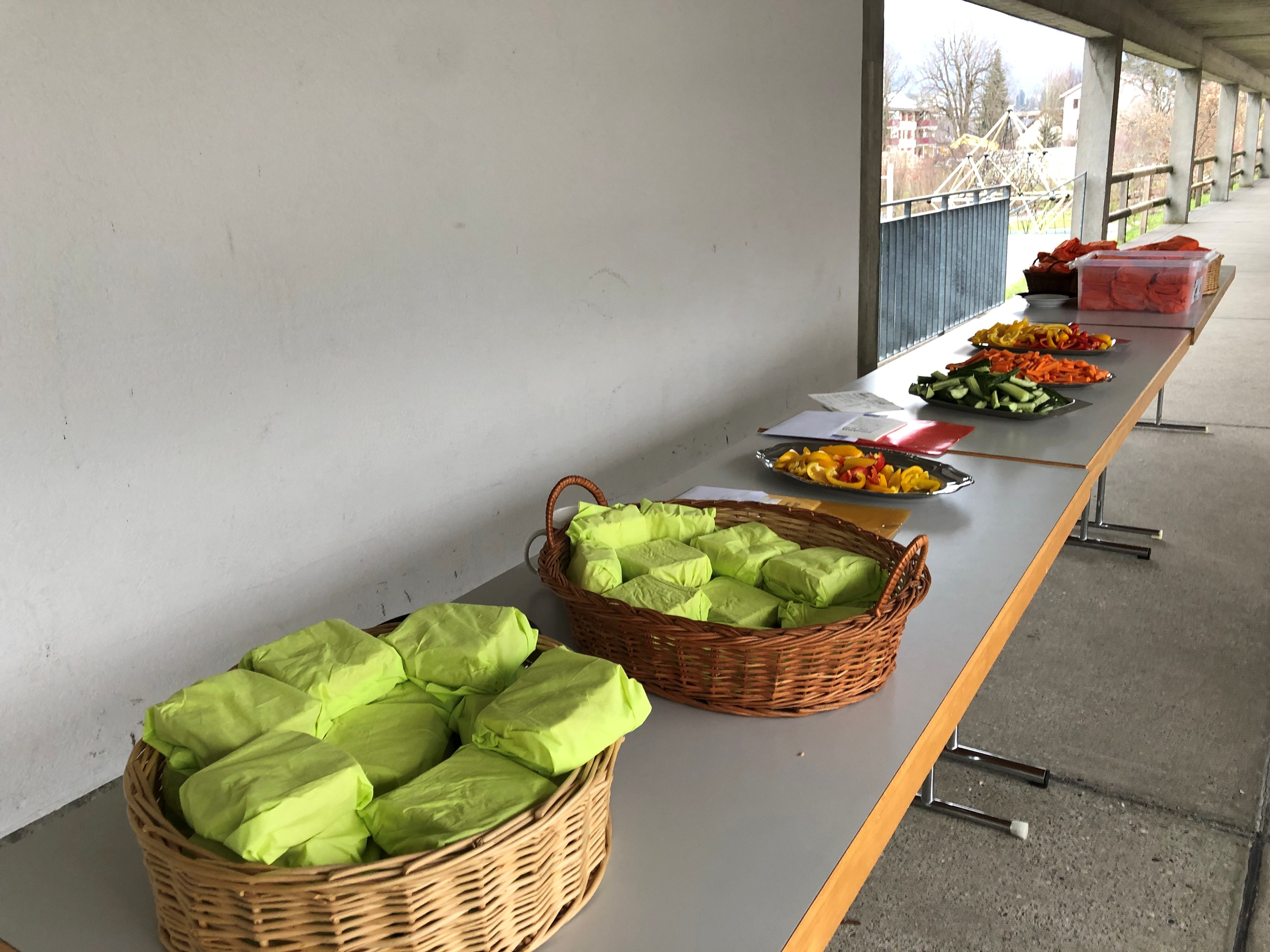 Draussen standen vor der Zehn-Uhr-Pause alle Körbe und Platten bereit. Kaum läutete es, kamen die ersten Kinder mit ihrem Bon angerannt, um ihr bestelltes Sandwich abzuholen. Im Nu leerten sich die Körbe und Platten.