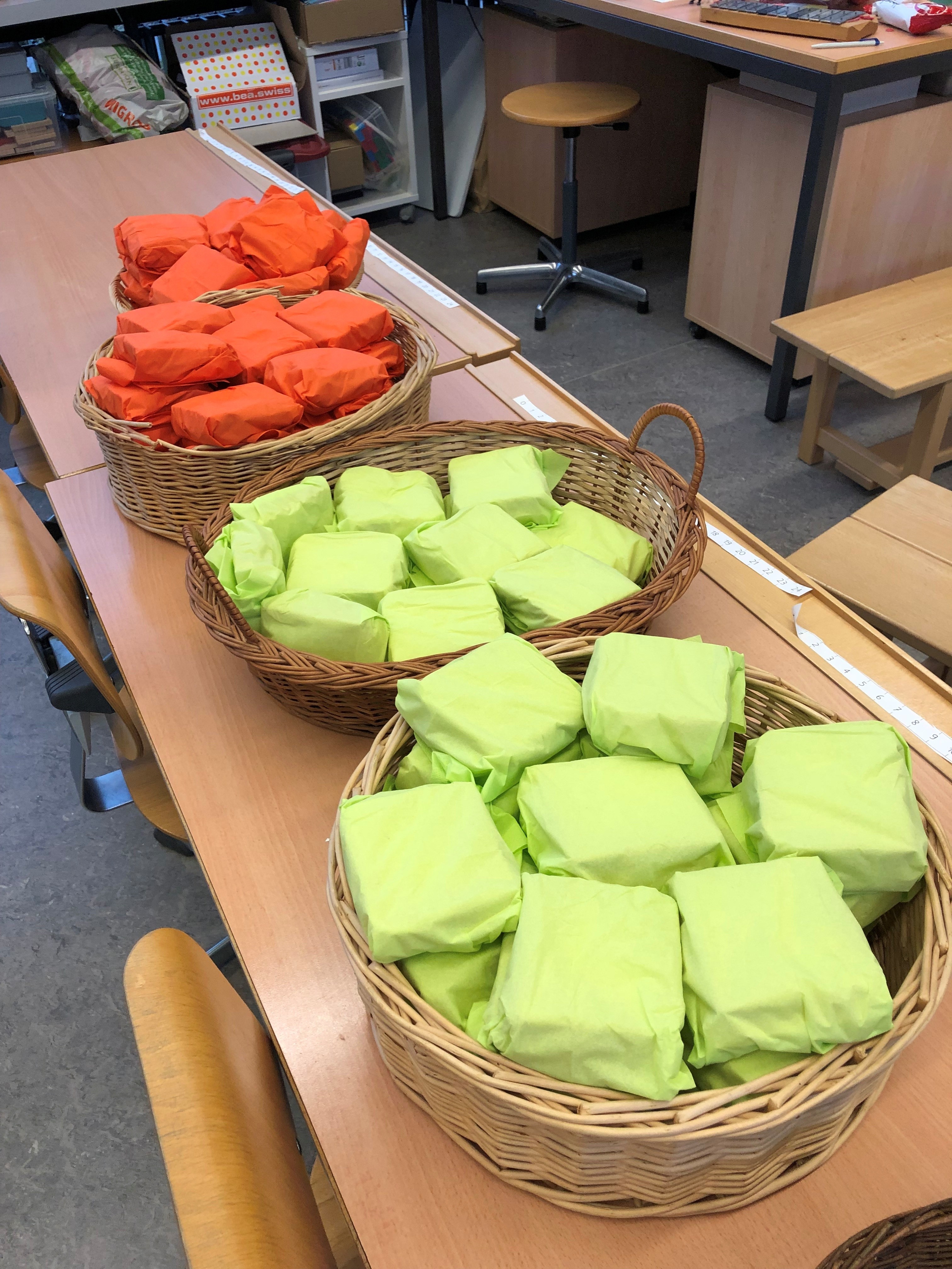 Im Klassenzimmer wurden die Tische so organisiert, dass sie sauber abgedeckt wurden und alle nötigen Gegenstände bereit lagen.