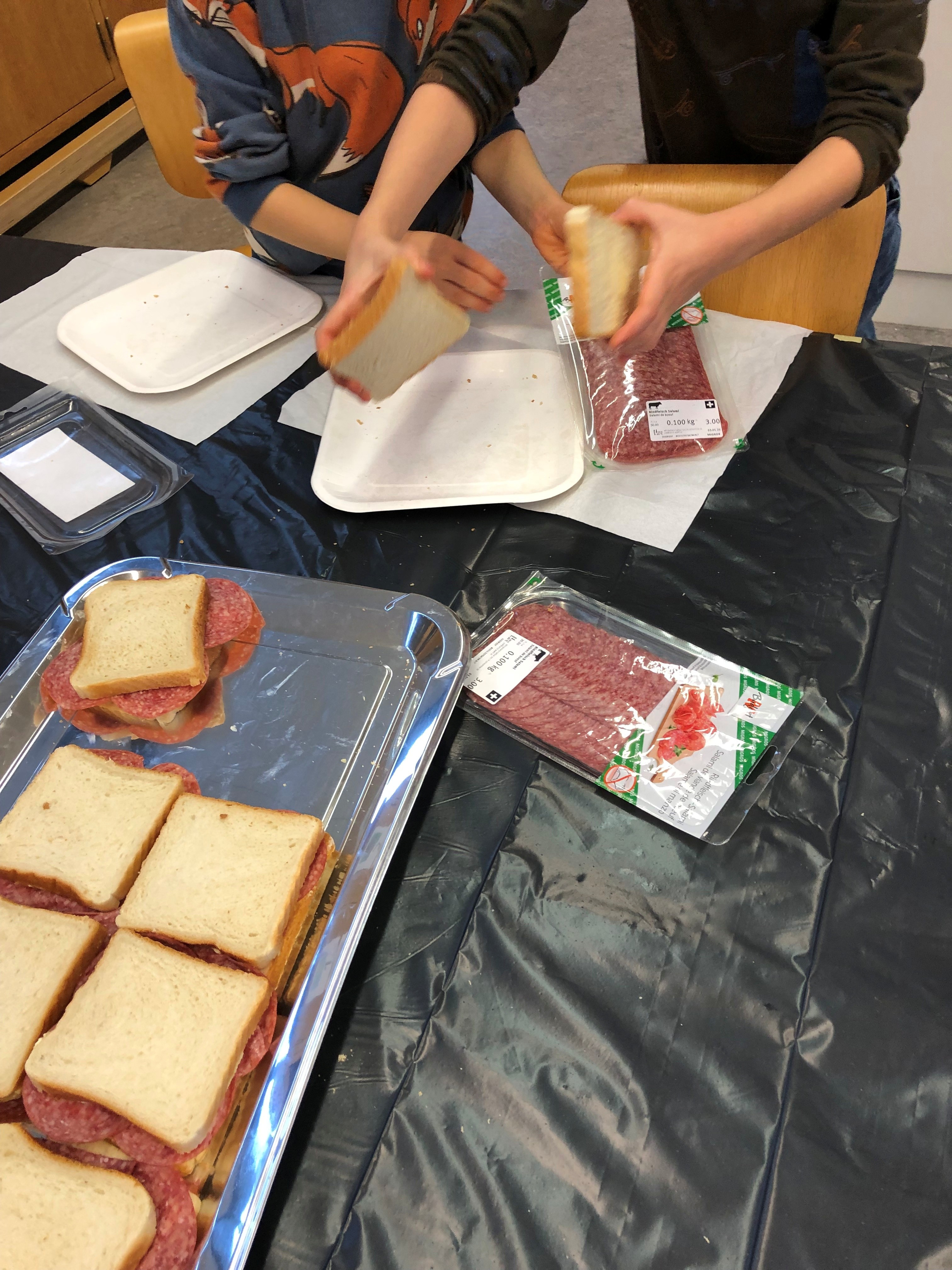 Die Brote wurden in Windeseile mit Butter bestrichen und weiter an das Belege-Team gegeben. Salami oder Käse wurde darauf gelegt. Die fertigen Sandwiches kamen zur Packstation, Salami in orange Servietten und Käse in grüne Servietten.