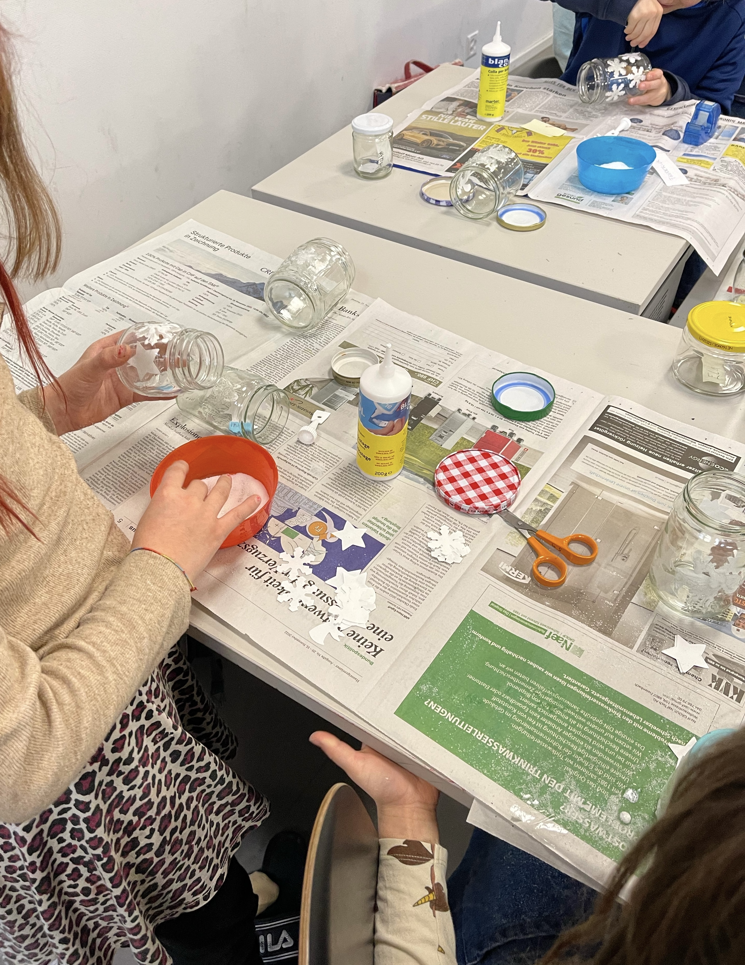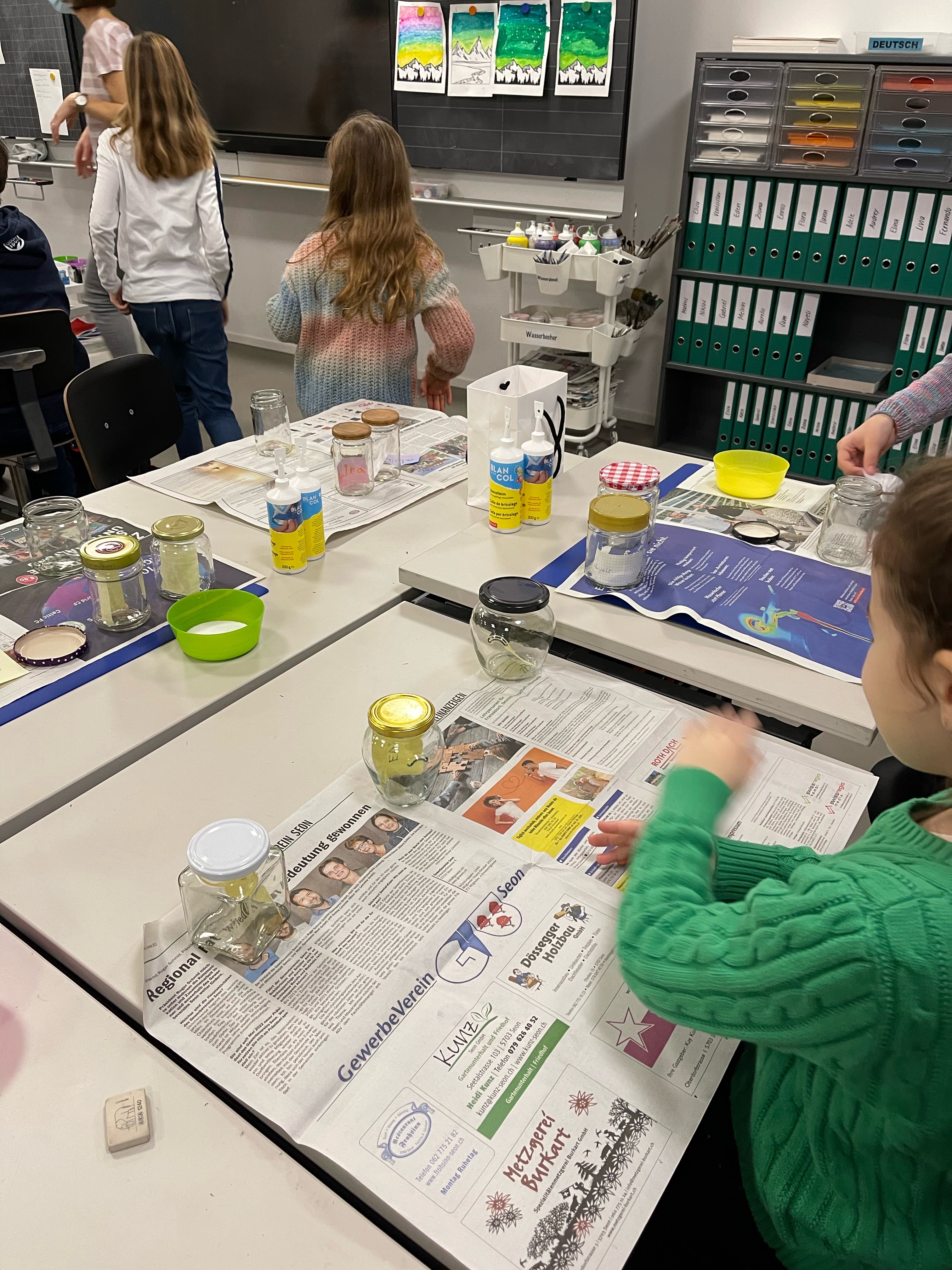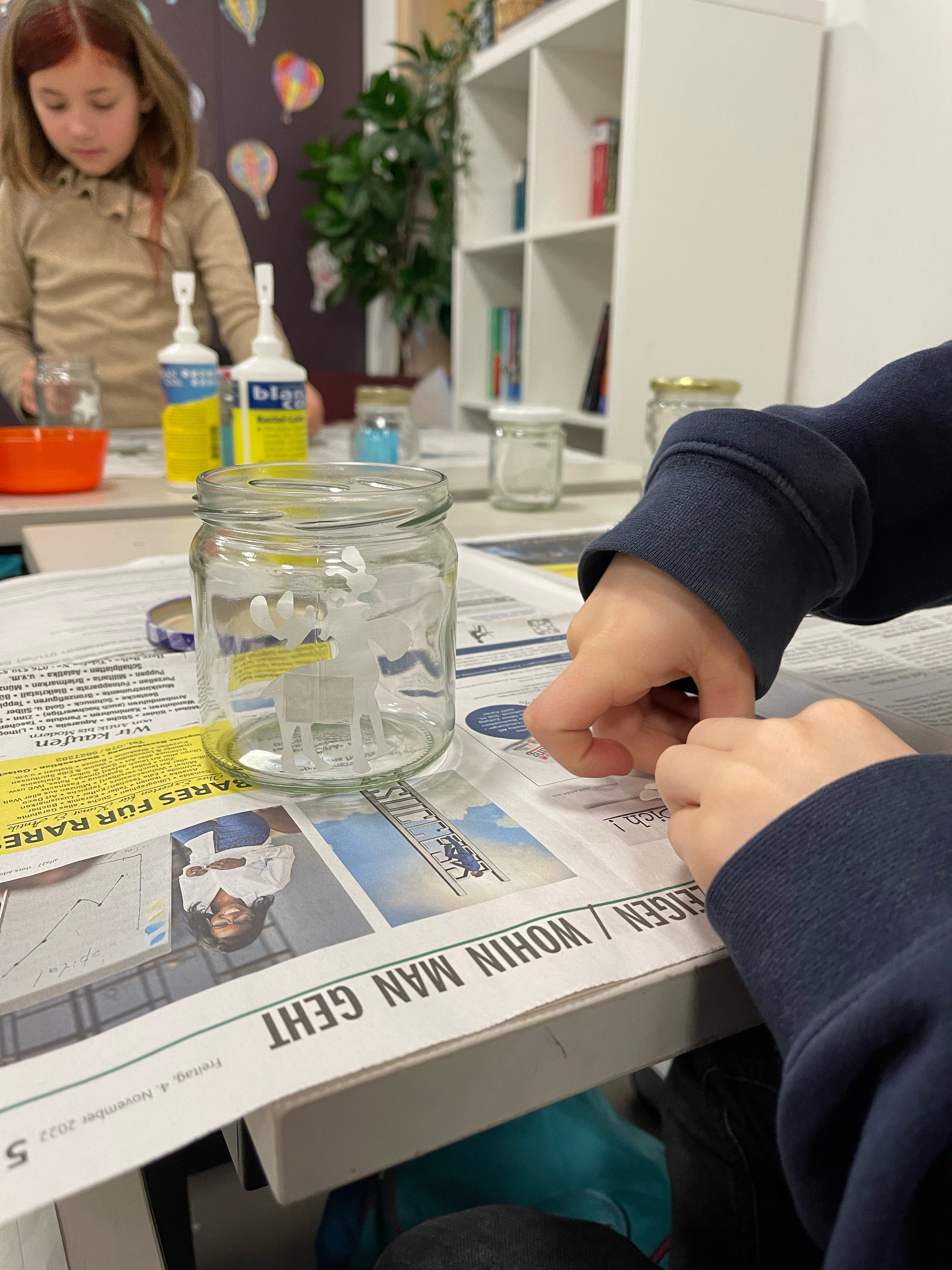 Für die beiden Klassen 1b und 4b war der Mittwochmorgen vor den Weihnachtsferien ein absolutes Highlight! In den Halbklassen aufgeteilt, stellten die Kinder Zuckergläser her, die als stimmungsvolle Windlichter genutzt werden können. Die Stimmung in den Klassenzimmern war magisch, im Hintergrund wurden leise Weihnachtslieder abgespielt. Die Kinder arbeiteten konzentriert und halfen einander. Ein wirklich gelungener Bastelmorgen in der letzten Schulwoche!