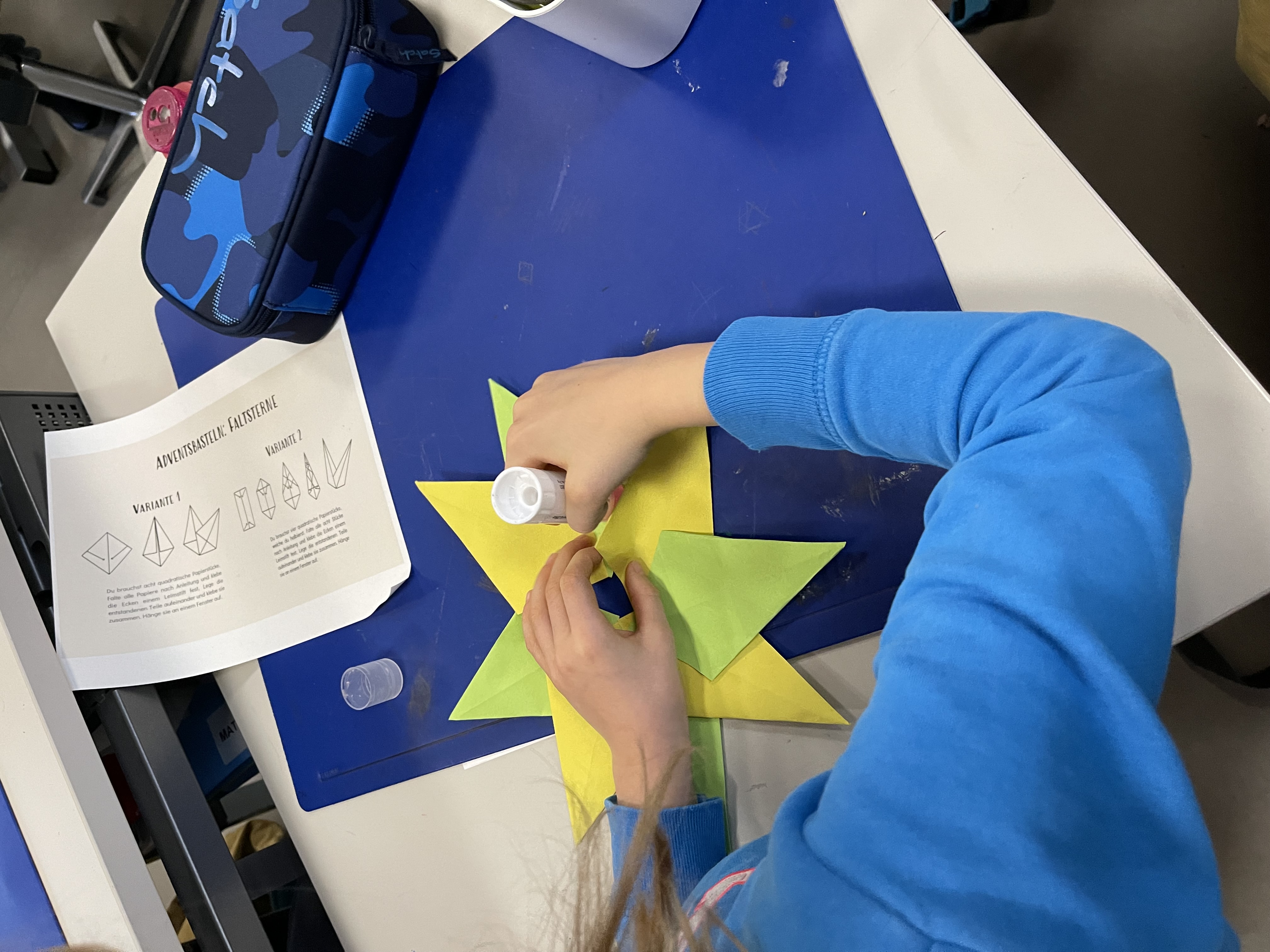 Am letzten Dienstag vor den lang ersehnten Weihnachtsferien trafen sich die beiden Schulklassen 2b und 5b um gemeinsam einen weihnachtlichen Morgen zu verbringen. Beide Klassen wurden in zwei Gruppen unterteilt und verbrachten je eine Lektion damit Weihnachtssterne zu Basteln und Gesellschaftsspiele zu spielen.