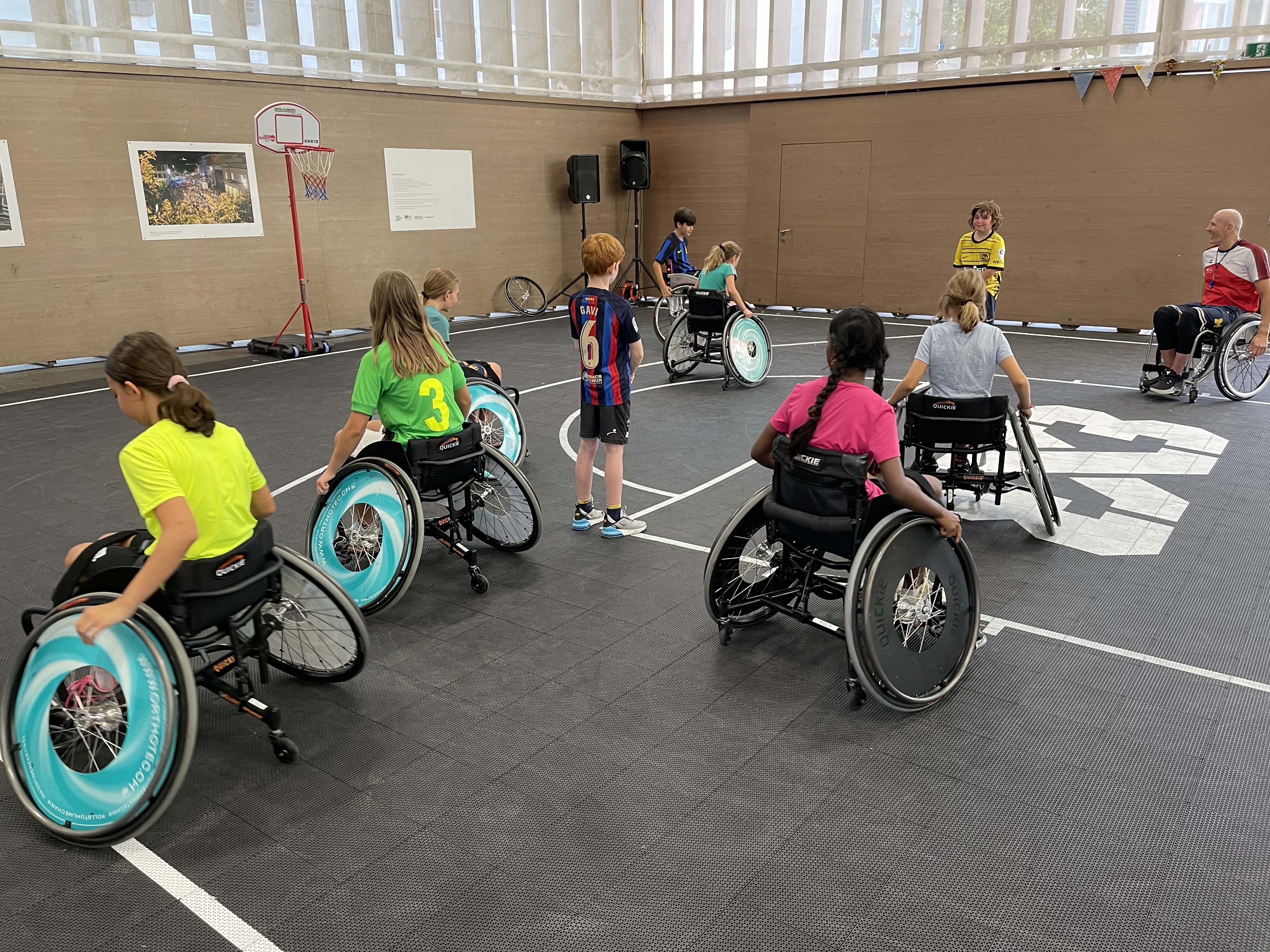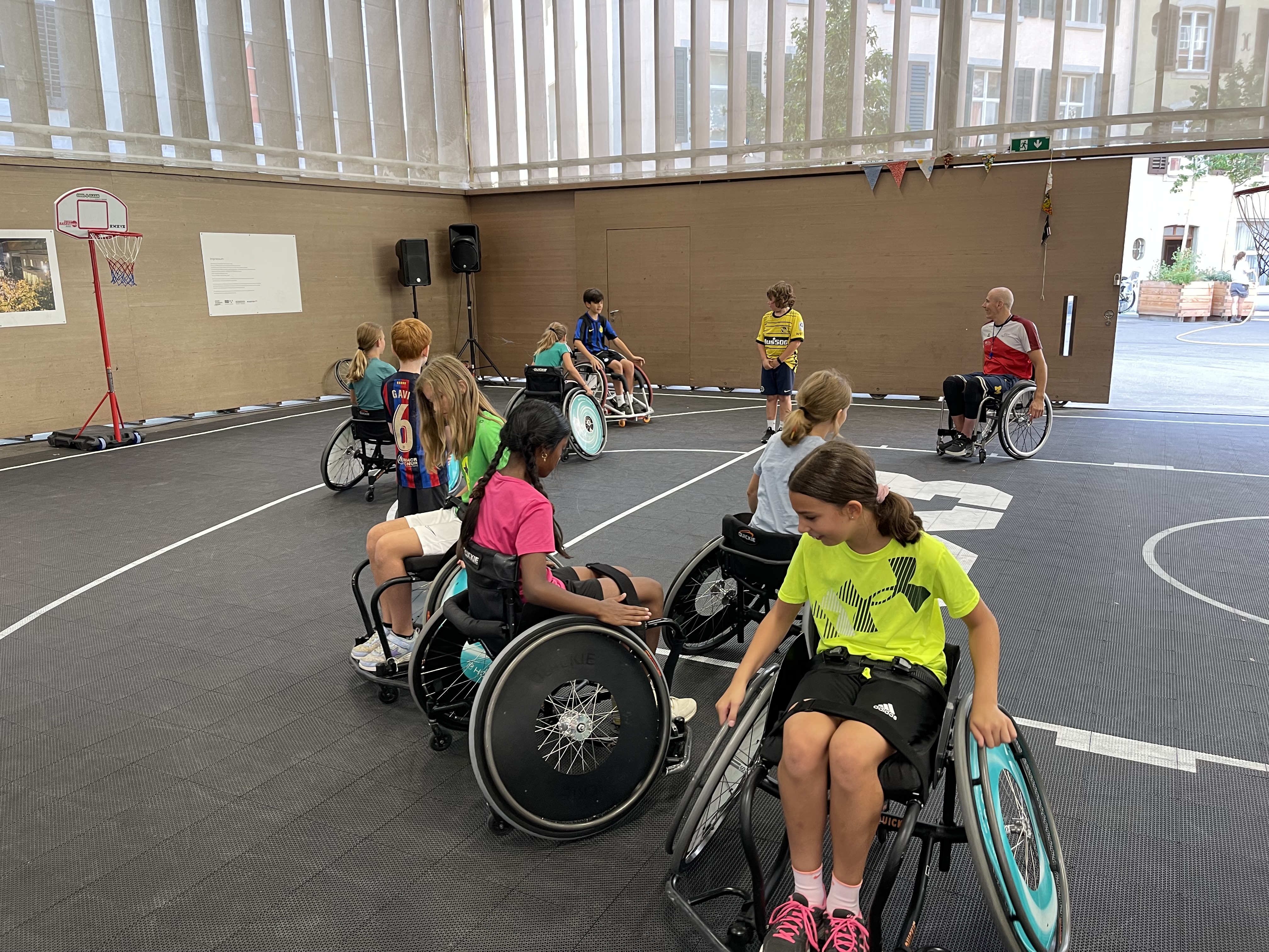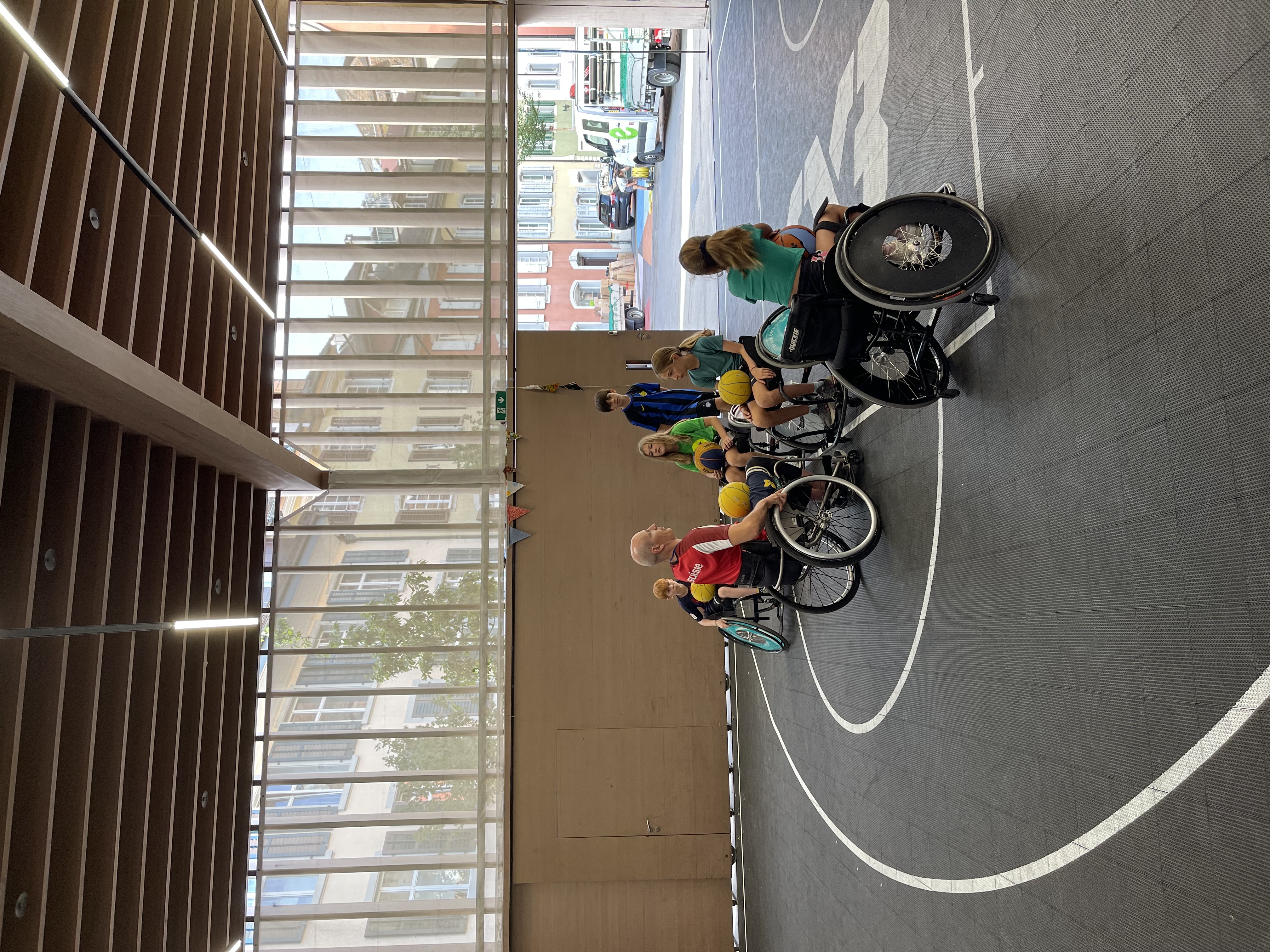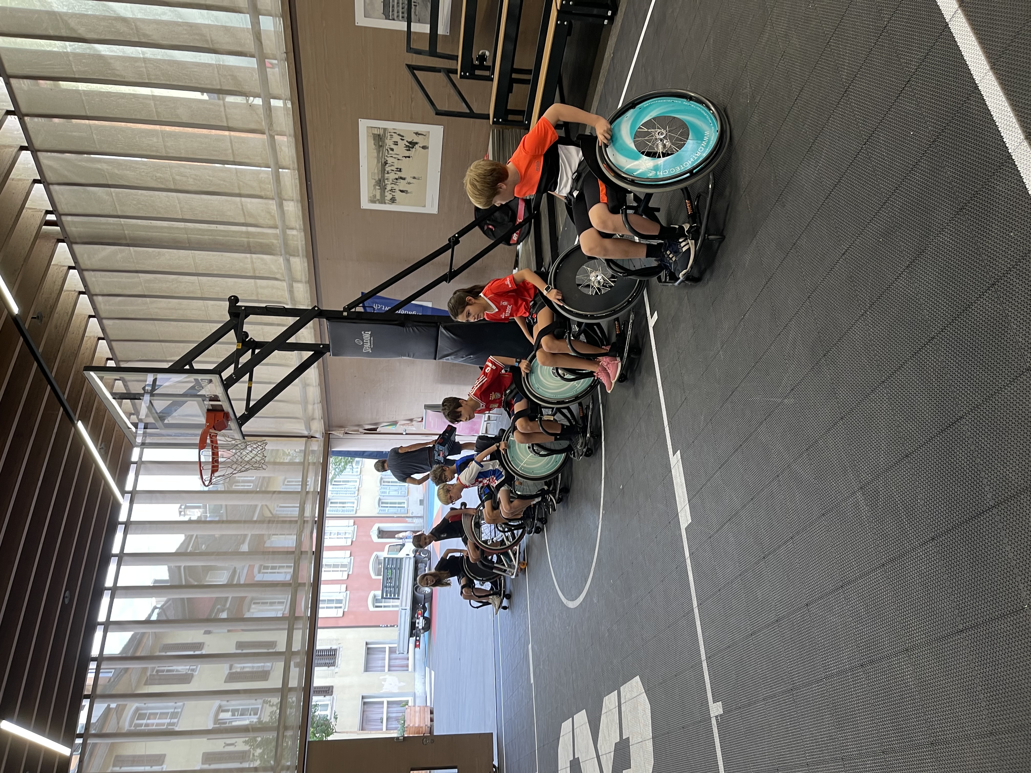 Vor Ort wurden die Kinder in zwei Gruppen aufgeteilt. Mit Mike Bhend machten die Kinder einige Übungen und spielten schlussendlich auch gegeneinander Basketball. Nicolas Hausammann zeigte den Kindern, wie im Rollstuhl Basketball gespielt wird. Er brachte Ihnen die wichtigsten Spielregeln bei, sagte aber auch, dass die Regeln für Rollstuhlbasketball nur geringfügig von den regulären Basketballregeln abweichen. Auch im Rollstuhl durften sich die Kinder am Schluss in einem Spiel versuchen.