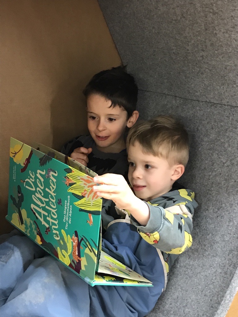 Am Dienstag besuchte der Kindergarten die Schulbibliothek im Gönhardschulhaus. Die Bibliothek wurde gemeinsam erkundet. In Zweiergruppen stöberten die Kinder nach spannenden Bücher und schauten sie gemeinsam an. Die Kinder hätten am liebsten ganz viele Bücher ausgeliehen und nach Hause genommen. Die Freude auf einen nächsten Besuch ist gelegt.