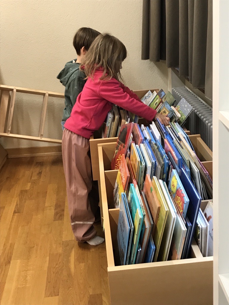 Das Thema in der Projektwoche im Kindergarten Goldern 2 war “Die Bibliothek”. Anfangs Woche durfte jedes Kind ein Bilderbuch in den Kindergarten mitbringen. Im Kindergarten wurde eine kleine “Ausleihbibliothek” eingerichtet. So konnten die Kinder Bücher jeweils für einen Tag und eine Nacht von einem anderen Kind ausleihen. Jedes Kind hatte seine persönliche Ausleihkarte.