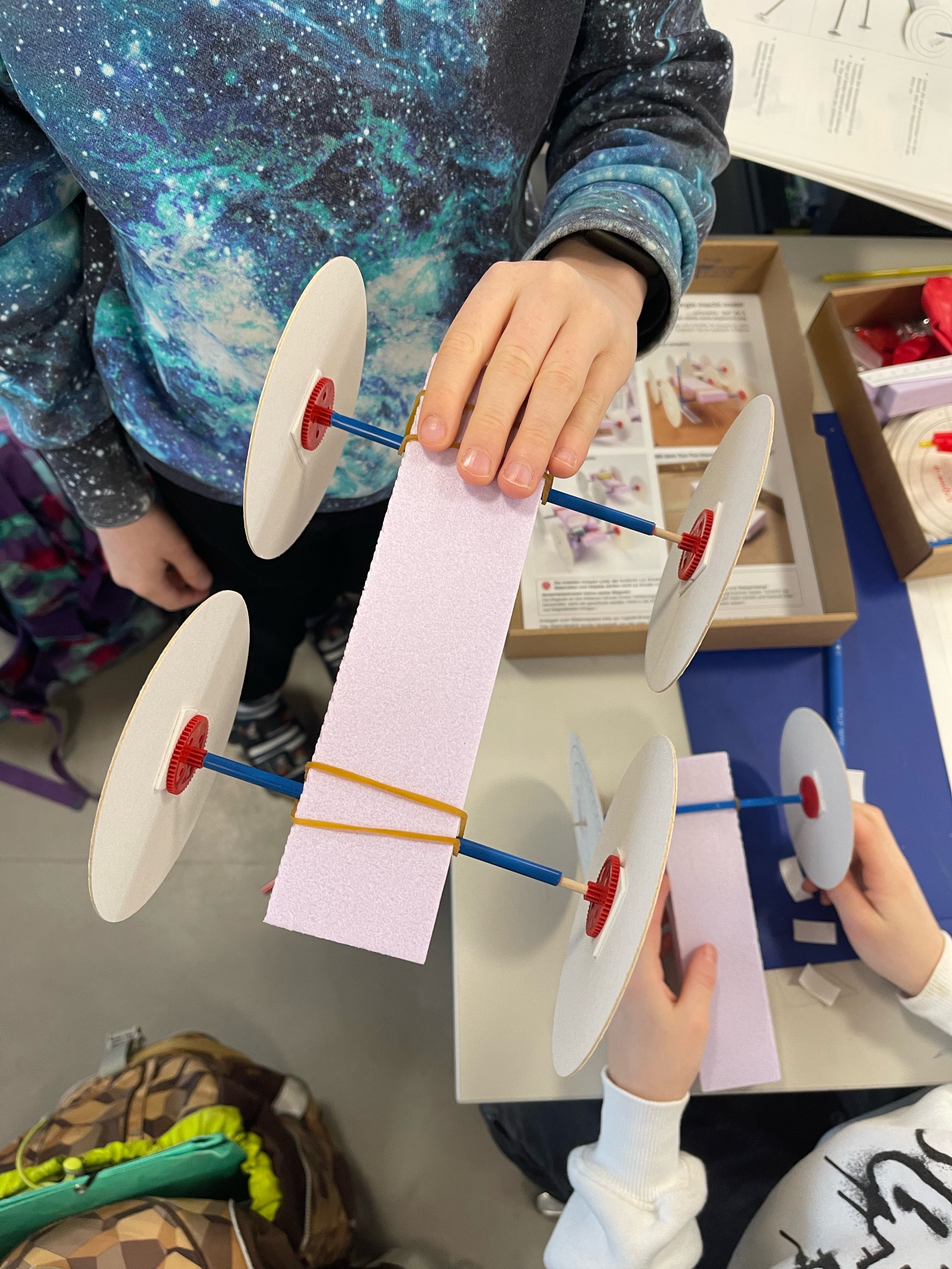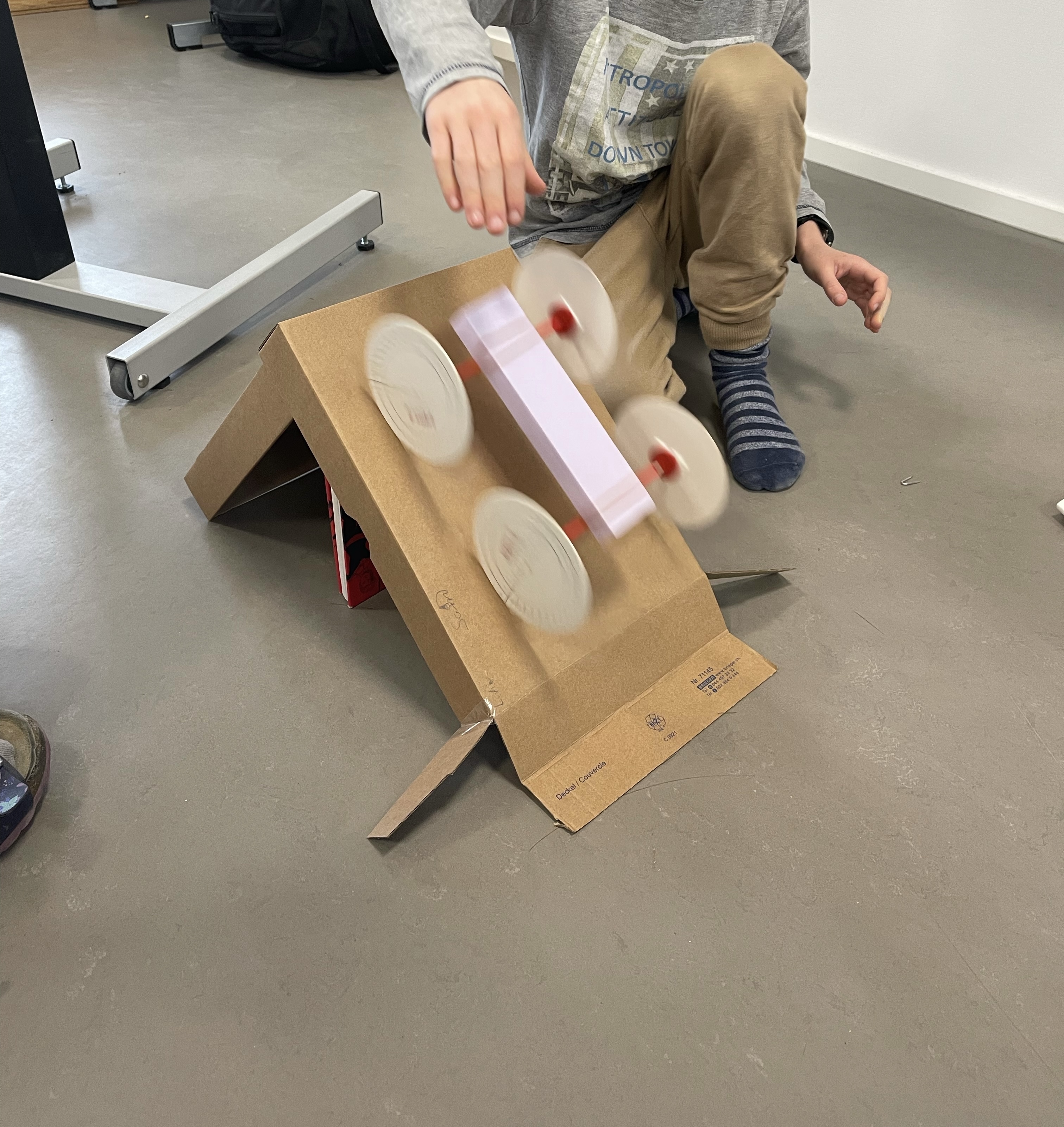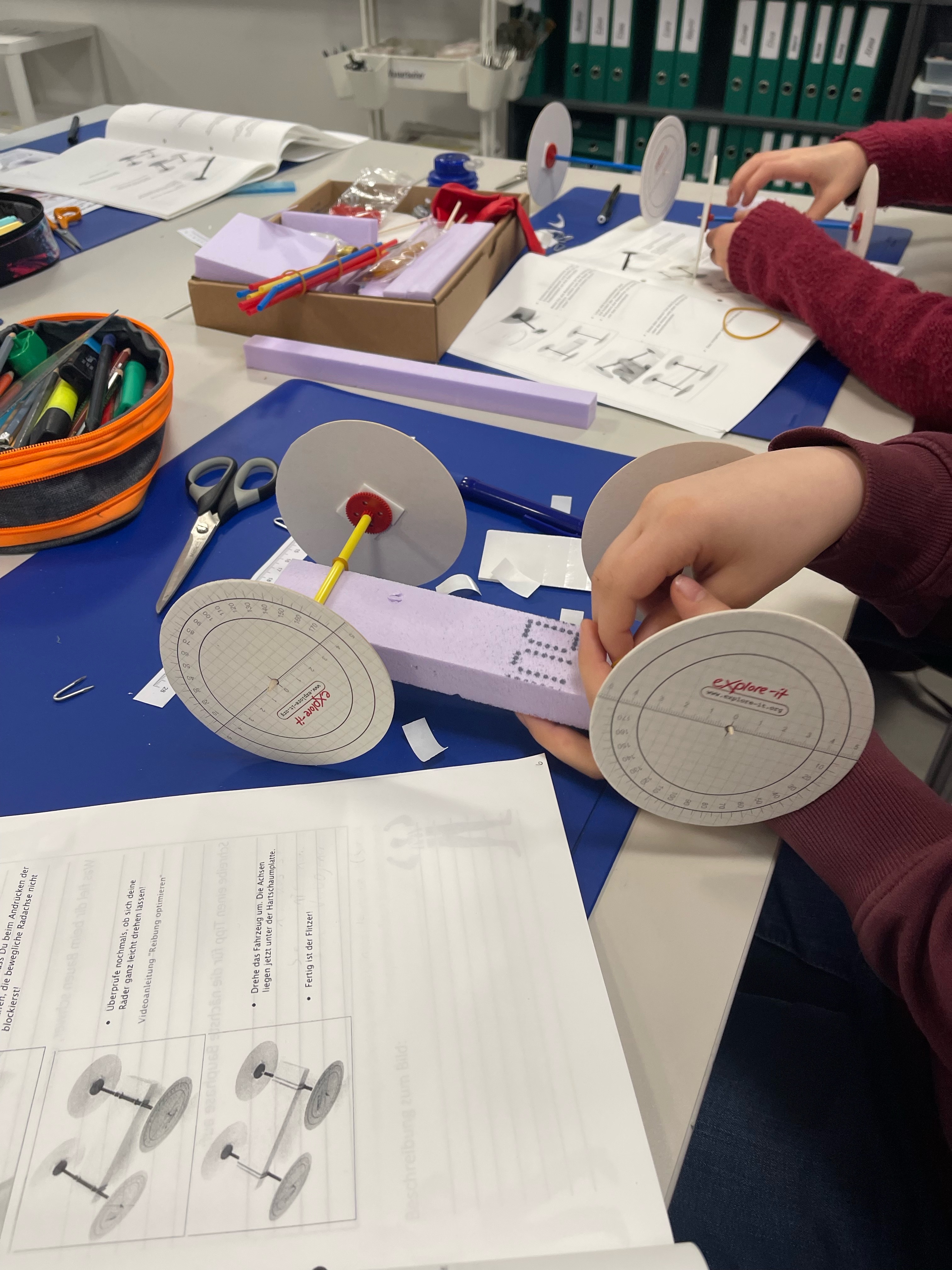 Im Vordergrund steht dabei die Arbeit am eigenen Fahrzeug in Zweiergruppen. Die Kinder bauen ihre Fahrzeuge anhand einer detaillierten Anleitung selbstständig. Jede Bauphase wird im Arbeitsdossier reflektiert: Was war einfach? Was war schwierig? Was wäre mein Tipp an jemanden, der dieses Fahrzeug baut? Sind diese Fragen beantwortet geht es weiter mit den Experimenten. Die Flitzer rasen eine Rampe hinunter, werden spicken gelassen oder fahren gar selbstständig mit Hilfe eines eigenhändig gebauten Antriebs. Die gewonnenen Daten werden notiert und abschliessend diskutiert.
