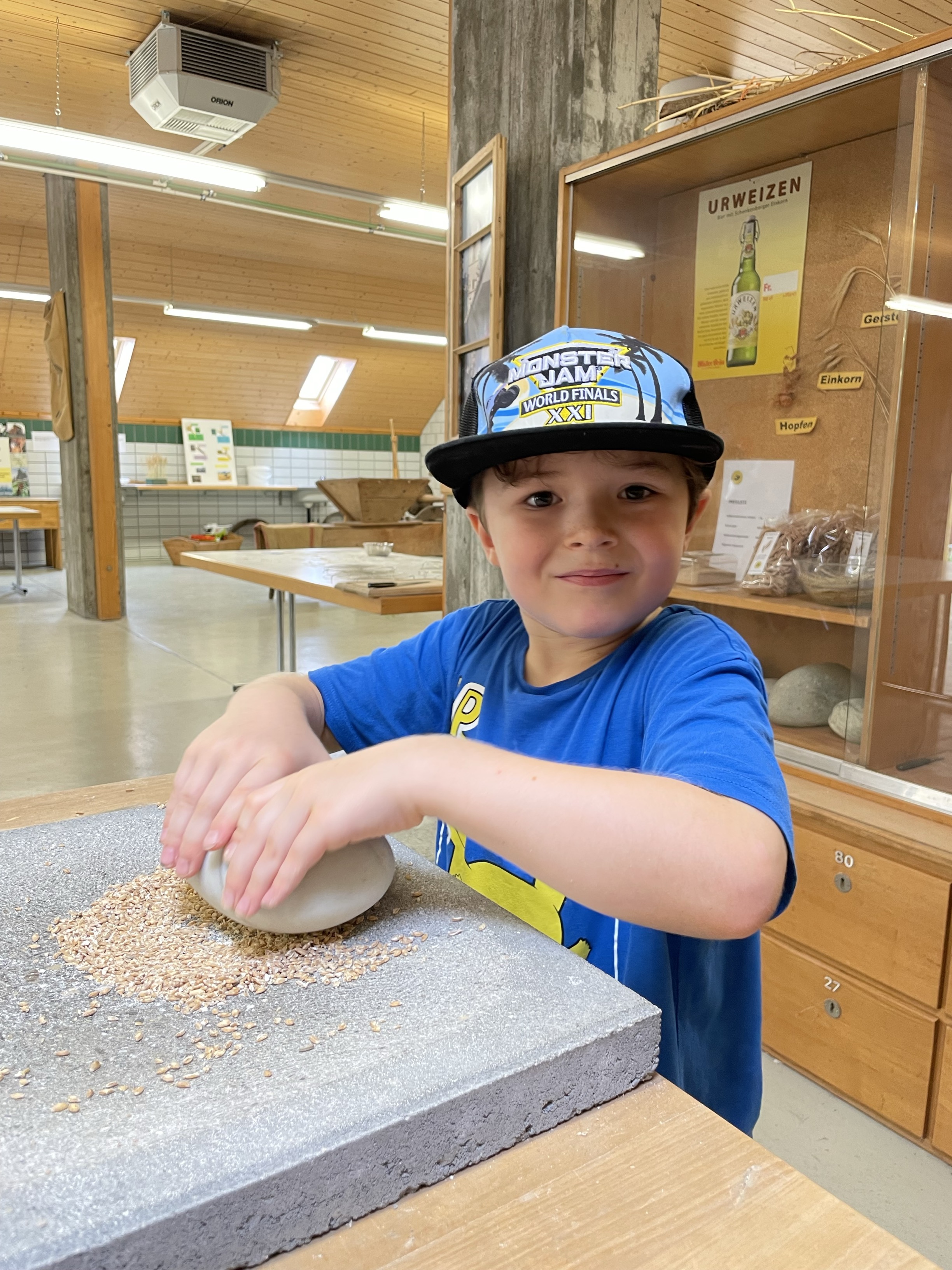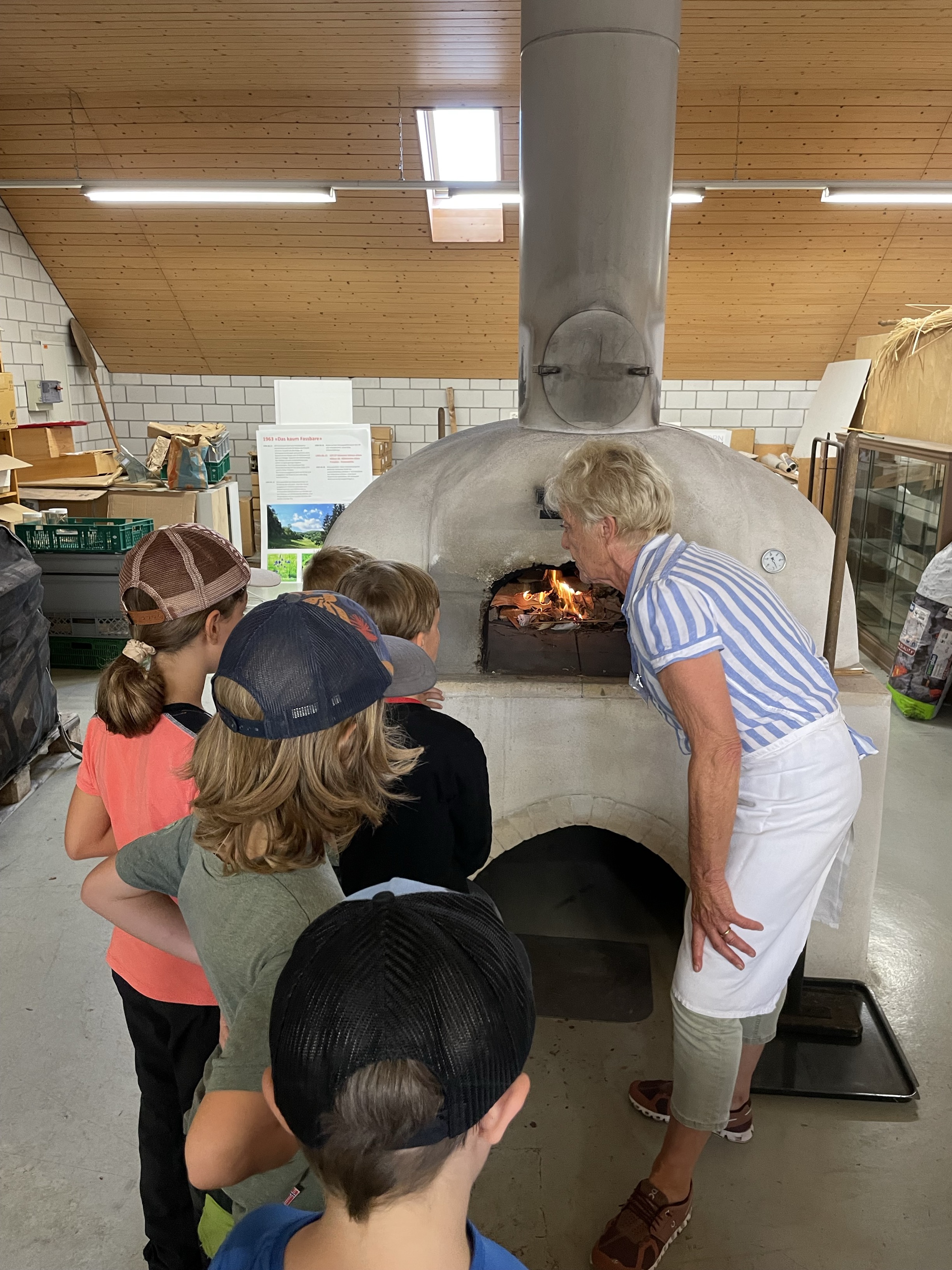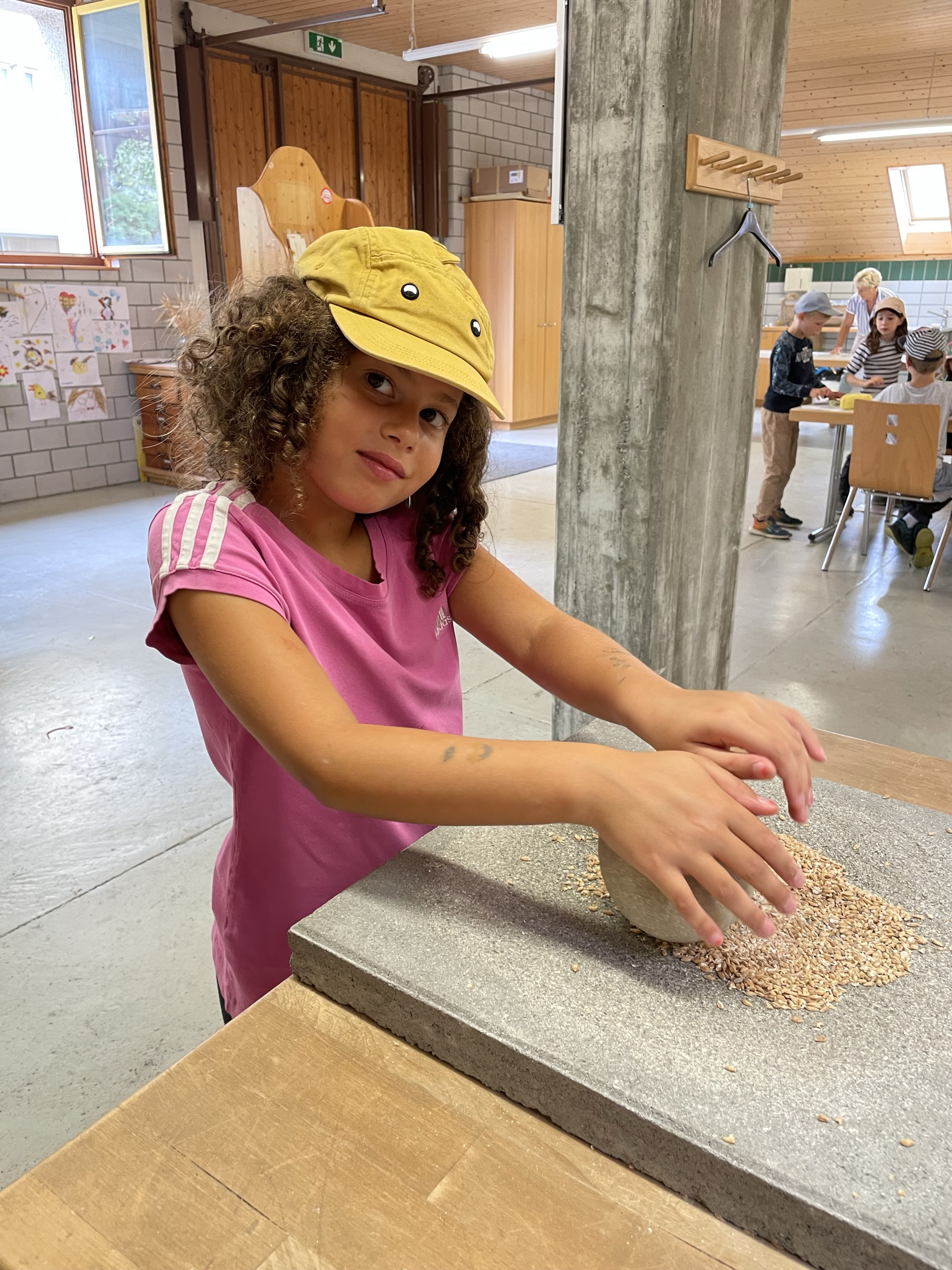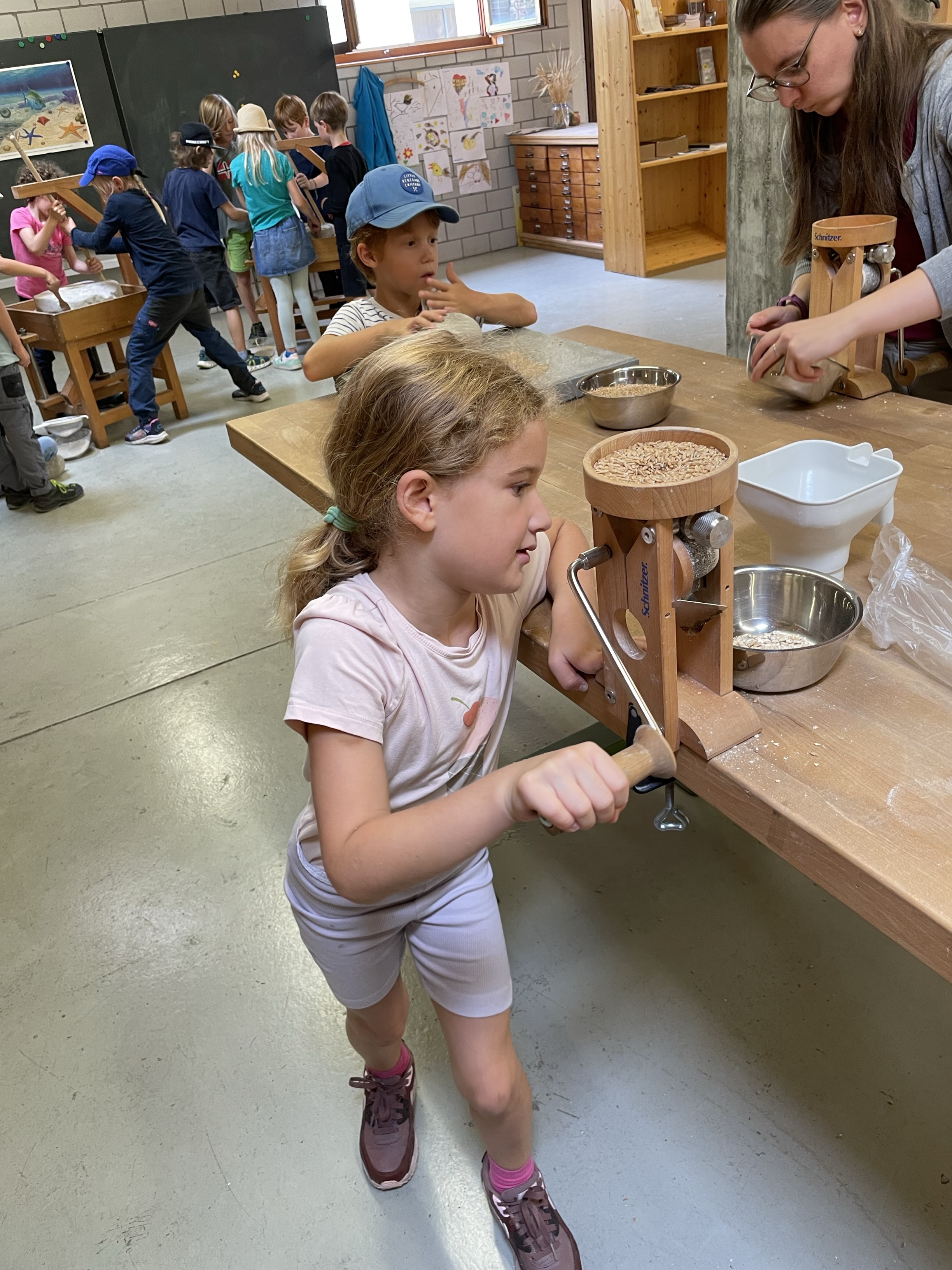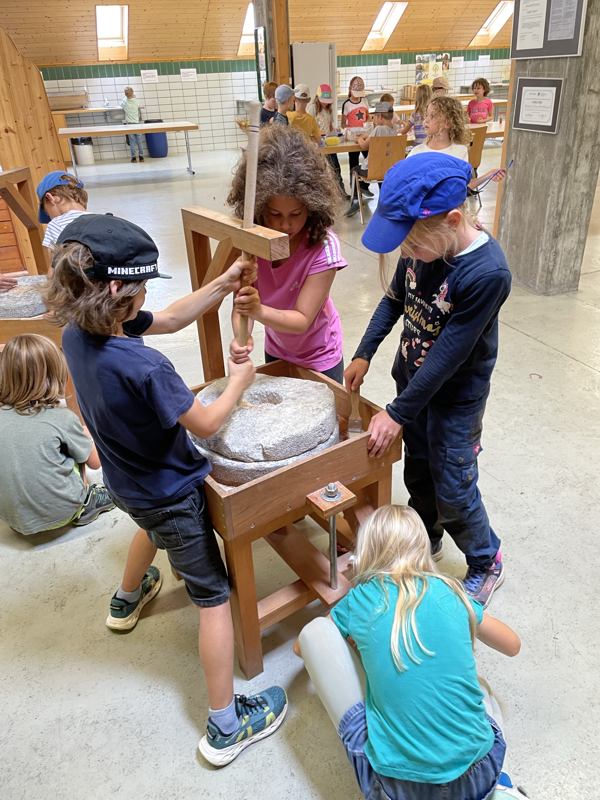 Die Schülerinnen und Schüler erlebten hautnah den Weg vom Korn zum fertigen Brot. Zuerst heizten sie in der Emmerstube den mächtigen Holzofen ein. Dann erfuhren sie, wie viel Arbeit nötig ist, um mit historischen Techniken, wie Reibstein und Kastenmühle, Korn selber zu mahlen und zu sieben. Das Herstellen des Teiges und das Kneten und Formen war sehr lustbetont und machte grossen Spass.