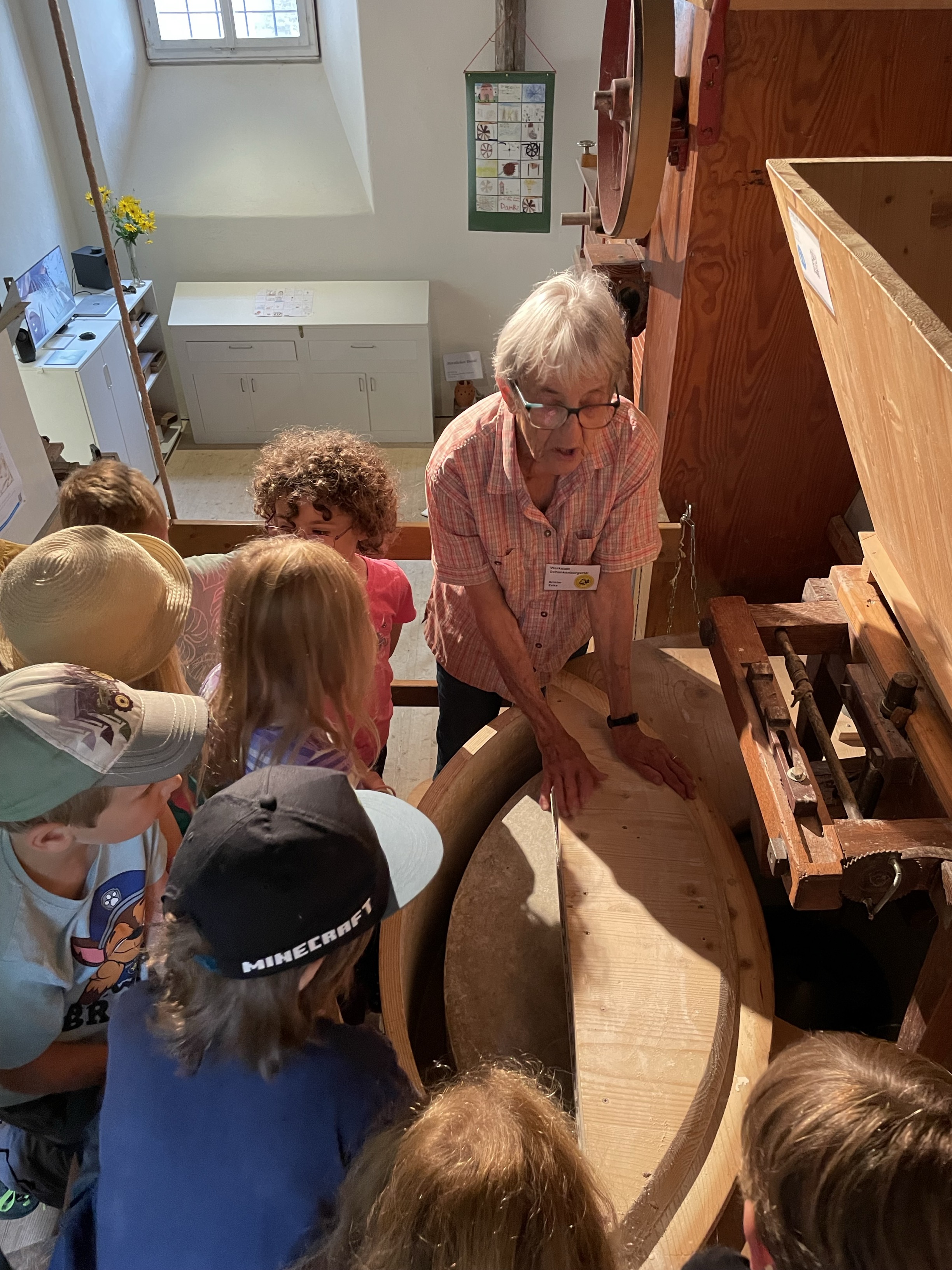 In der Wartezeit zwischen der Teigherstellung und dem Backen besichtigten die Schülerinnen und Schüler die alte Mühle mit dem Wasserrad, dem mächtigen Getriebe und den schweren Mahlsteinen.
