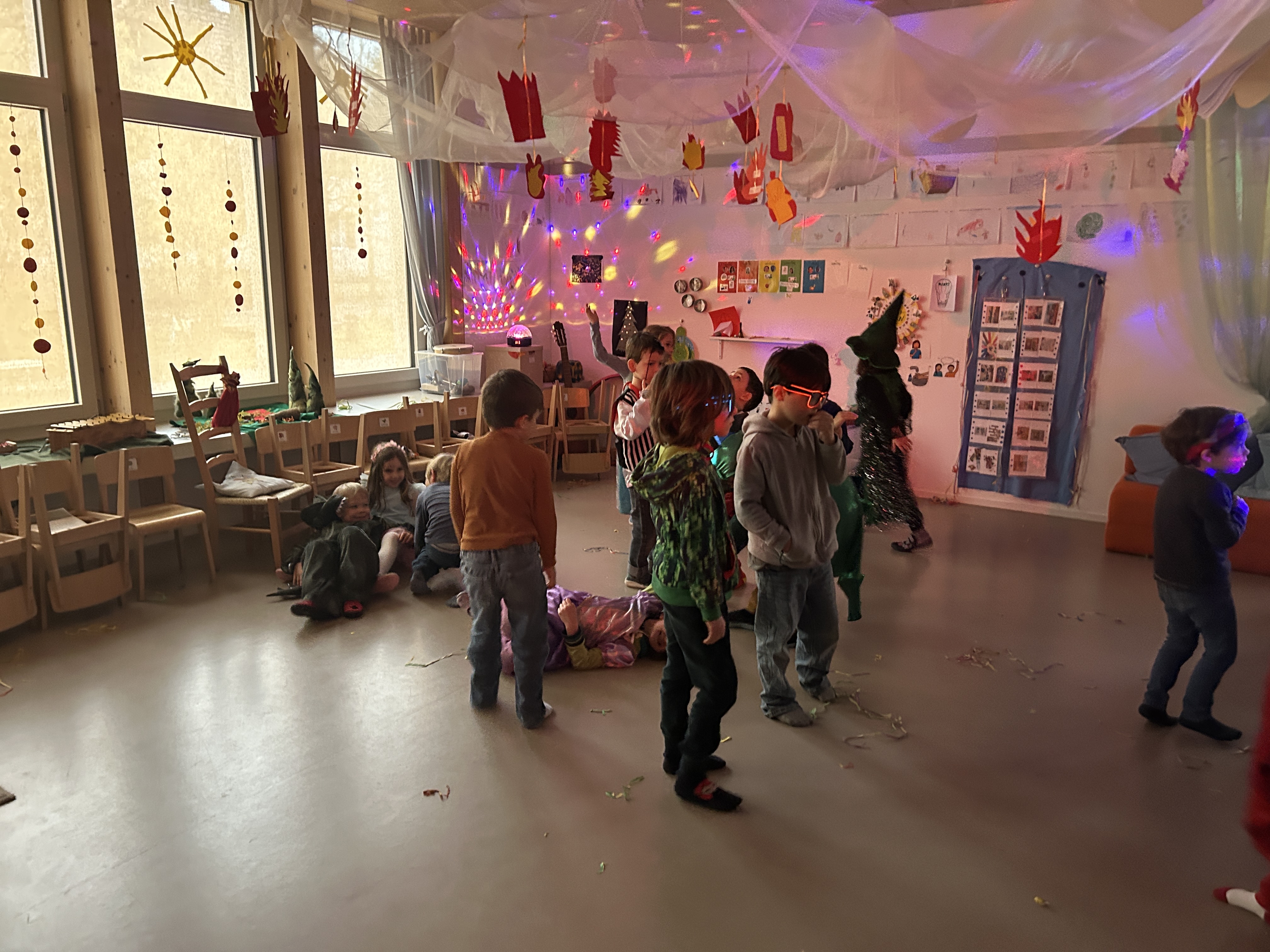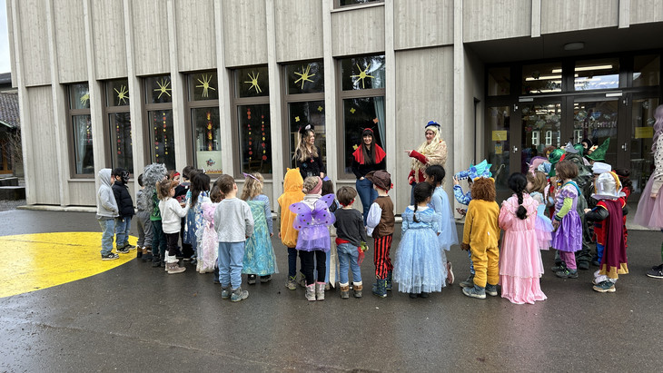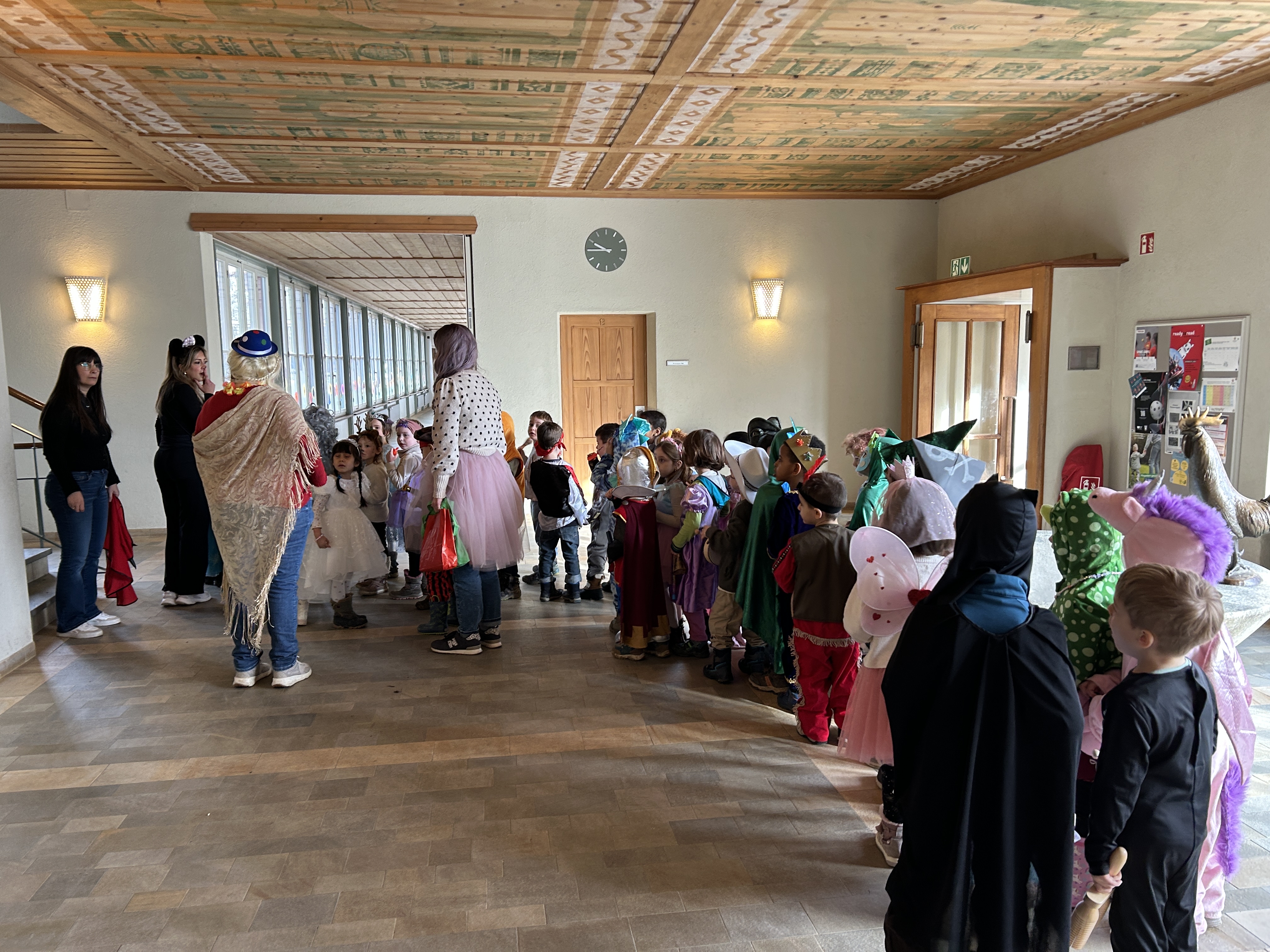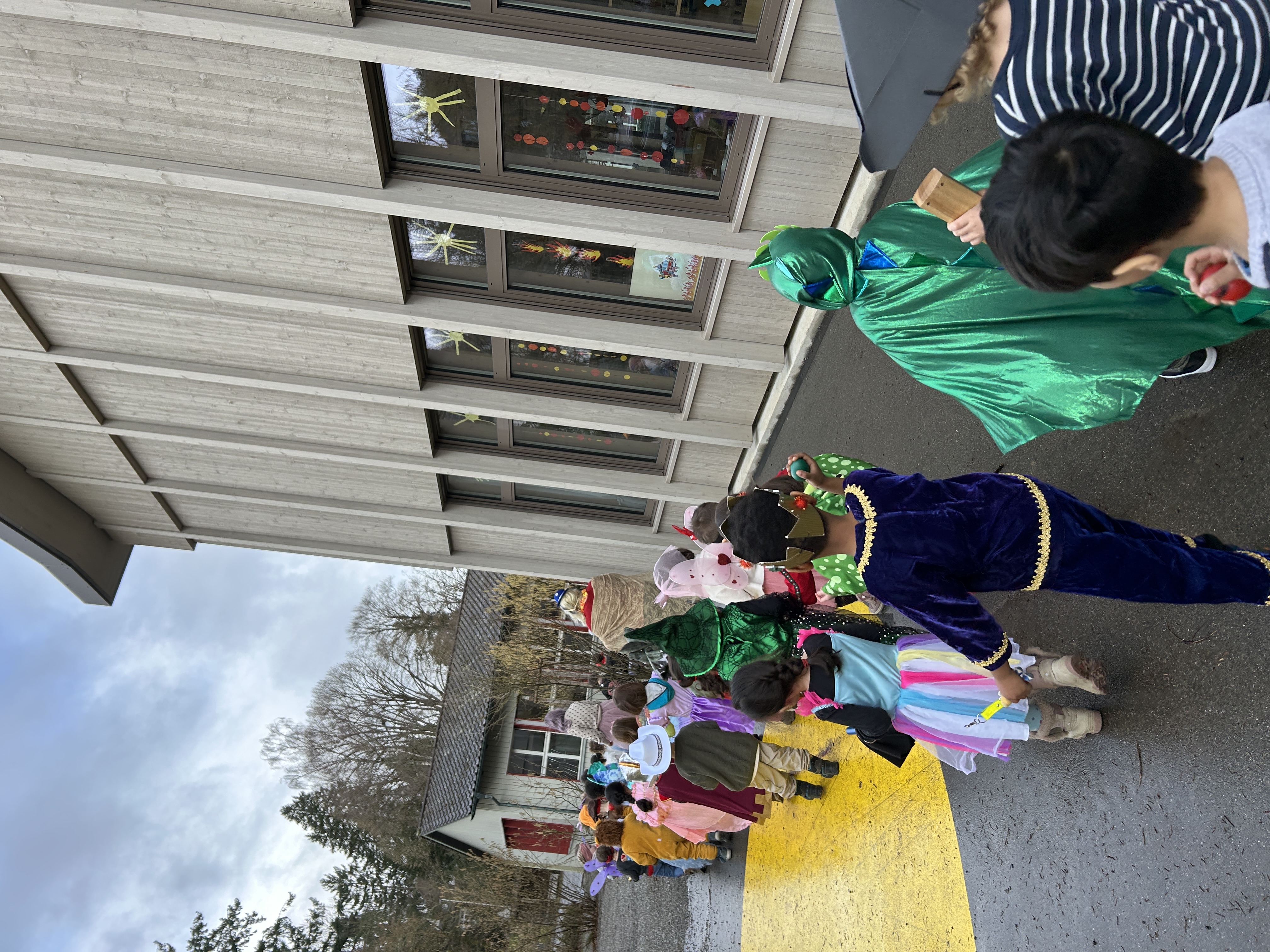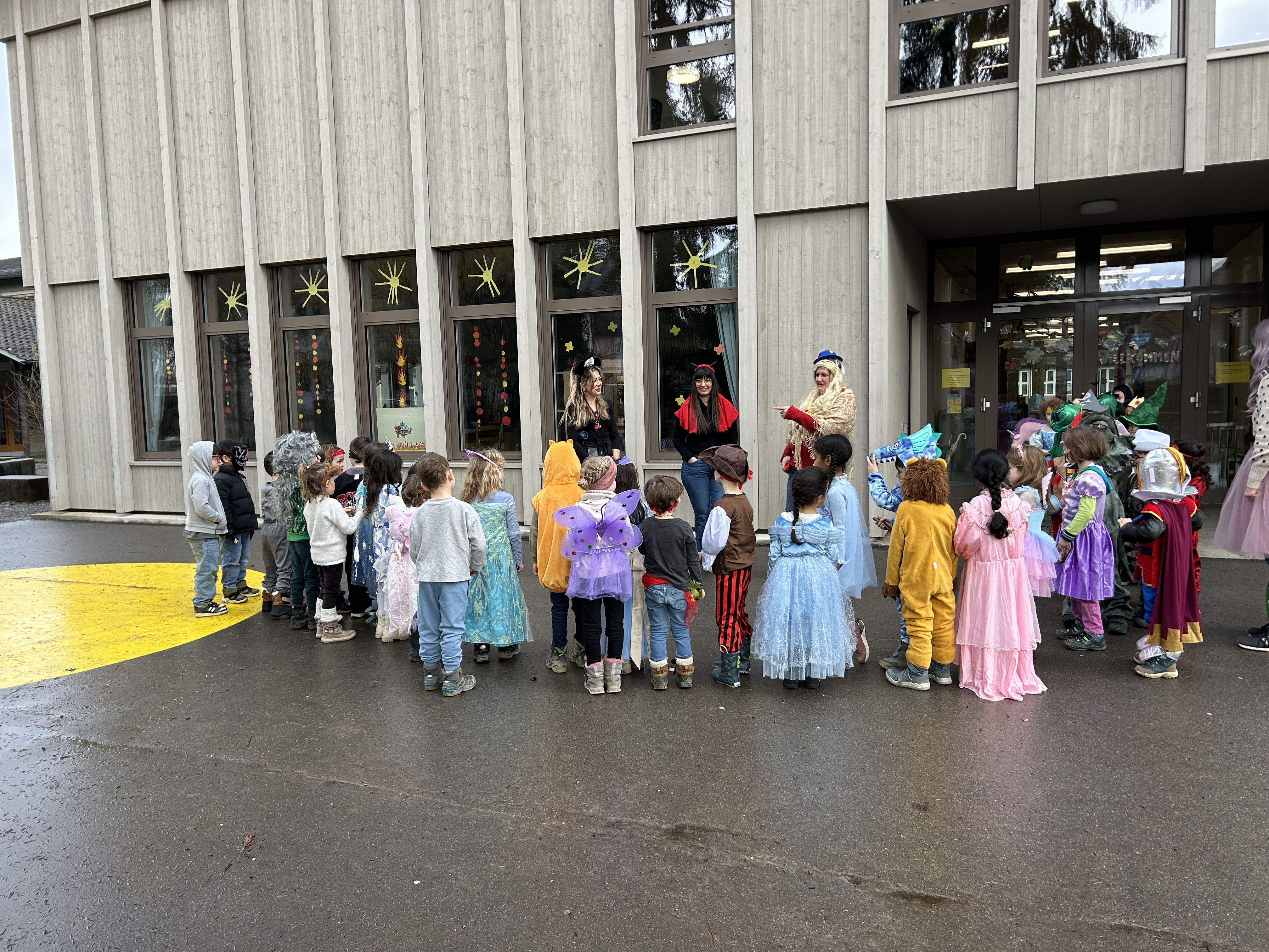 Am 20. Februar 2026 war es so weit: eine muntere Kinderschar trudelte im Kindergarten ein, teils verkleidet, andere suchten sich noch etwas im Kindergarten aus zum Verkleiden und liessen sich schminken. Popcorn wurde von ein paar Kindern gemacht, Sirup und Fasnachtschüechli bereit gestellt für das Znüni, Luftschlangen aufgehängt. Dann gingen beide Kindergärten zusammen auf den Umzug durchs Schulhaus.