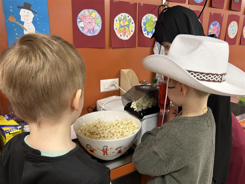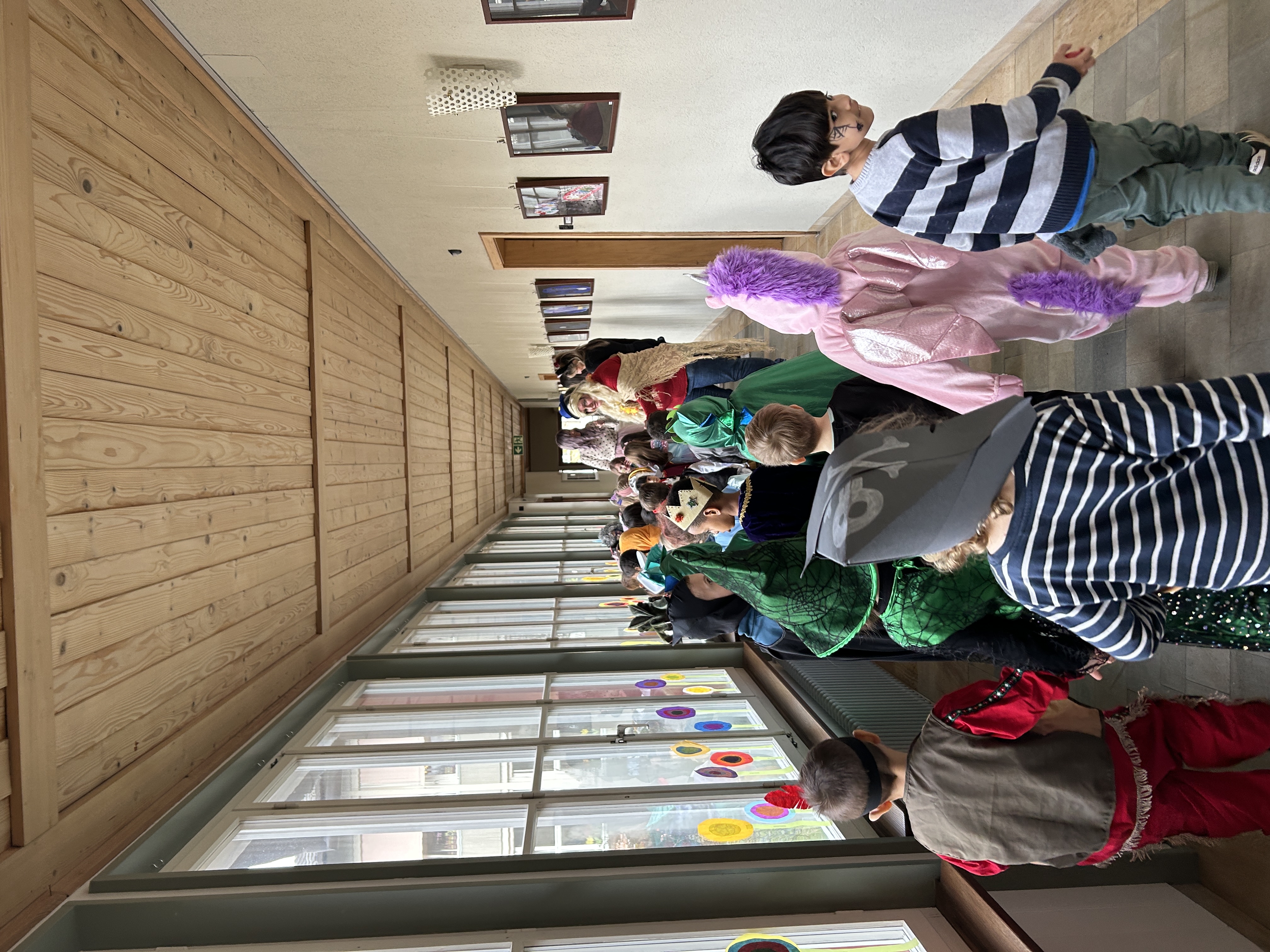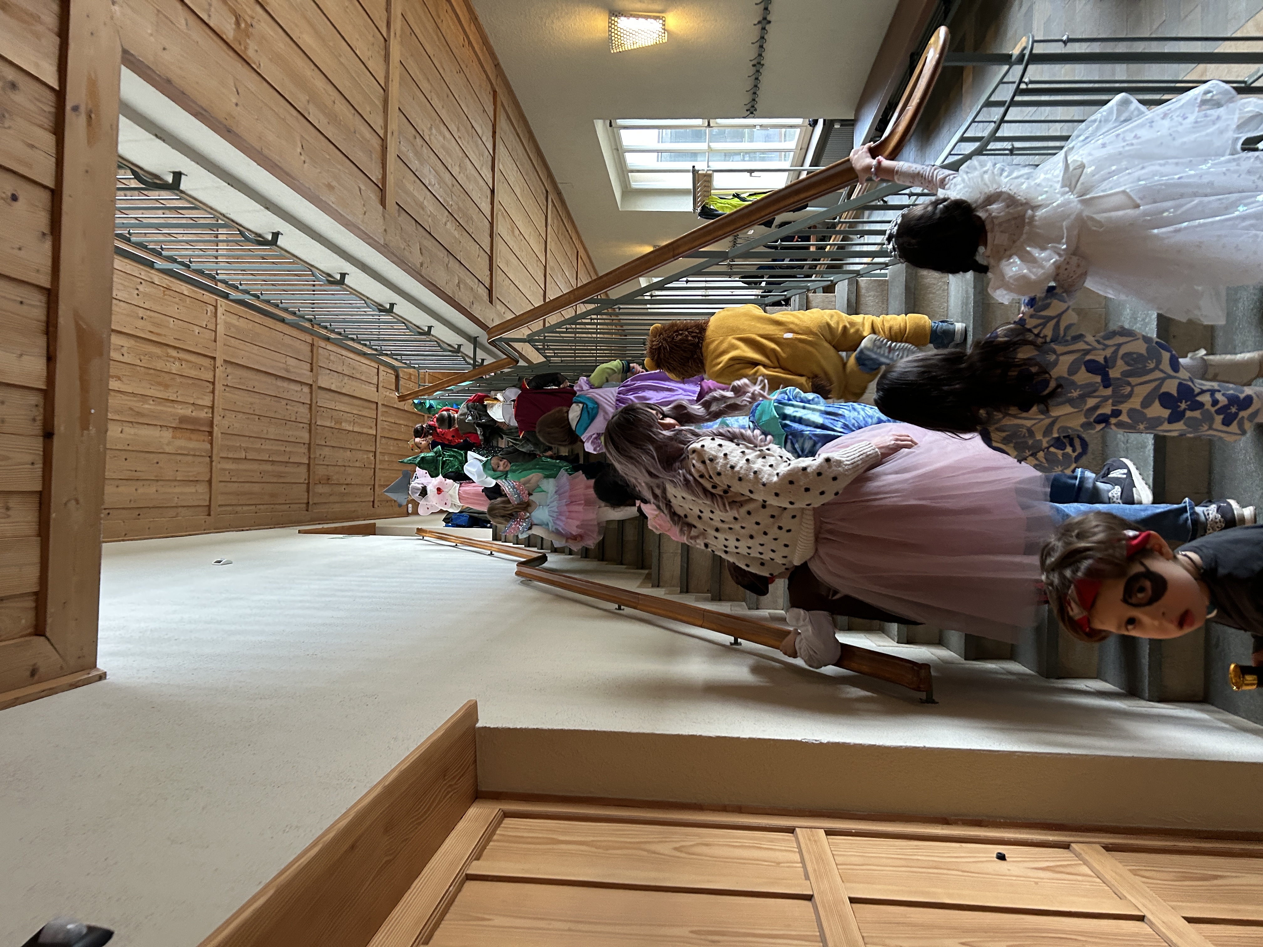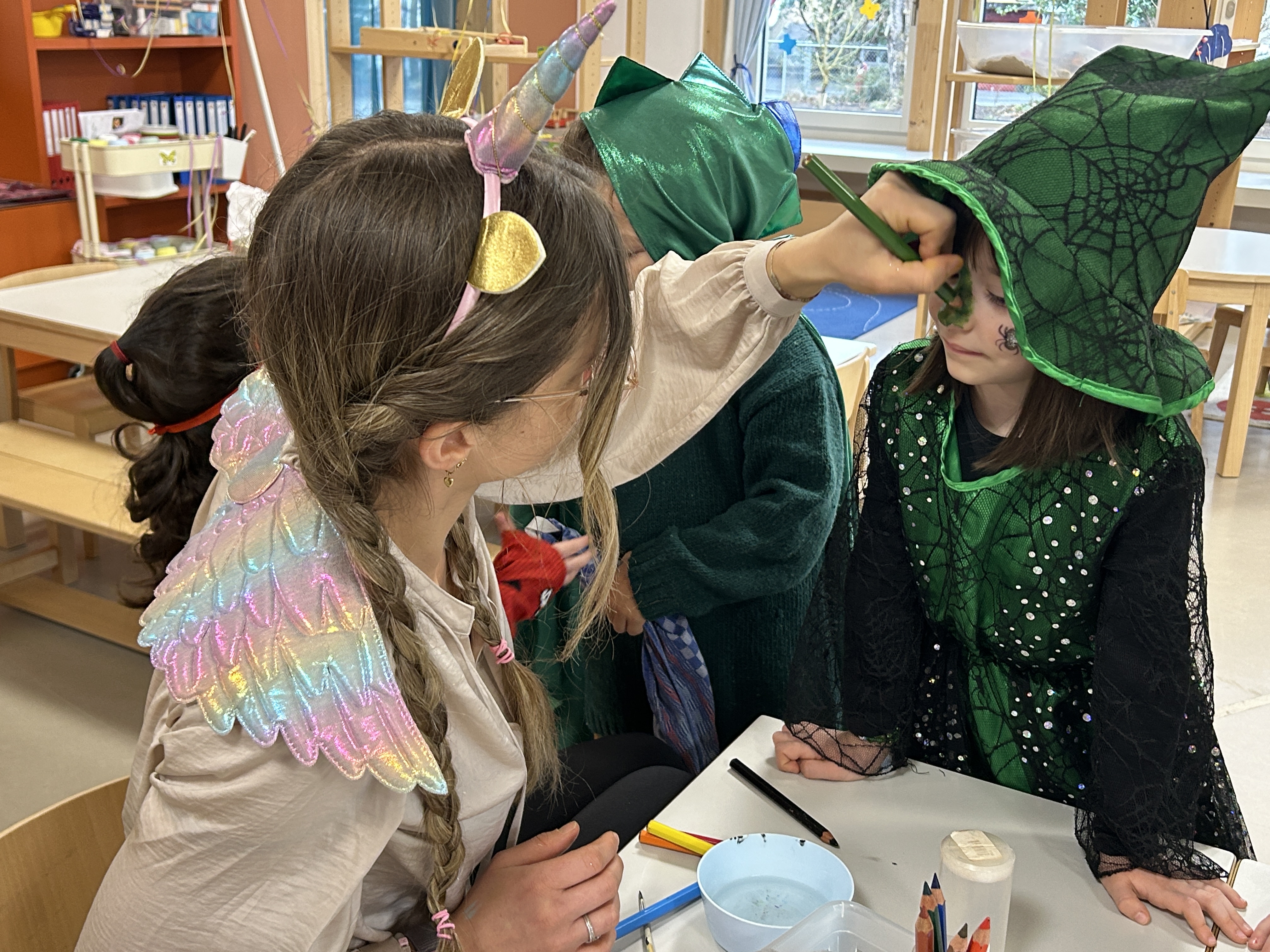 Am 20. Februar 2026 war es so weit: eine muntere Kinderschar trudelte im Kindergarten ein, teils verkleidet, andere suchten sich noch etwas im Kindergarten aus zum Verkleiden und liessen sich schminken. Popcorn wurde von ein paar Kindern gemacht, Sirup und Fasnachtschüechli bereit gestellt für das Znüni, Luftschlangen aufgehängt. Dann gingen beide Kindergärten zusammen auf den Umzug durchs Schulhaus.