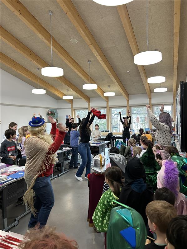 Wir überraschten mit viel Lärm und dem Tanz «Hast du gute Laune» die Klassen in ihren Klassenräumen und forderten jeweils Schülerinnen, Schüler und Lehrpersonen zum Mitsingen und Mittanzen auf - es war für die Kleinen ein wahres Fest!