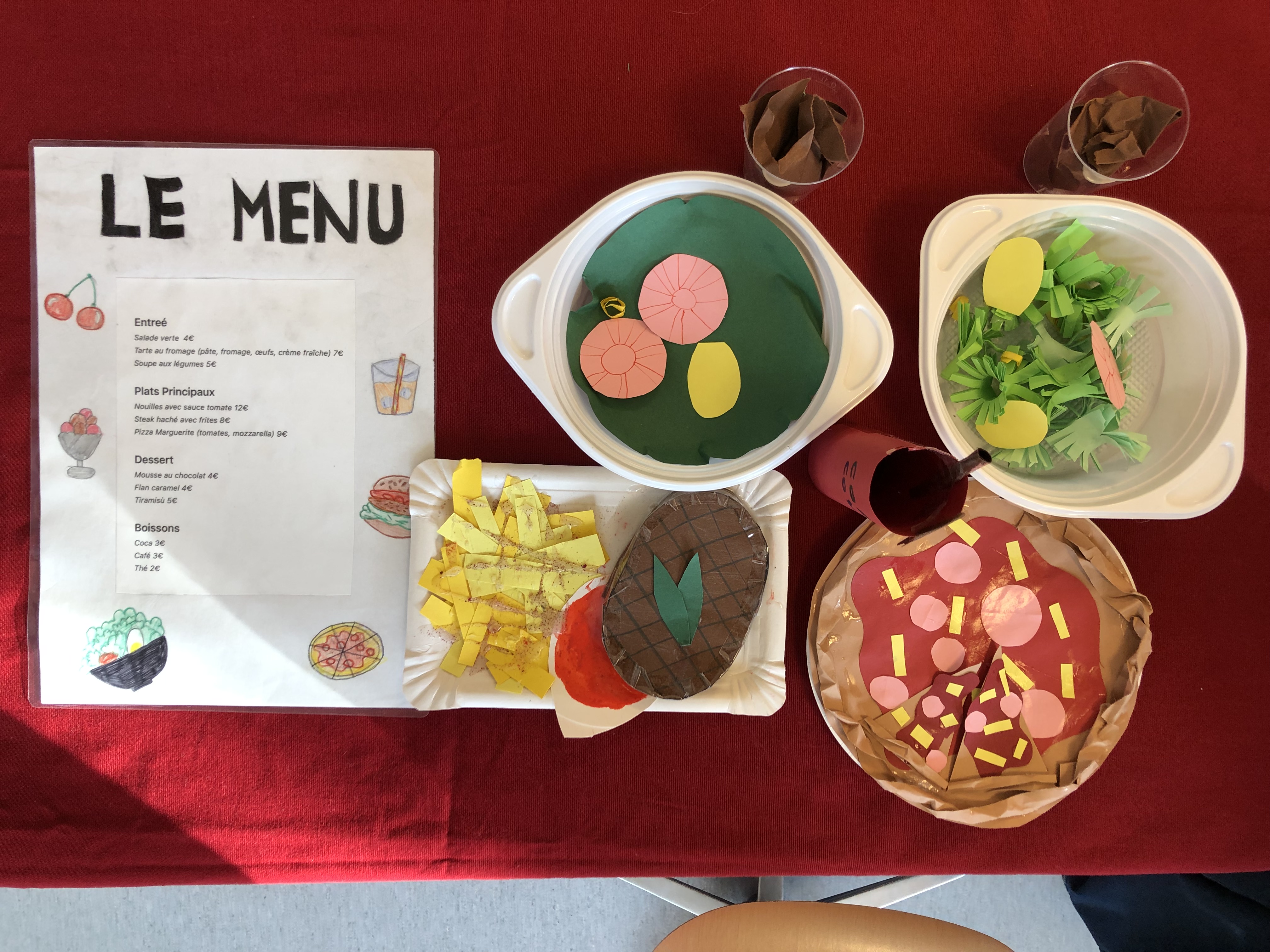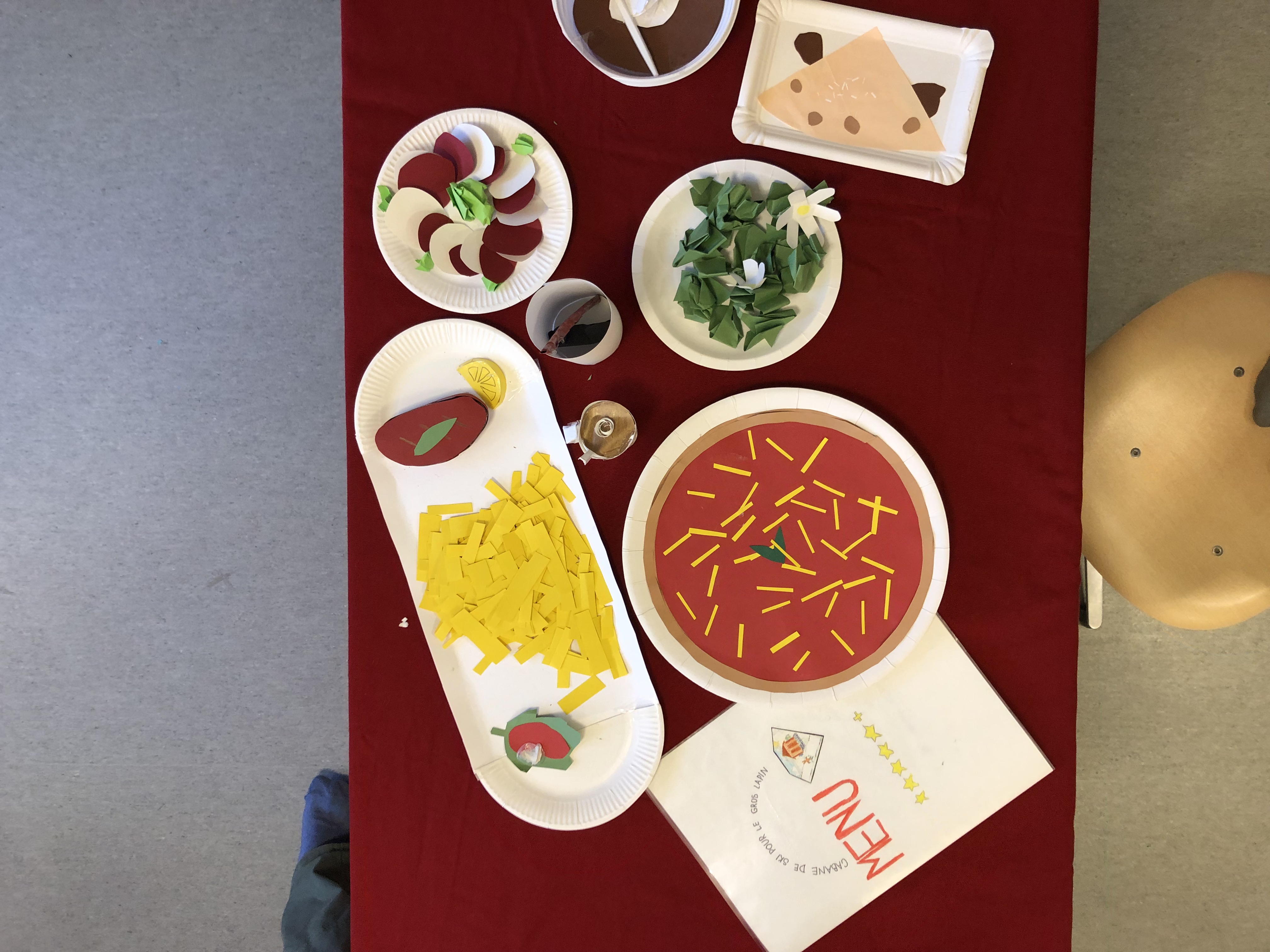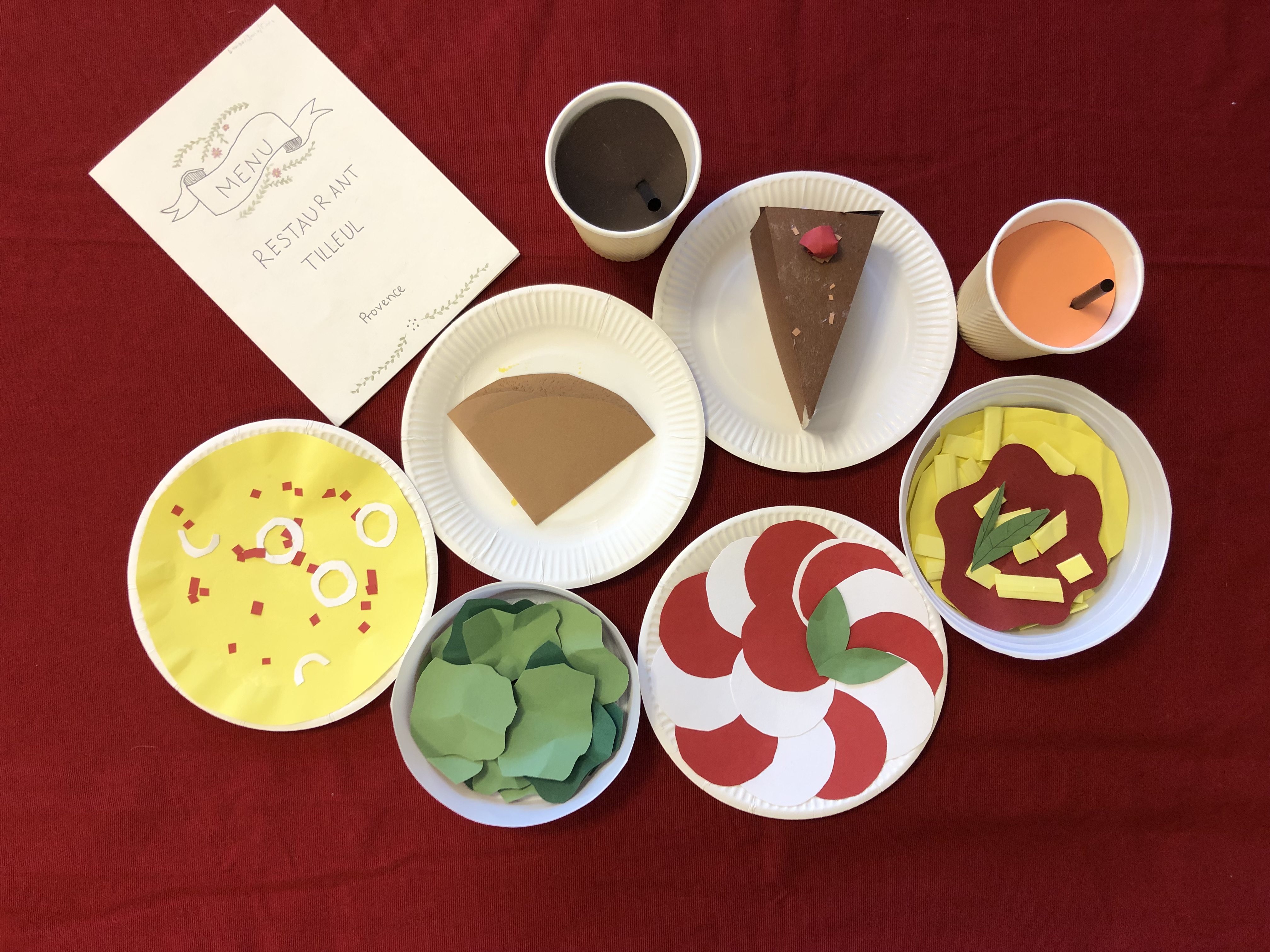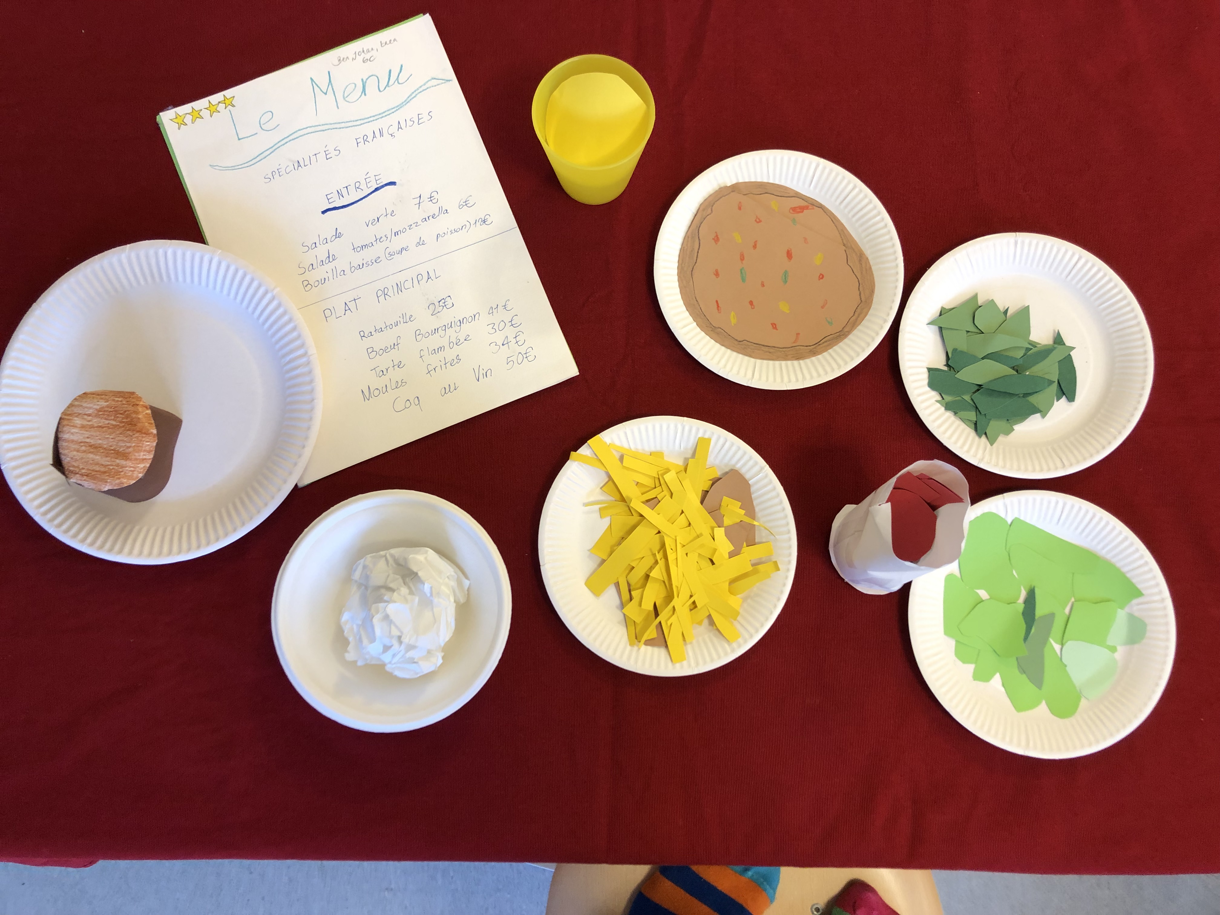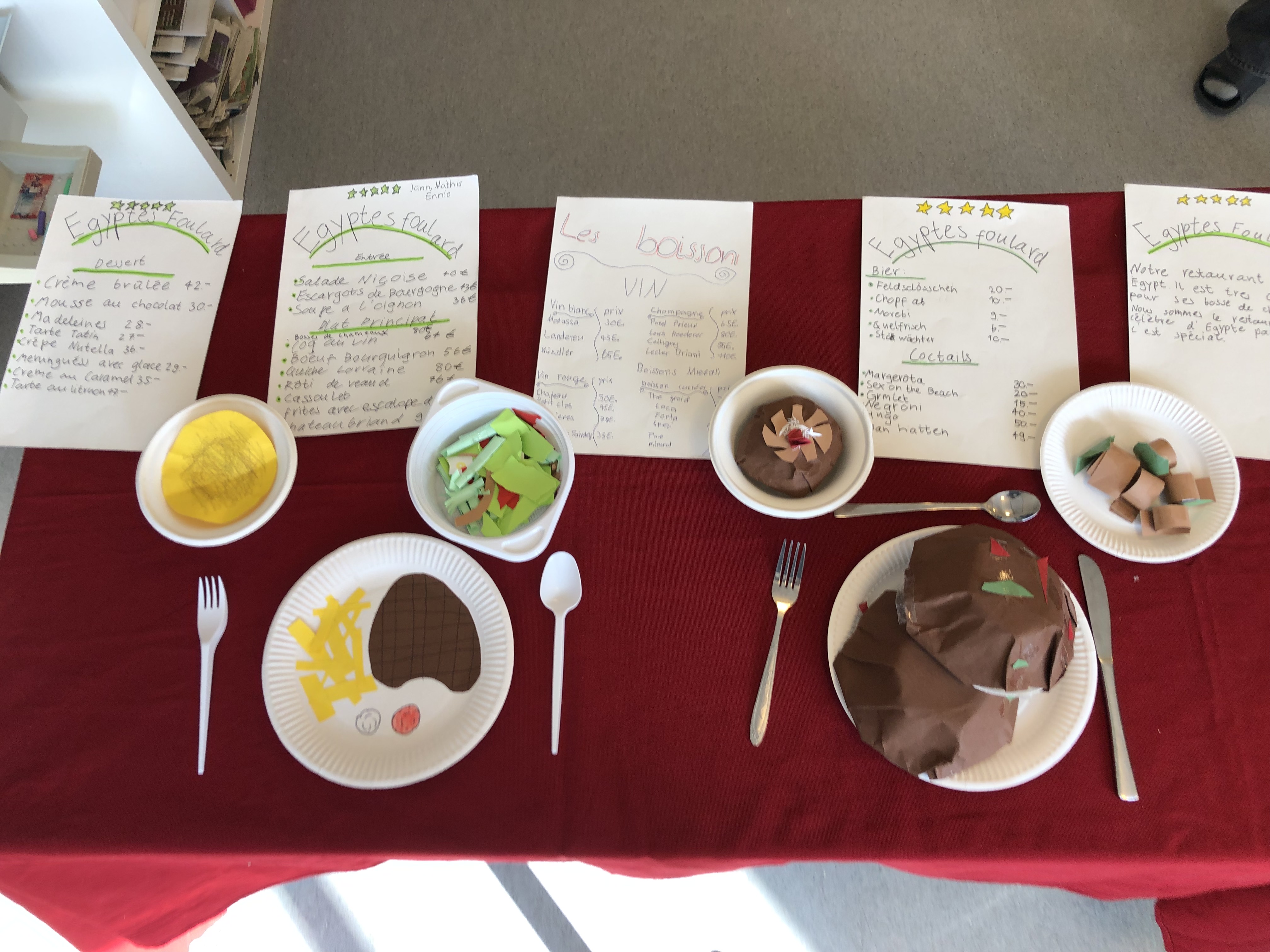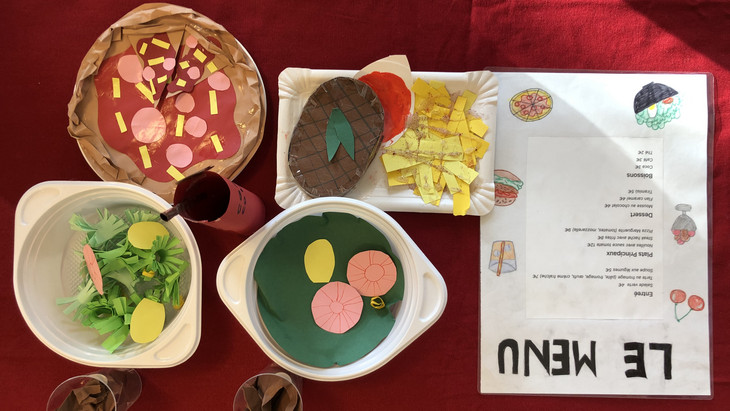 Die 6. Klässler übten im Französischunterricht eine kleine Szene in einem Restaurant in französischer Sprache ein und lernten diese auswendig. Die Restaurants waren in ganz Frankreich, in der Romandie und auch in den frankophonen Ländern Afrikas oder in Kanada angesiedelt.
