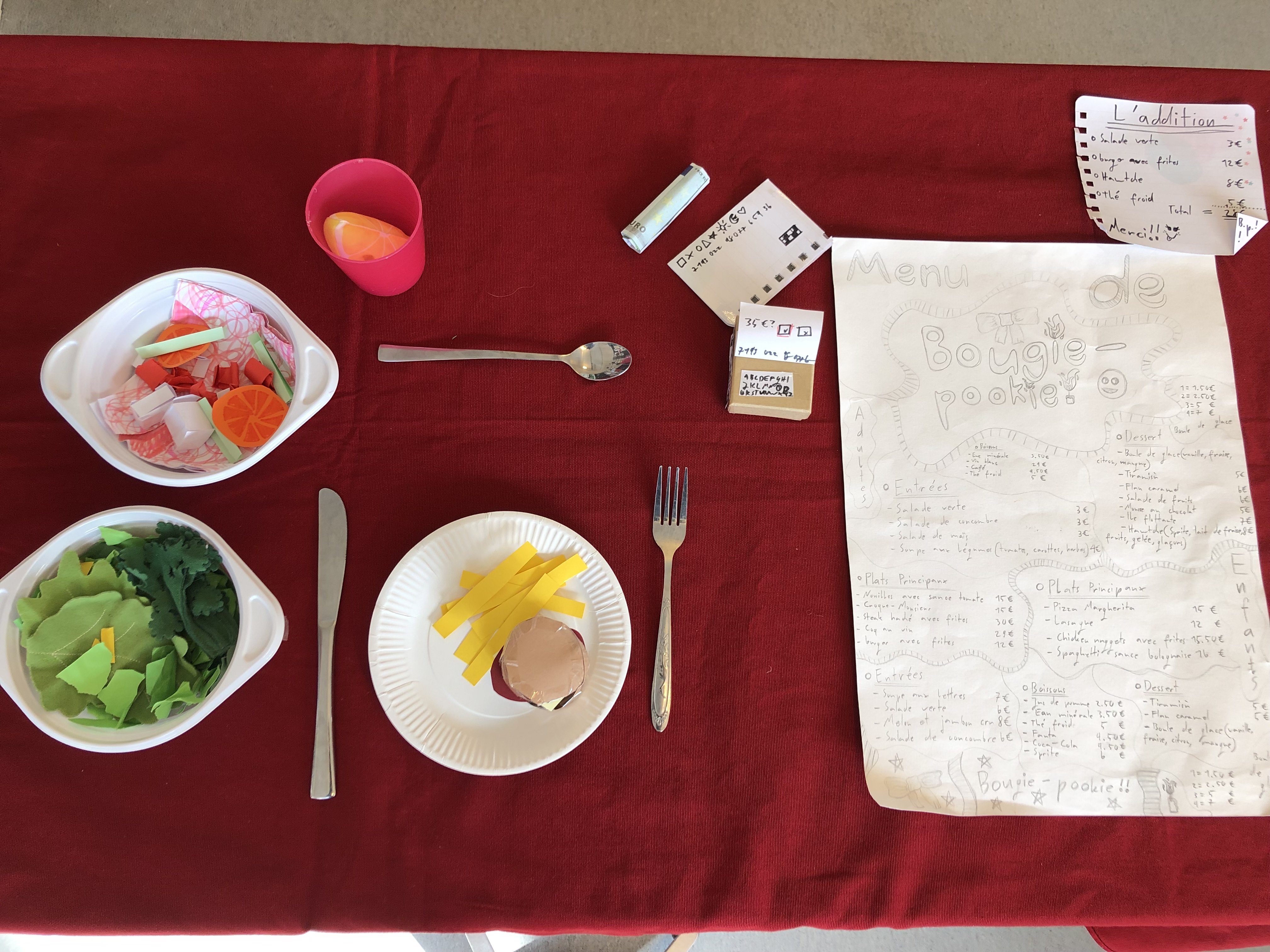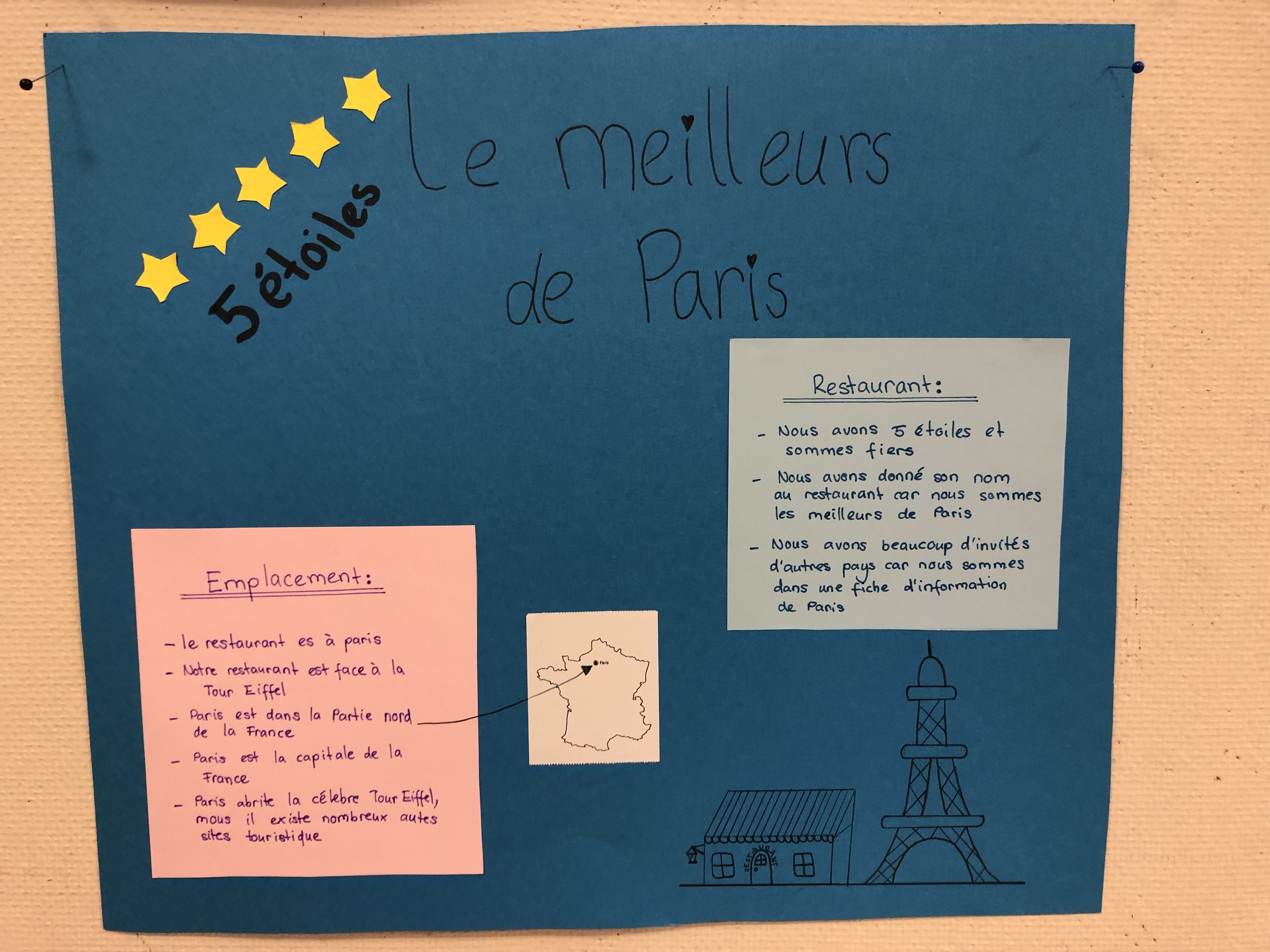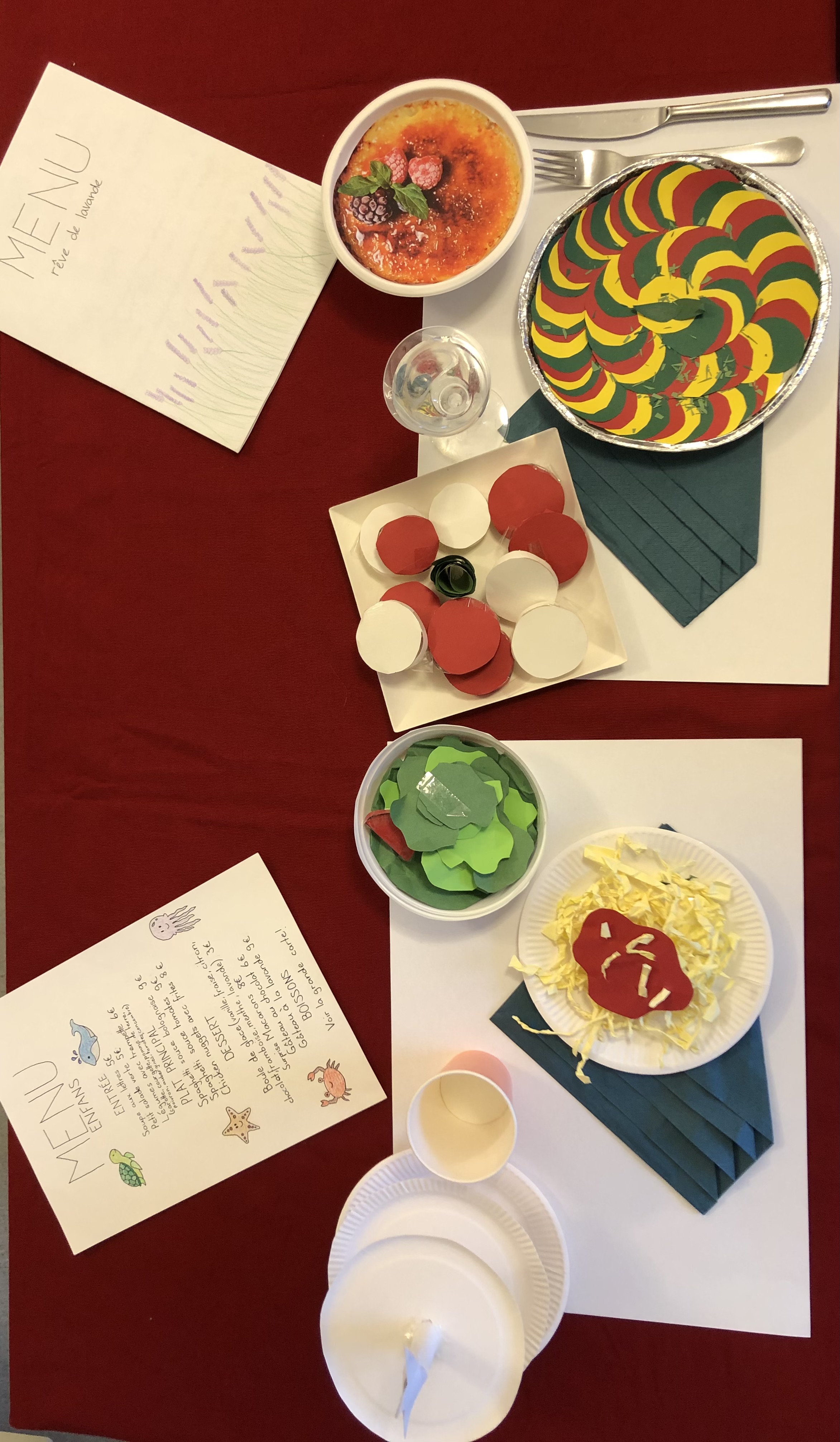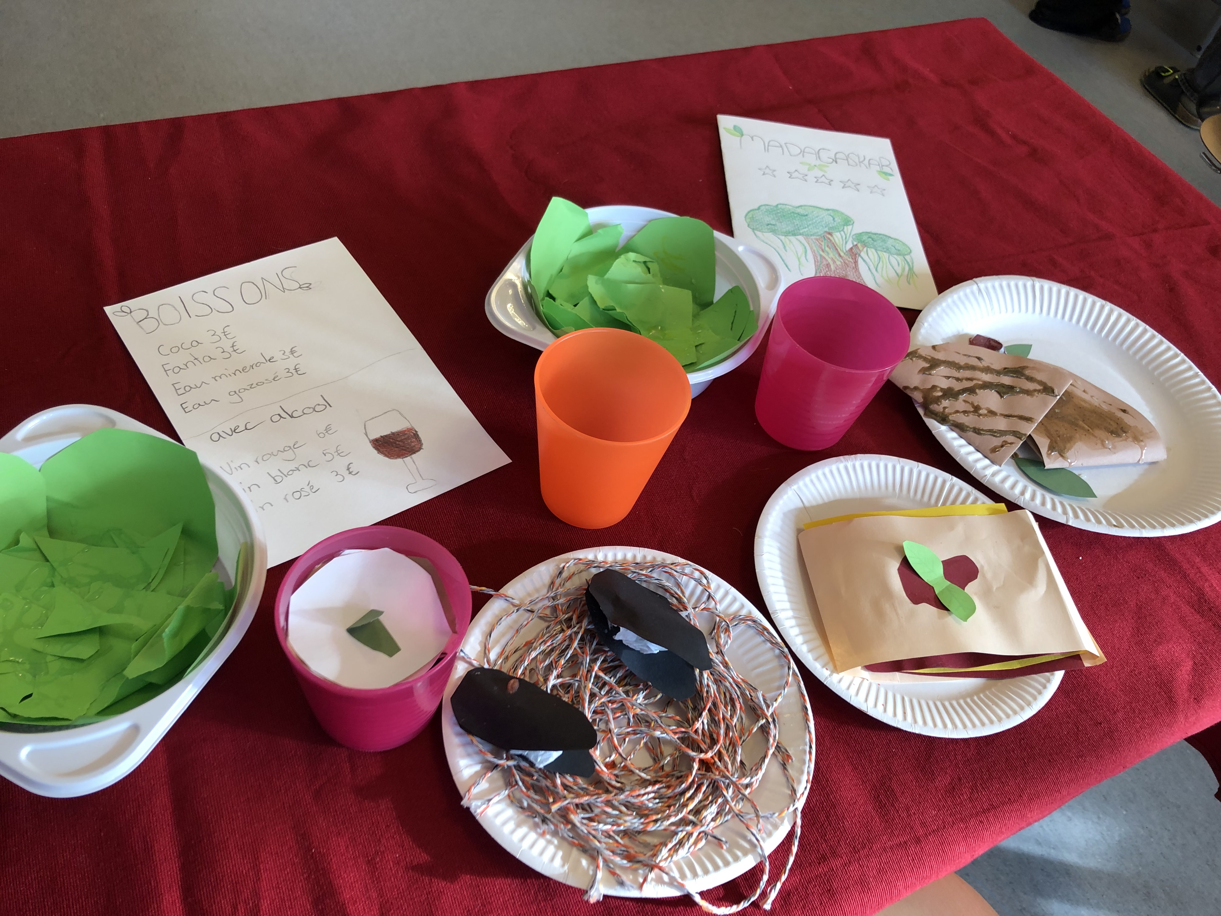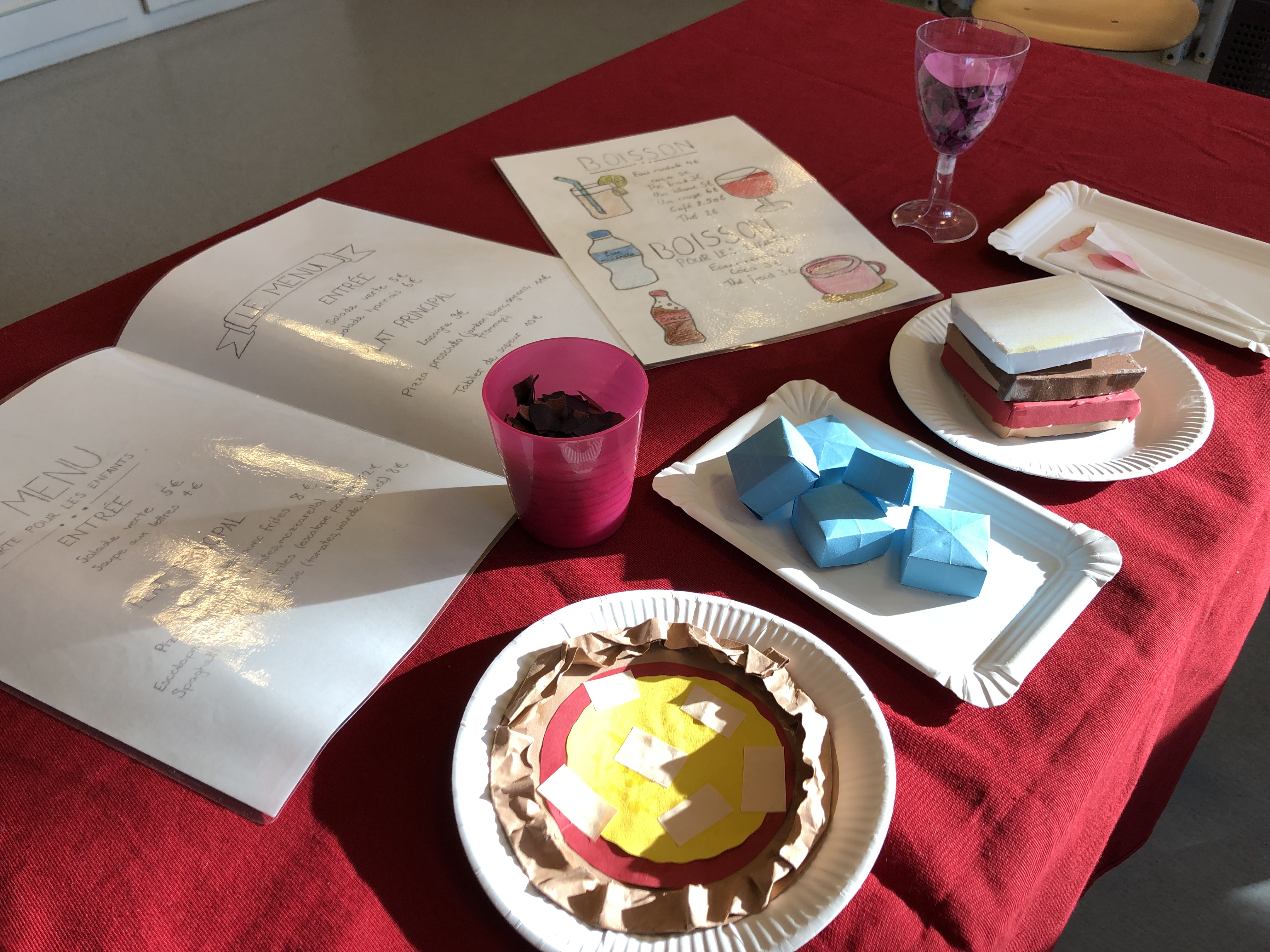Die 6. Klässler übten im Französischunterricht eine kleine Szene in einem Restaurant in französischer Sprache ein und lernten diese auswendig. Die Restaurants waren in ganz Frankreich, in der Romandie und auch in den frankophonen Ländern Afrikas oder in Kanada angesiedelt.