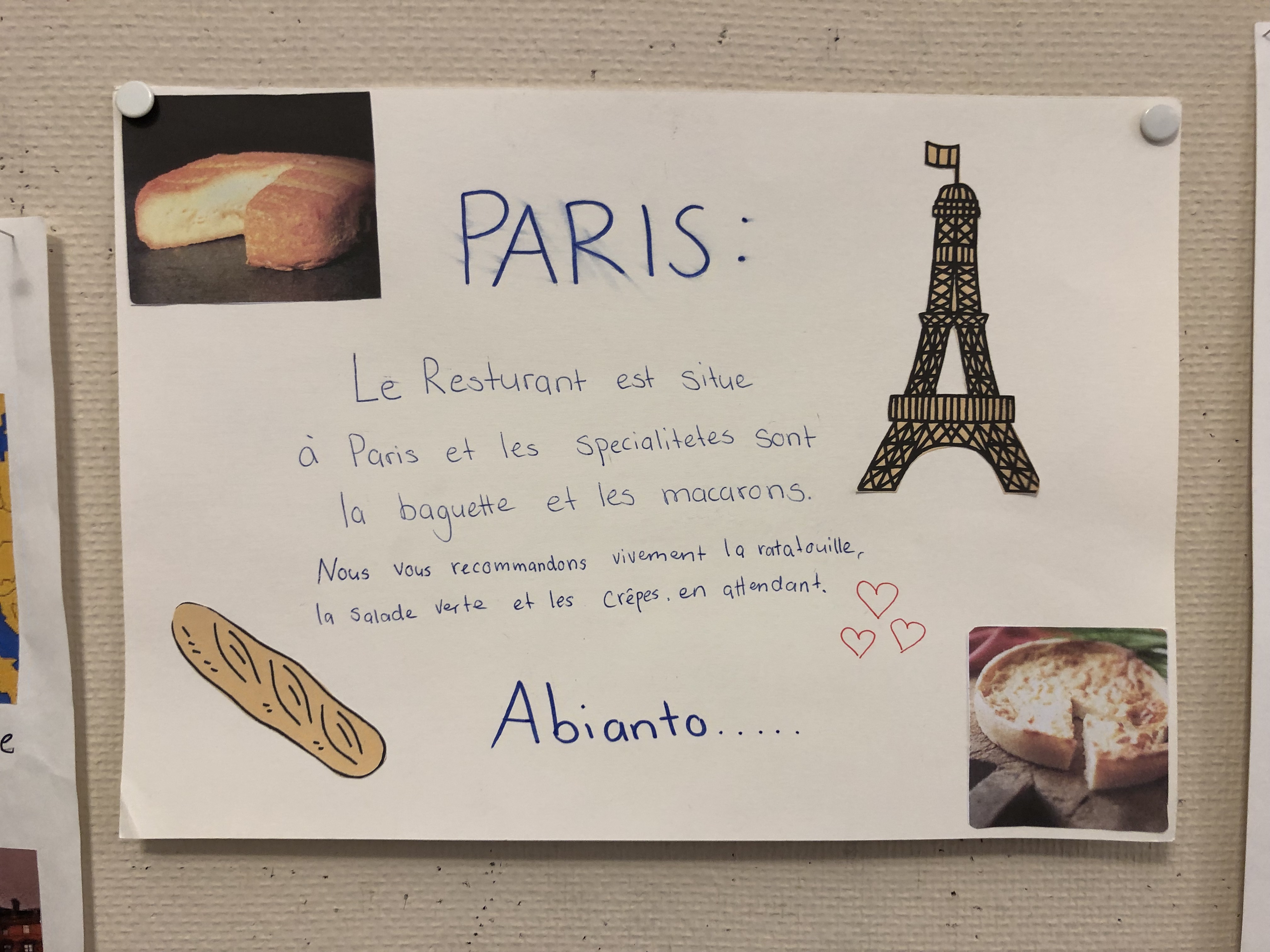 Zu den Restaurants gestalteten die Schülerinnen und Schüler ansprechende und fantasievolle Speisekarten, bastelten Requisiten und gaben am Schluss mit einem Plakat einen kleinen Einblick, wo das Restaurant liegt und welche touristischen oder kulinarischen Attraktionen es in diesem Gebiet oder in dieser Stadt gibt.