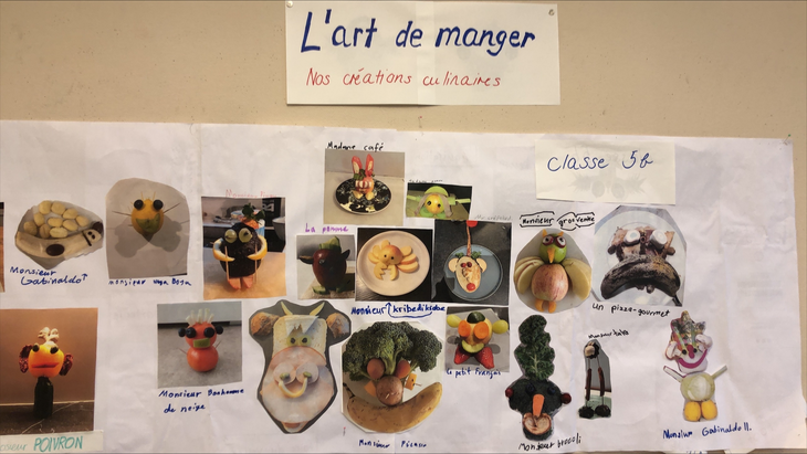 In der Unité 4 von «Dis donc 5» lernen die 5. Klassen den Wortschatz über Nahrungsmittel, Gesichtsteile und Verben kennen. Aber nicht nur das. Sie lernen diese Wörter auch gleich anzuwenden. Dazu haben sie zuhause ein kleines Gemüse- und Früchtemonster kreiert. In der Schule haben sie diesen kleinen Monstern einen französischen Namen gegeben und eine Liste der Zutaten und eine Rezeptanweisung dazu geschrieben. Auf diese Weise lernen die Kinder, sich in der französischen Sprache auszudrücken. Der Erwerb der Fremdsprache wird mit Handlungen verbunden. Gleichzeitig erleben sie, wie fantasievoll und individuell ihre Klasse und sie selbst eine Aufgabe umsetzen können.