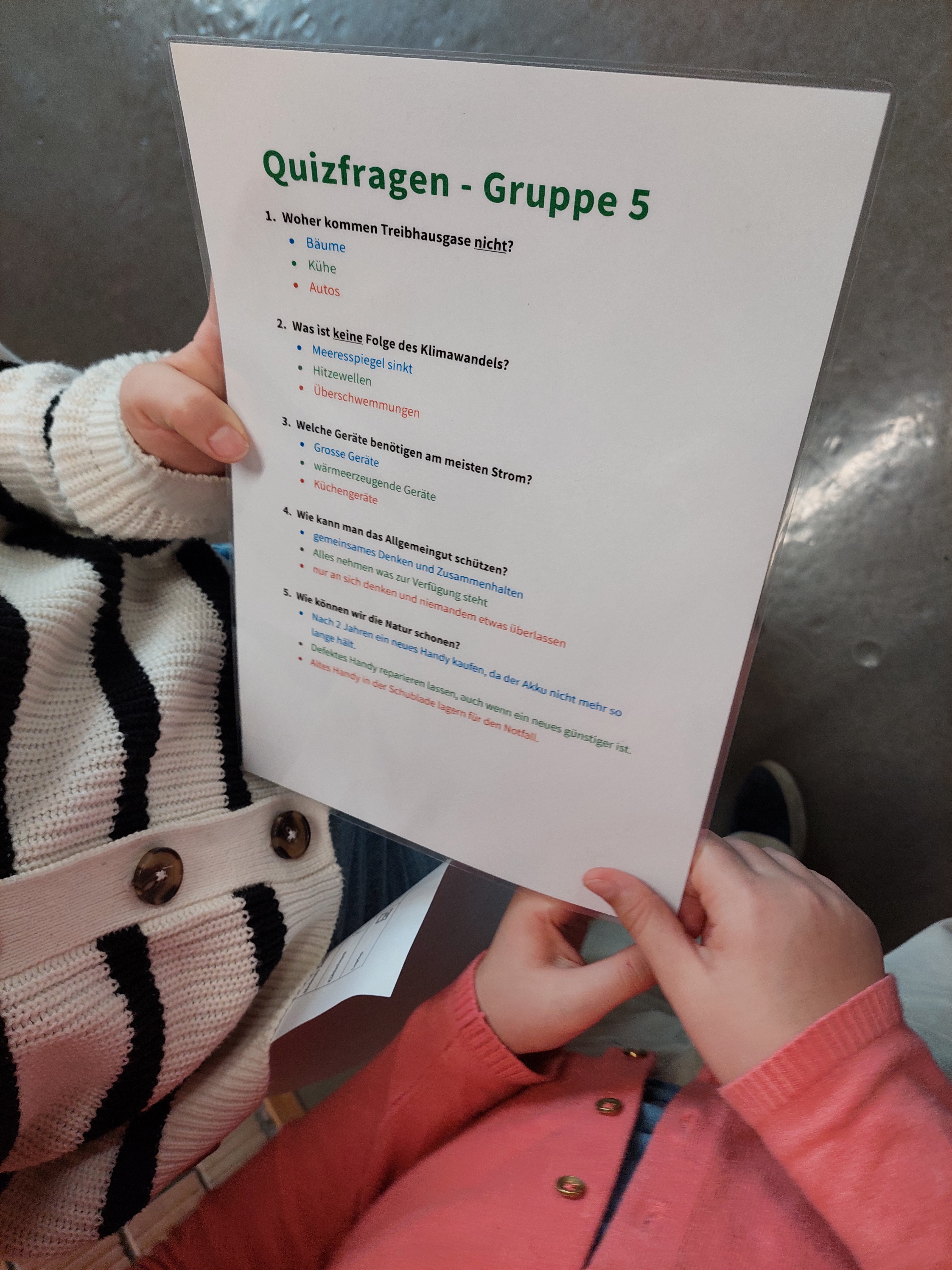 Am Freitag, 31. Oktober 2025 besuchte die Klasse 6b die Klima-Erlebnistage im Schachen Aarau. Nach einer kurzen Einführung zum Thema Klimawandel durften die Schülerinnen und Schüler in verschiedenen Modulen aktiv mitarbeiten. Im ersten Modul ging es um die Rohstoffe eines Handys und darum, wie man Geräte nachhaltiger nutzen kann. Im zweiten Modul erlebten die Kinder beim Spiel zur Überfischung, wie wichtig ein verantwortungsvoller Umgang mit natürlichen Ressourcen ist. Im dritten Modul wurde fleissig Strom produziert: Mit Muskelkraft kurbelten die Kinder Energie und testeten den Stromverbrauch verschiedener Haushaltsgeräte. Zum Abschluss überprüften alle ihr Wissen in einem spannenden Quiz über den ganzen Morgen.