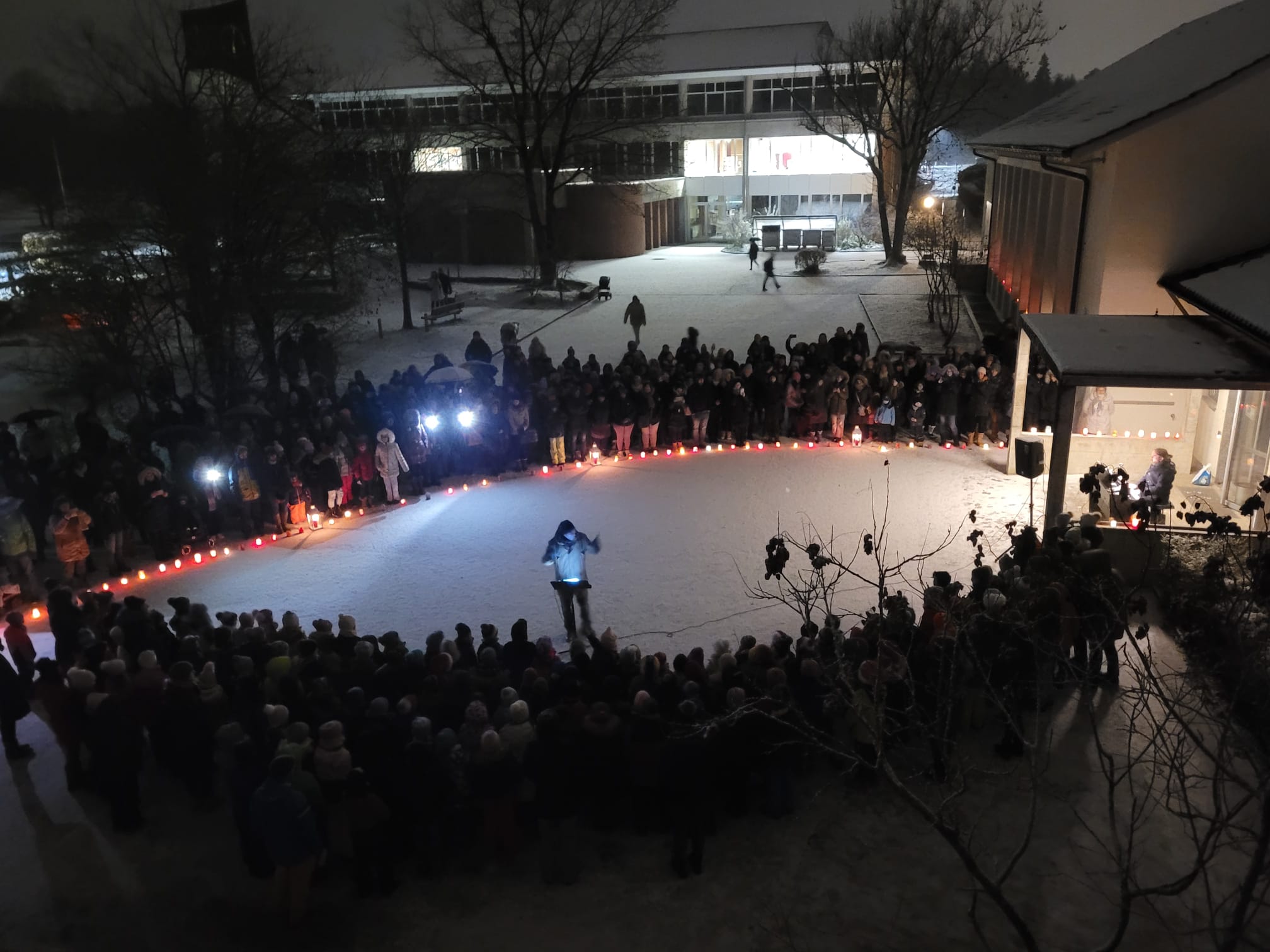 Bei Eiseskälte und wunderschönem Schneefall sangen die Schülerinnen und Schüler der 1. – 4. Klasse zusammen mit den Kindergartenkindern weihnachtliche Klassiker wie «Feliz Navidad», «I wish you a merry christmas» oder «Zimetstärn, hani gärn». Für einen weihnachtlichen Gänsehautmoment sorgte das Lied «Es Truckli vou Liebi».