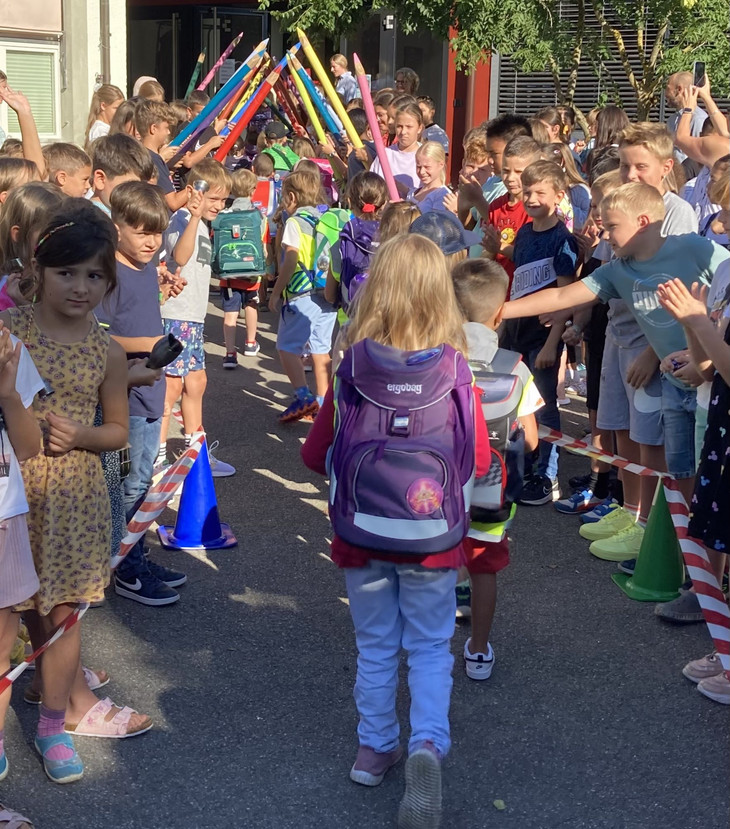 Ganz aufgeregt warteten am sonnigen Montagmorgen kurz vor 9 Uhr die neuen Kinder der 1. Klassen mit ihren Eltern auf dem Pausenplatz vor dem Brunnbachschulhaus in Rohr. Auch die Schülerinnen und Schüler der 2. bis 6. Klassen versammelten sich, um die neuen 1. Klassen zu begrüssen und in der Schule willkommen zu heissen. Um Punkt 9 Uhr startete dann der Schuljahresbeginn durch die Schulleitung Frau Wassmer. Danach war die 5.Klasse an der Reihe, die die neuen Kinder mit guten Wünschen und musikalischen Klängen und Gesang begrüsste. Die neuen ErstklässlerInnen staunten dabei. Daraufhin wurden die Kinder mit vielen Glocken und Gebimmel ins Schulhaus hineingeläutet. Sie durften dabei durch einen Spalier hindurch ins Brunnbachschulhaus schreiten und wurden da direkt von ihrer Lehrerin in Empfang genommen. Alle waren ganz aufgeregt und freuten sich riesig, dass die Schule nun endlich losgeht!