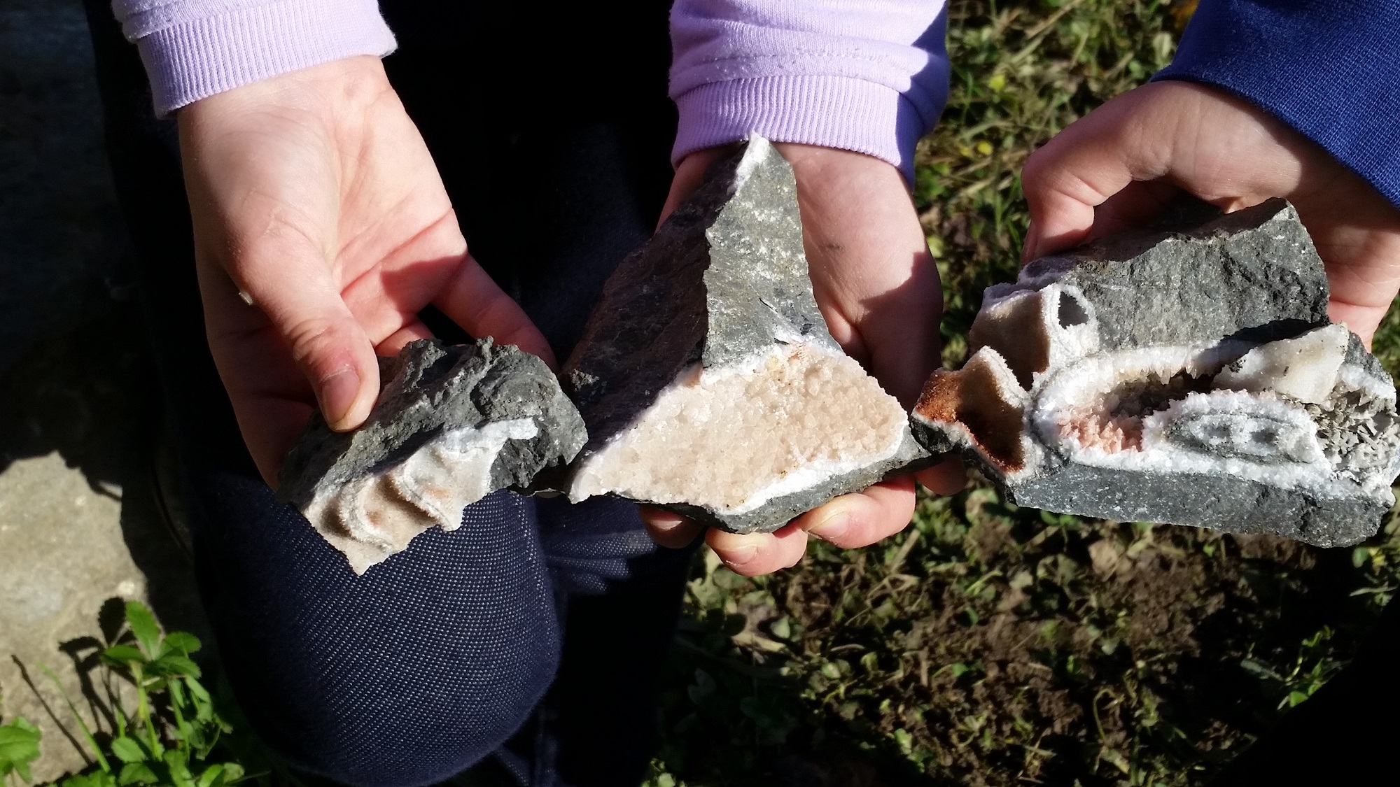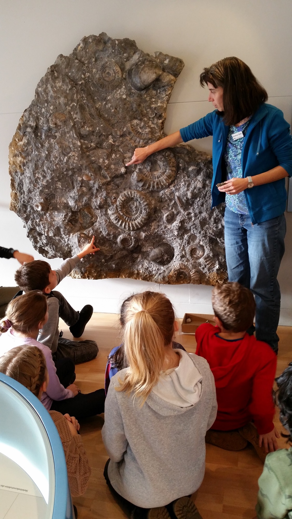 Und es zeigte sich, dass wir riesige Glückspilze sind: Überall kamen wunderbar auskristallisierte Fossilien zum Vorschein. Voll Begeisterung füllten wir unsere Rucksäcke. Auch das grösste Fundstück, ein mehrere Kilo schwerer Stein, fand den Weg ins Schulhaus. Er wird wohl einen Ehrenplatz in einer unserer Vitrinen bekommen.