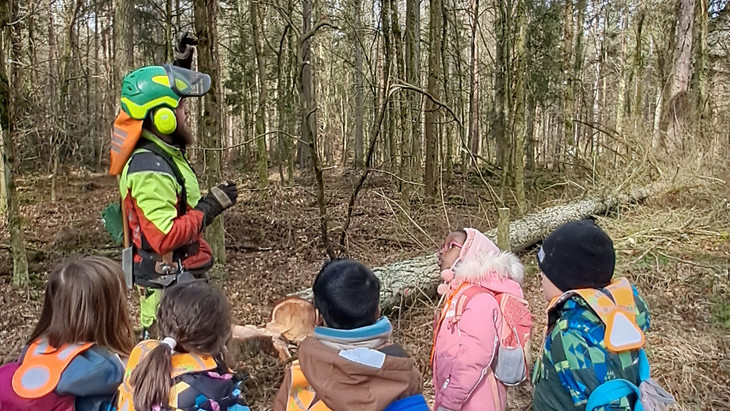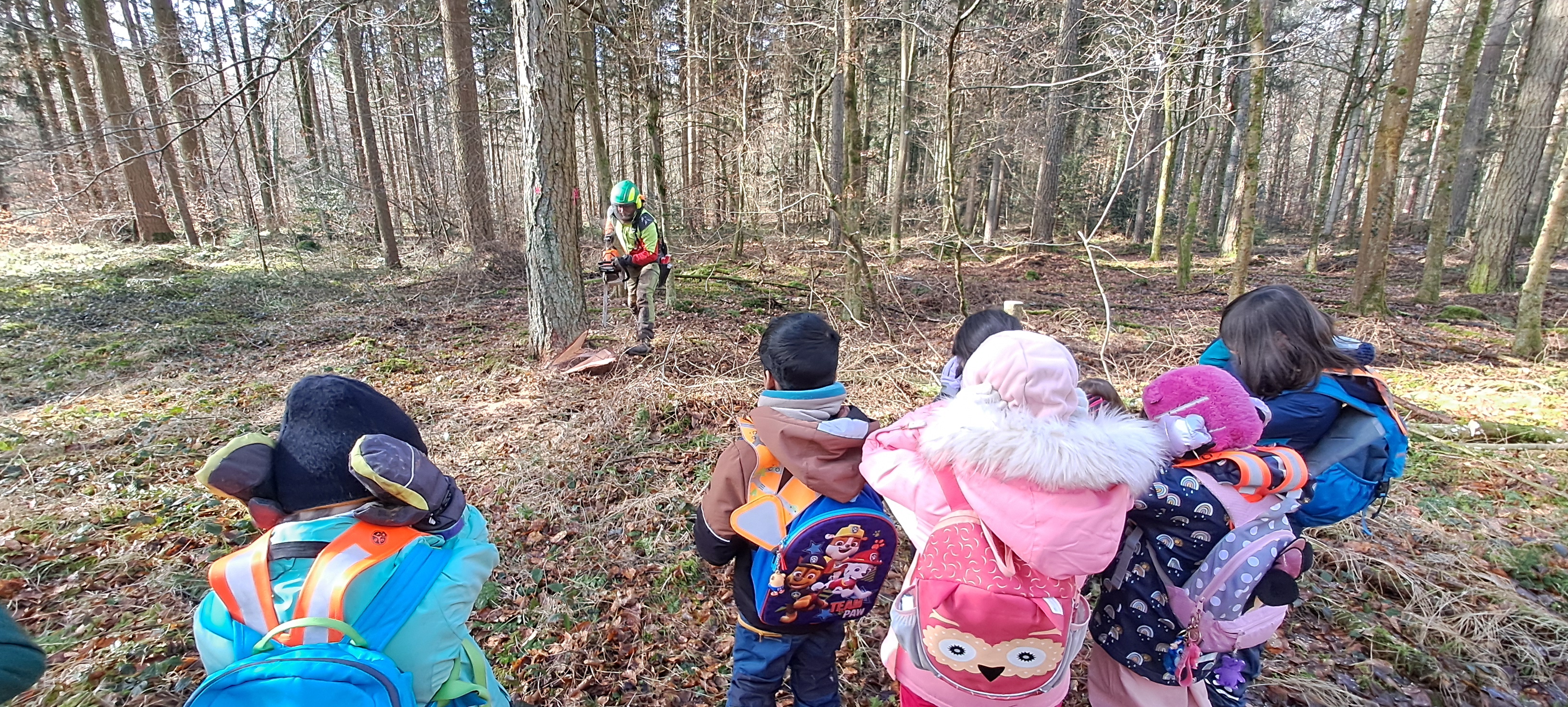 Unglaublich spannend, was der Förster uns alles zu erzählen hat. Er erklärt uns wie Bäume trinken, welche Tiere im Wald leben, wie Haareis entsteht und vieles mehr. Beim Znüni treffen wir Herrn Müller, ein Forstwart. Zusammen mit ihm geht’s ein Stück weiter und zum Höhepunkt des Morgens. Wir dürfen zusehen, wie ein Baum gefällt wird, was für ein Erlebnis. Herzlichen Dank an die beiden Herren, die ihre Freude und Begeisterung am Wald und ihrer Arbeit mit so viel Engagement und Herzblut an die Kindergartenkinder weitergeben. Der Waldbesuch hat Eindruck hinterlassen. Auf dem Rückweg in den Chindsgi meint ein Junge, er wolle auch Förster werden. Und auch wir anderen werden das nächste Mal mit mehr Hintergrundwissen und geschärften Augen den Wald besuchen.
