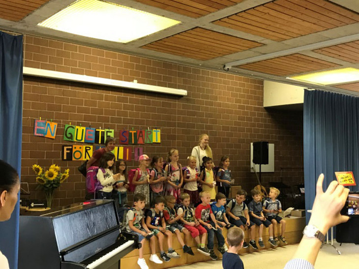 Zuerst fand eine Medienkonferenz mit Regierungsrat Alex Hürzeler statt. Anschliessend wurden die neuen Erstklässler/innen und ihre Eltern von der Schulleitung und den Lehrerinnen in Empfang genommen. Dieser Anlass wurde mit Instrumentalbeiträgen aus der 4. Klasse stimmungsvoll umrahmt. Die neuen Schüler/innen erhielten je ein "Papierhundeli", das die Sechstklässer/innen noch vor den Sommerferien gebastelt hatten. Vielleicht konnte dieser neue "Freund" etwas die Aufregung lindern.
