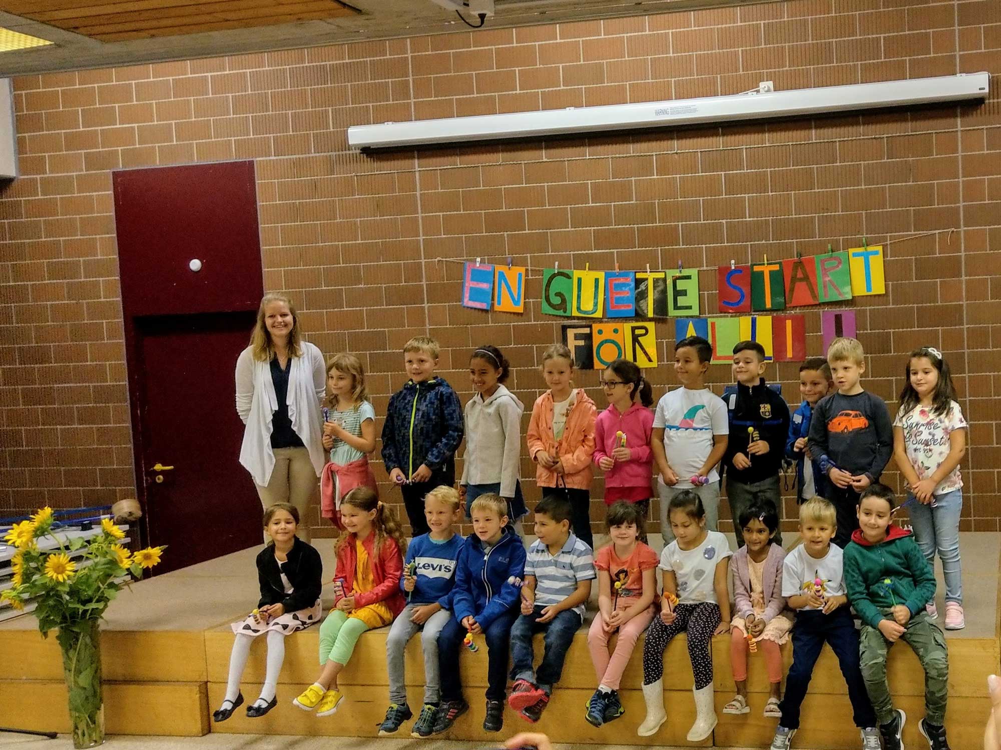 Zuerst wurden unsere neuen 1. Klässler/innen und deren Eltern herzlich im Standort Rohr willkommen geheissen. Mit klopfendem Herzen stiegen die Kinder auf die Bühne, wo sie als Willkommensgeschenk einen Bleistift erhielten, die die ehemaligen 6. Klässler/innen für sie gebastelt hatten. Nachdem die ersten Klassenfotos gemacht wurden, ging es schon los im Schulzimmer.