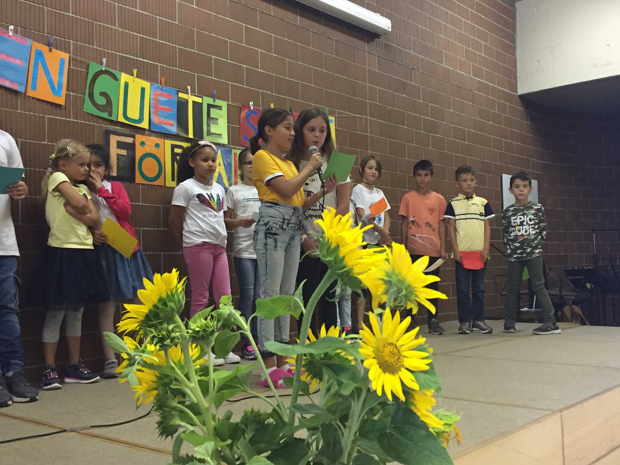 Anschliessend trafen sich alle Schüler/innen der 2.- 9. Klassen in der Aula, um gemeinsam ins neue Schuljahr zu starten. Jede Klasse sagte kurz etwas, ihrer Meinung nach Passendes, zum neuen Schuljahr. Eine Klasse wünschte sich z.B. eine Zauberschule und dann würde sie einen Rummelplatz auf den Pausenplatz zaubern. Den Zauberstab, brachten sie gleich mit auf die Bühne. Weitere Wünsche waren lebende Kuscheltiere im Schulzimmer, ein Wasservergnügungspark, Freunde und Zusammenhalt. Besonders viel Applaus bei den älteren Schülern/innen erntete der Vorschlag, eine Game-Lektion in der Schule zu haben und eine Klasse wünschte sich sogar die ganze Selbstbestimmung durch die Schüler/innen.