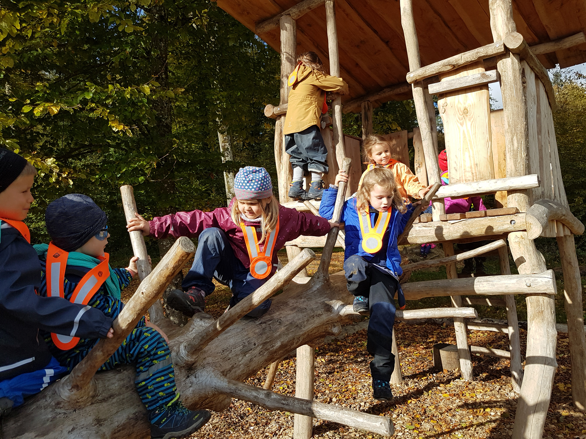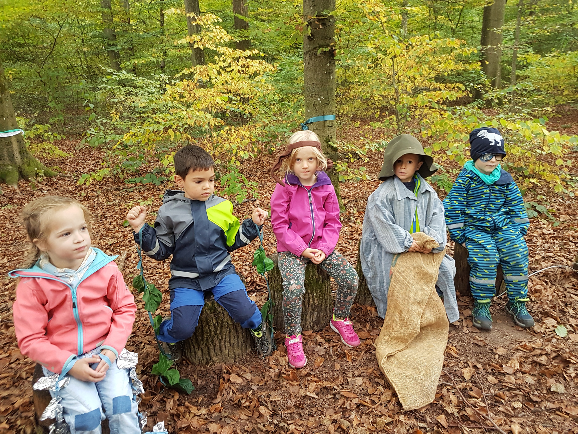 Nach dem Waldturnen am Dienstagmorgen verabschiedeten sich die Kinder mit dem Legen von farbenprächtigen Blättermandalas vom Waldplatz und am Nachmittag lauschten sie gespannt der Geschichte des Nadelbäumchens, das sich andere Blätter wünschte und zuletzt doch mit seinem alten Nadelkleid zufrieden war. Anschliessend wurde die Geschichte sehr mitfühlend und liebevoll auf der «Waldbühne» dargestellt.