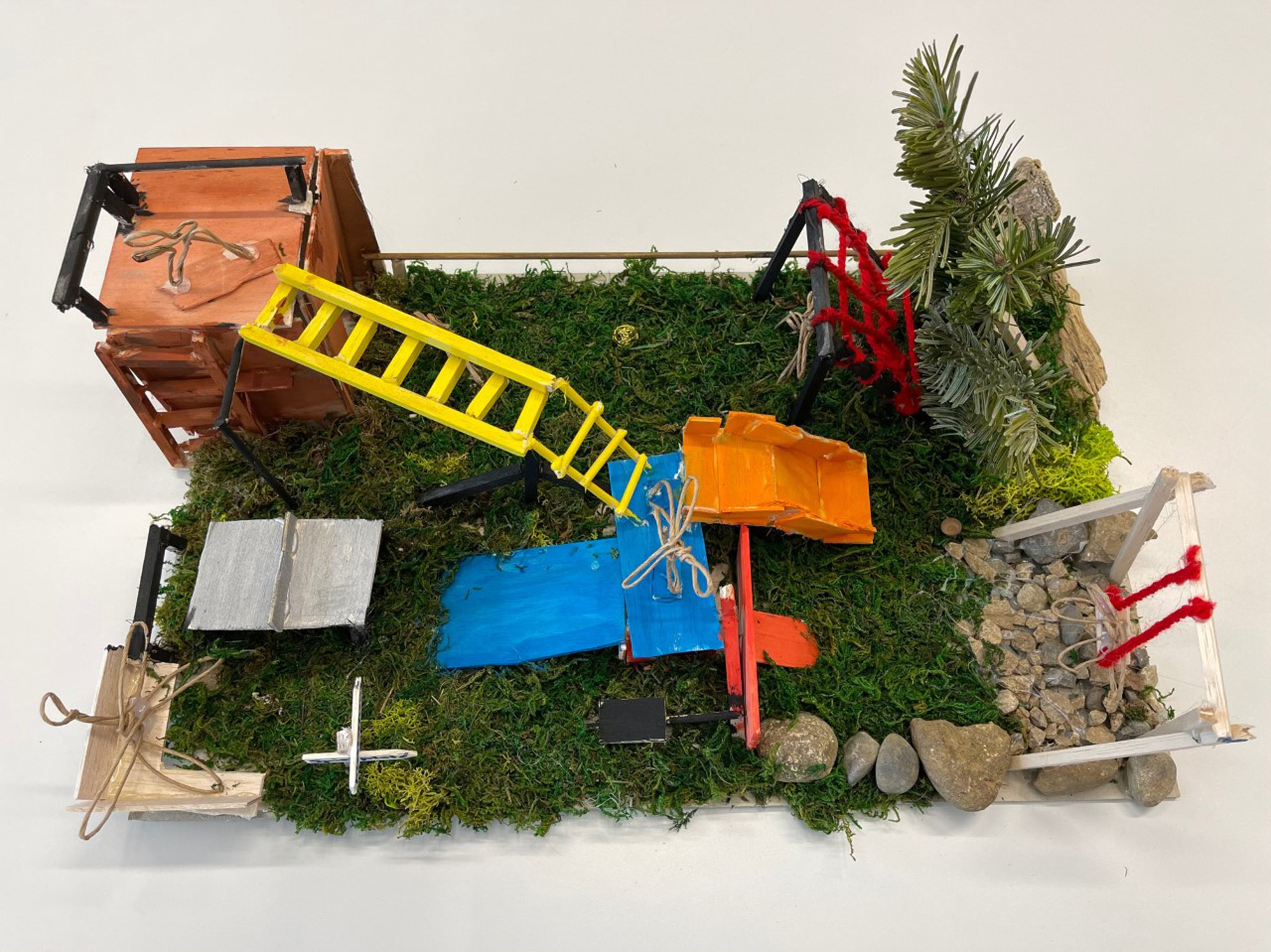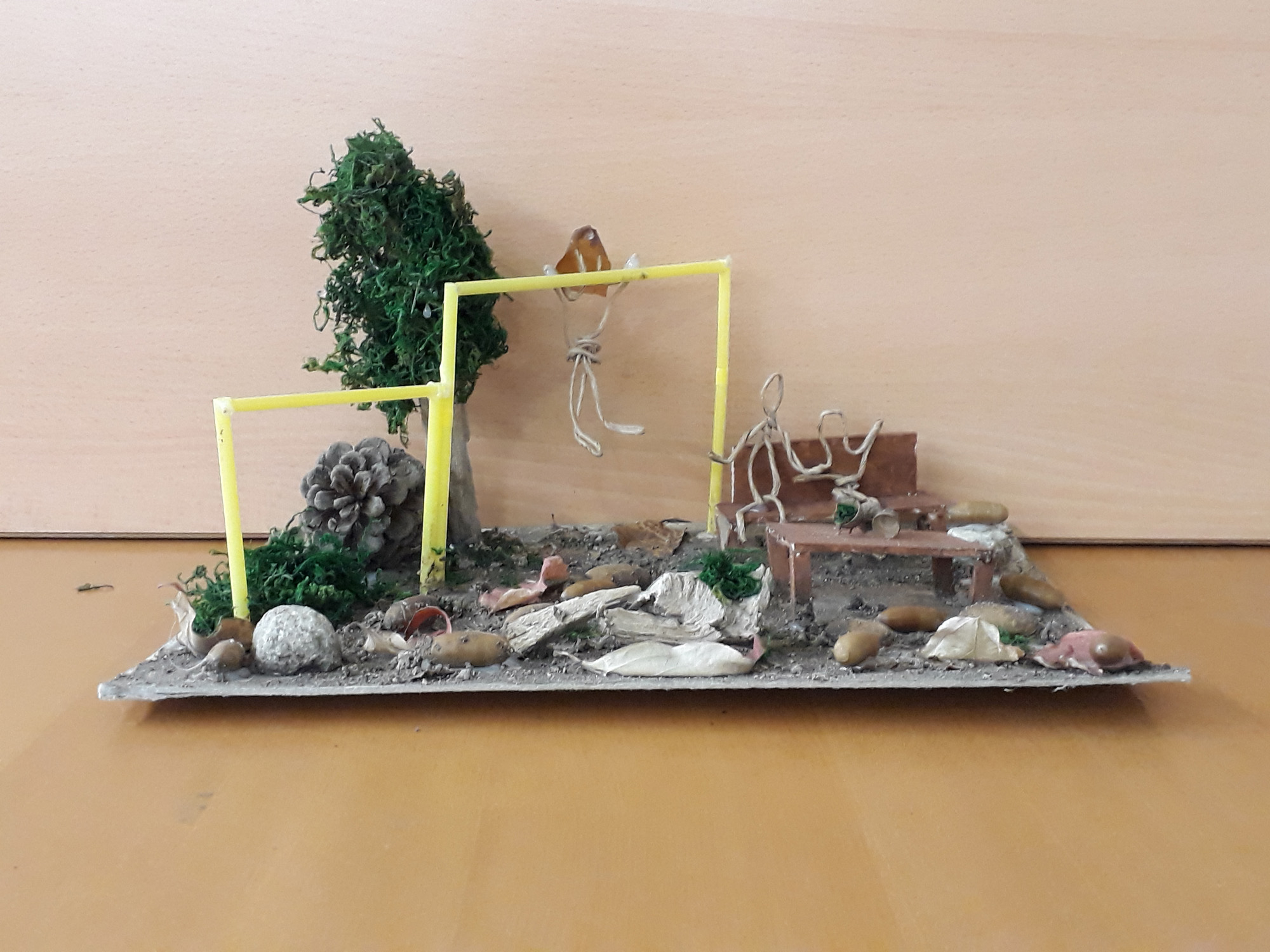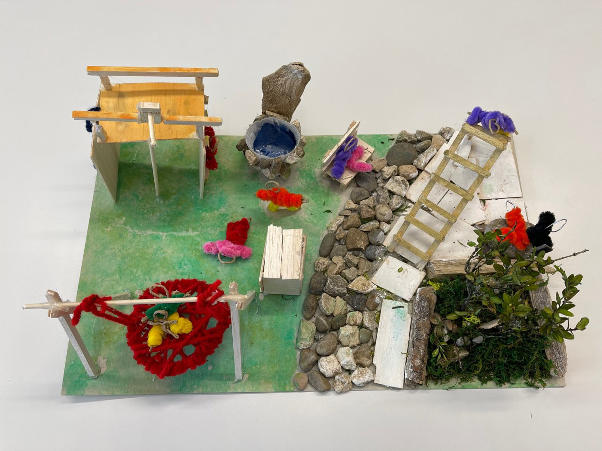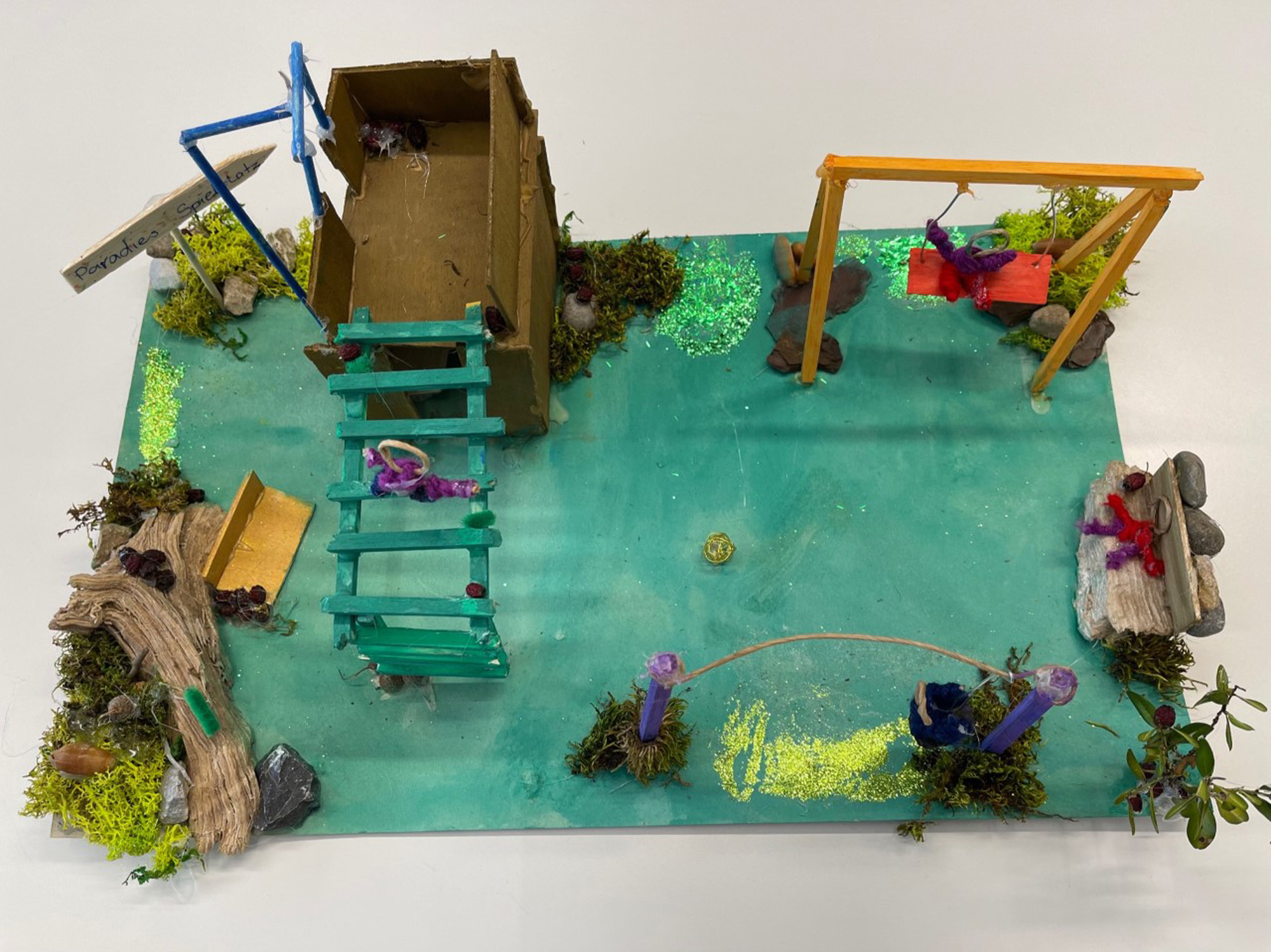Wir haben diese Materialien gebraucht: Karton für den Boden, Wände etc., Holzstangen, Moos, Holzplatten, Draht, Schnur, Pfeifenputzer und andere Naturmaterialien.