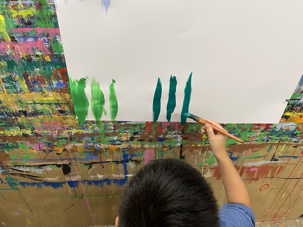 Im MalRaum angekommen wurden die Socken und Schürzen angezogen und es wurde ruhig. Die vielen Farben waren schon bereit und die schönen speziellen Pinsel lagen auf ihren Betten. Jedes Kind malte auf seinem grossen, weissen Papier. Die Kinder malten ohne Vorgabe und in ihrem eigenen, zeichnerischen Entwicklungsstand. Einige Kinder haben vor allem auch ausprobiert und das Malen wie in einem Spiel genossen.