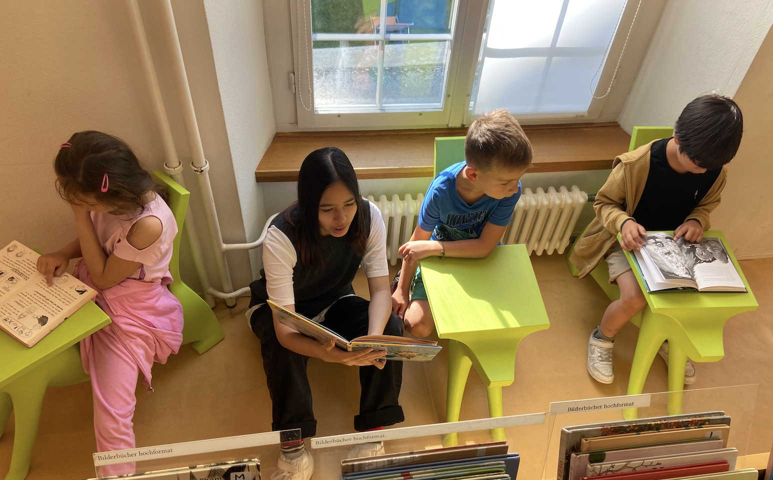Anlässlich des schweizerischen Vorlesetages besuchten die beiden ersten Klassen des Schachens und die Jugendlichen des Oberstufenschulhaus die Stadtbibliothek in Aarau. Nach einer kurzen Einführung durften jeweils zwei Erstklässler mit ihrer Gotte/ ihrem Götti aus dem OSA mitgehen. Zusammen haben sie dann Bücher ausgelesen, welche die Grossen den Kleinen vorlesen konnten. Gegen Ende des morgens tauten die Kleinen auf und lasen ebenfalls vor. Was für ein tolles Erlebnis für Gross und Klein!