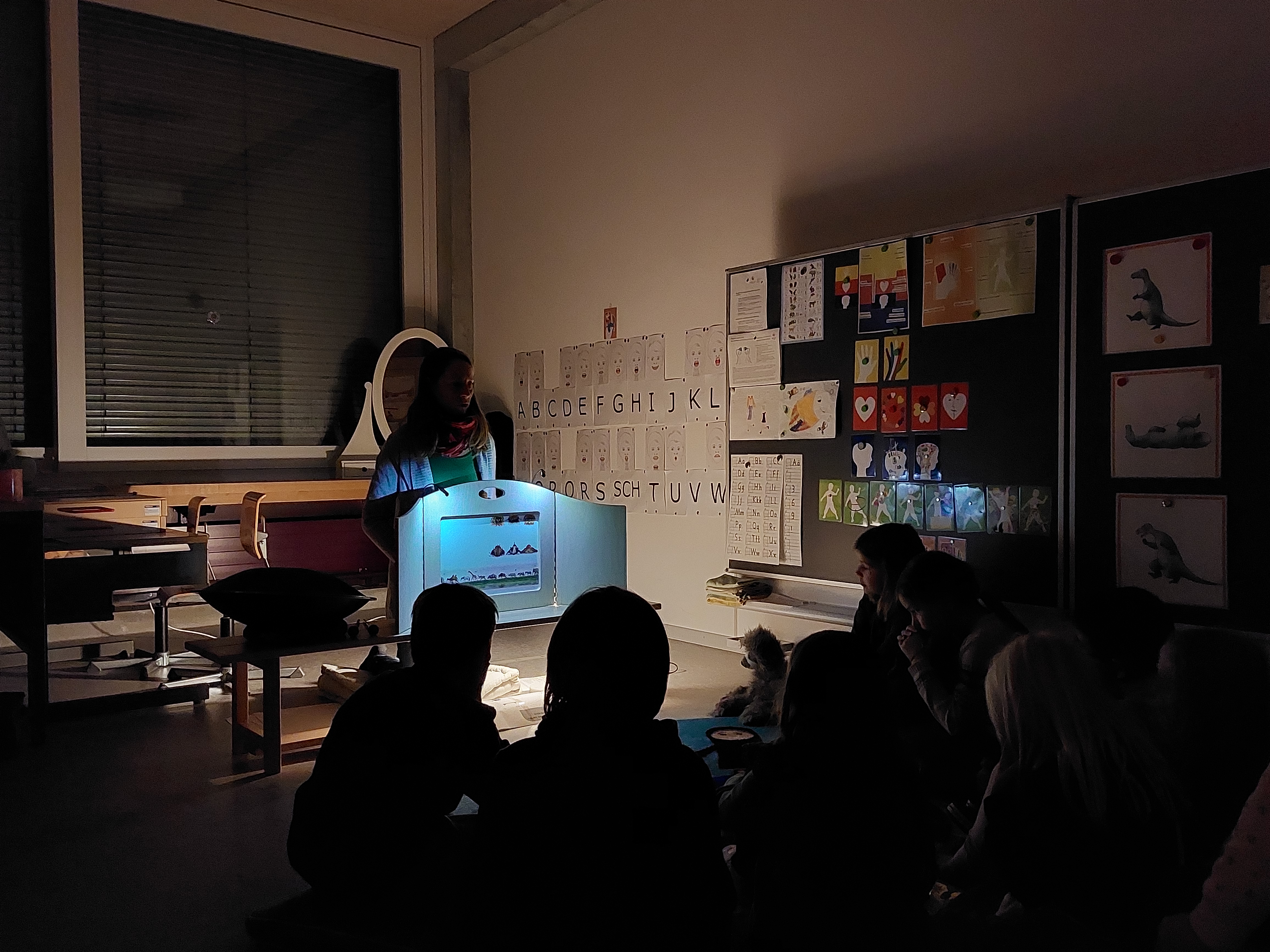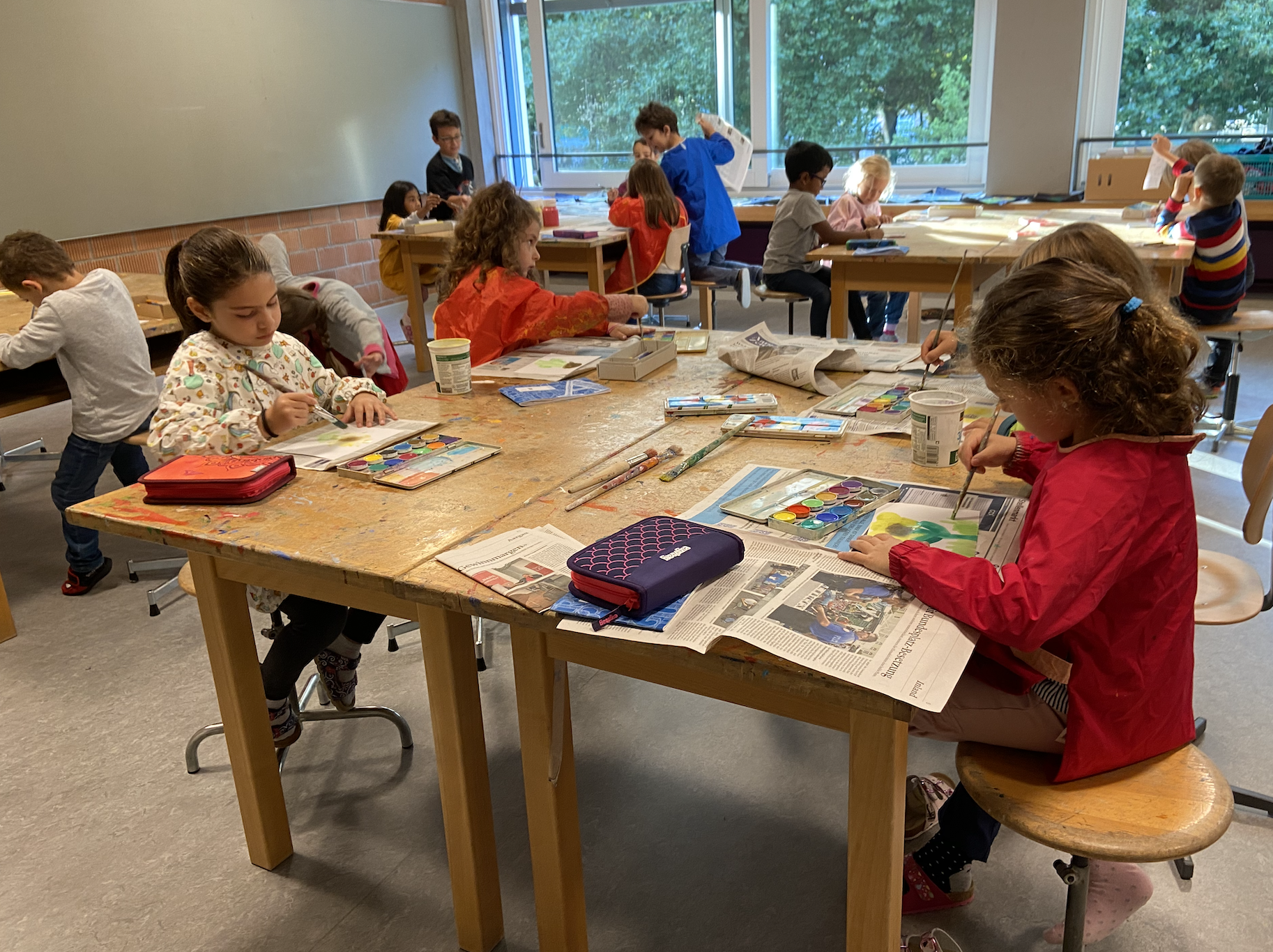 Das Malen mit Wasserfarben bereitet der 1a im Schachen grosse Freude. Vor allem, wenn das Kunstwerk auf einem grossen Blatt und mit Wasserfarben gepinselt wird. Heute war das Blatt nicht ganz so gross – dafür die Freude um so grösser.