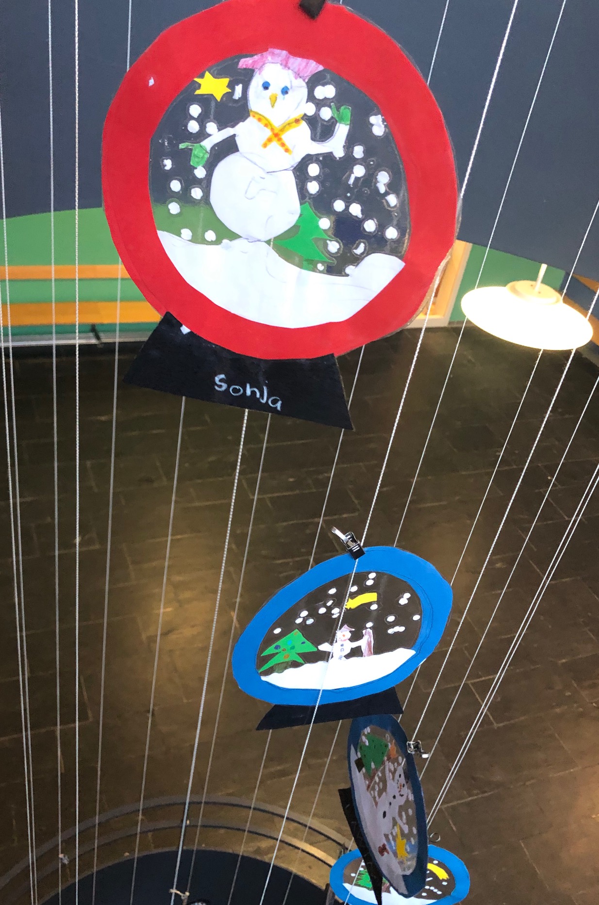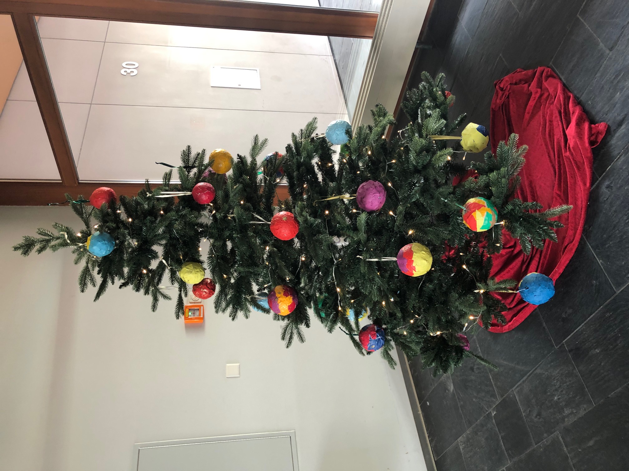 Ein prächtiger, mit selbstgebastelten Kugeln geschmückter Weihnachtsbaum empfängt einen täglich im Eingangsbereich und viele wunderbare Schneekugeln taumeln fröhlich durch das Treppenhaus.