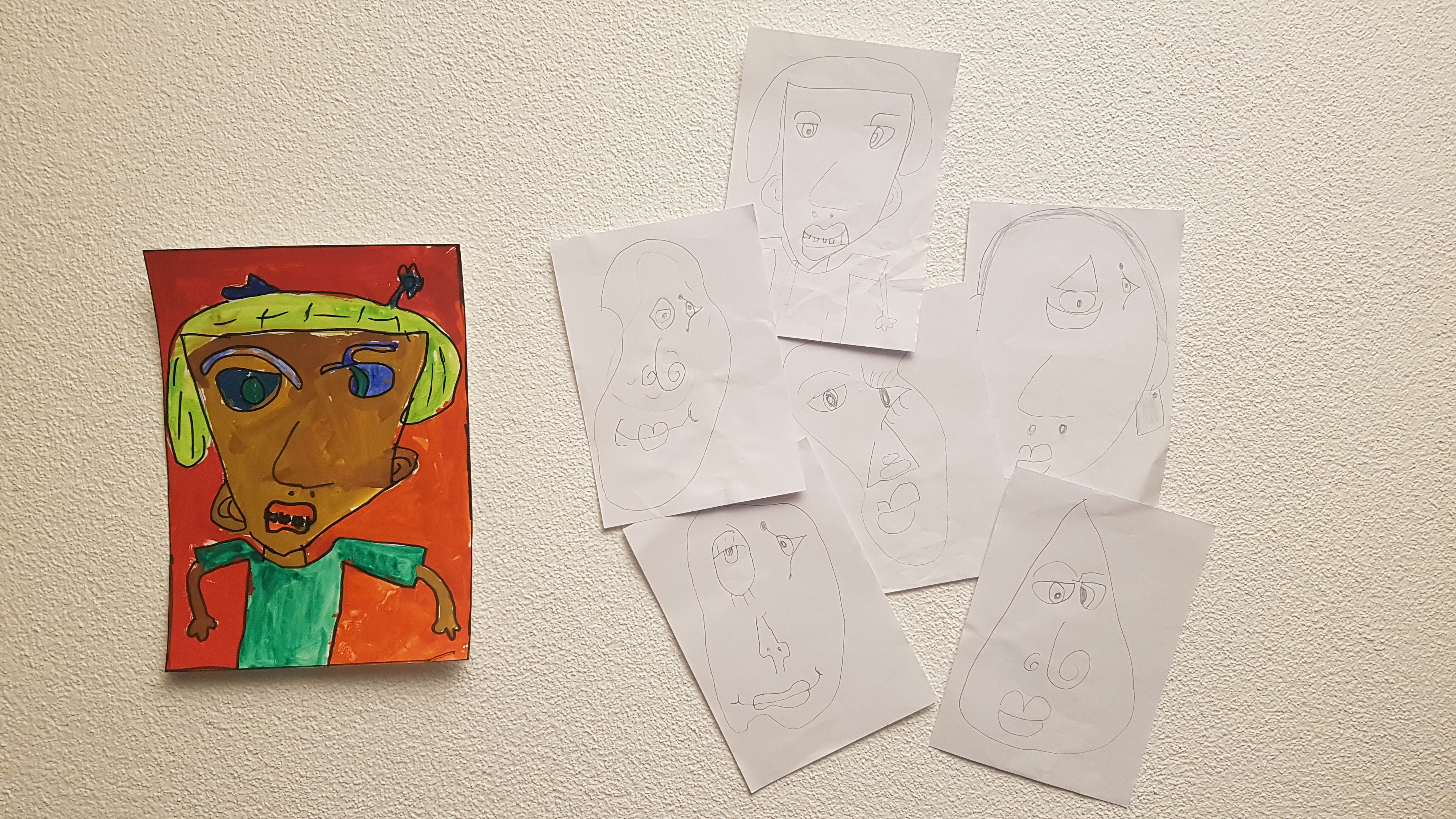 Der Auftrag war, dass sie Picassos Idee überarbeiten und ein eigenes kubistisches Portrait malen. Mithilfe von geometrischen Figuren und verschiedenen Formbeispielen, die sie zusammenwürfeln konnten, haben sie einige Entwürfe entwickelt. Das Lächeln war schief, die Augen waren verschoben, der Kopf war zerdrückt. Alles geriet so herrlich durcheinander. Es wurde viel gelacht, verglichen und diskutiert.