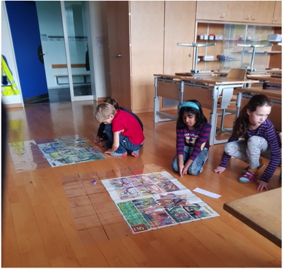 Jeshica, Nino, Selina, Dominik, Berke und Julia aus der 2. und 3. Klasse lernen in der Mathematik der Begabtenförderung, die Bienen Bee-Bot zu programmieren und zu steuern.