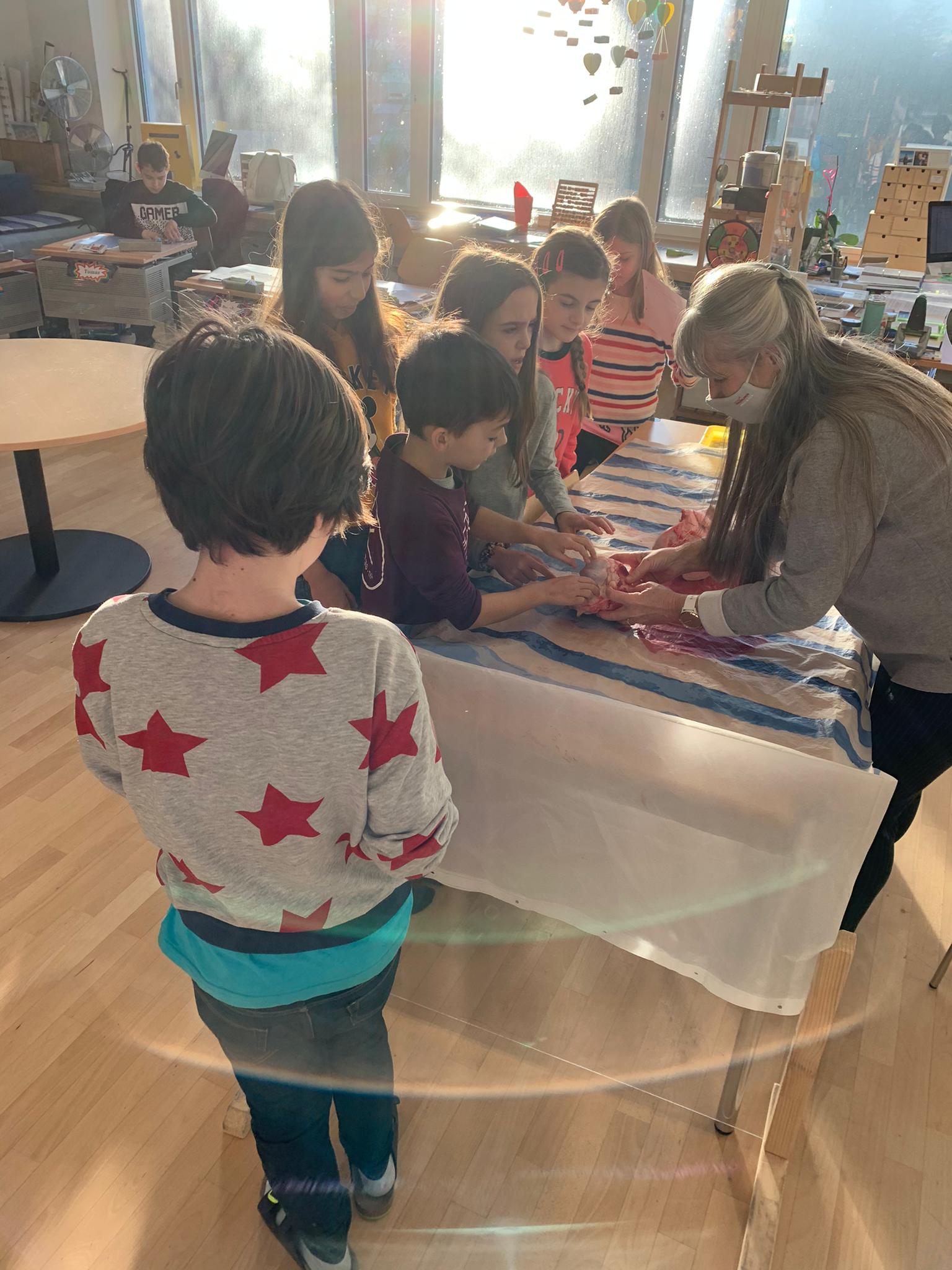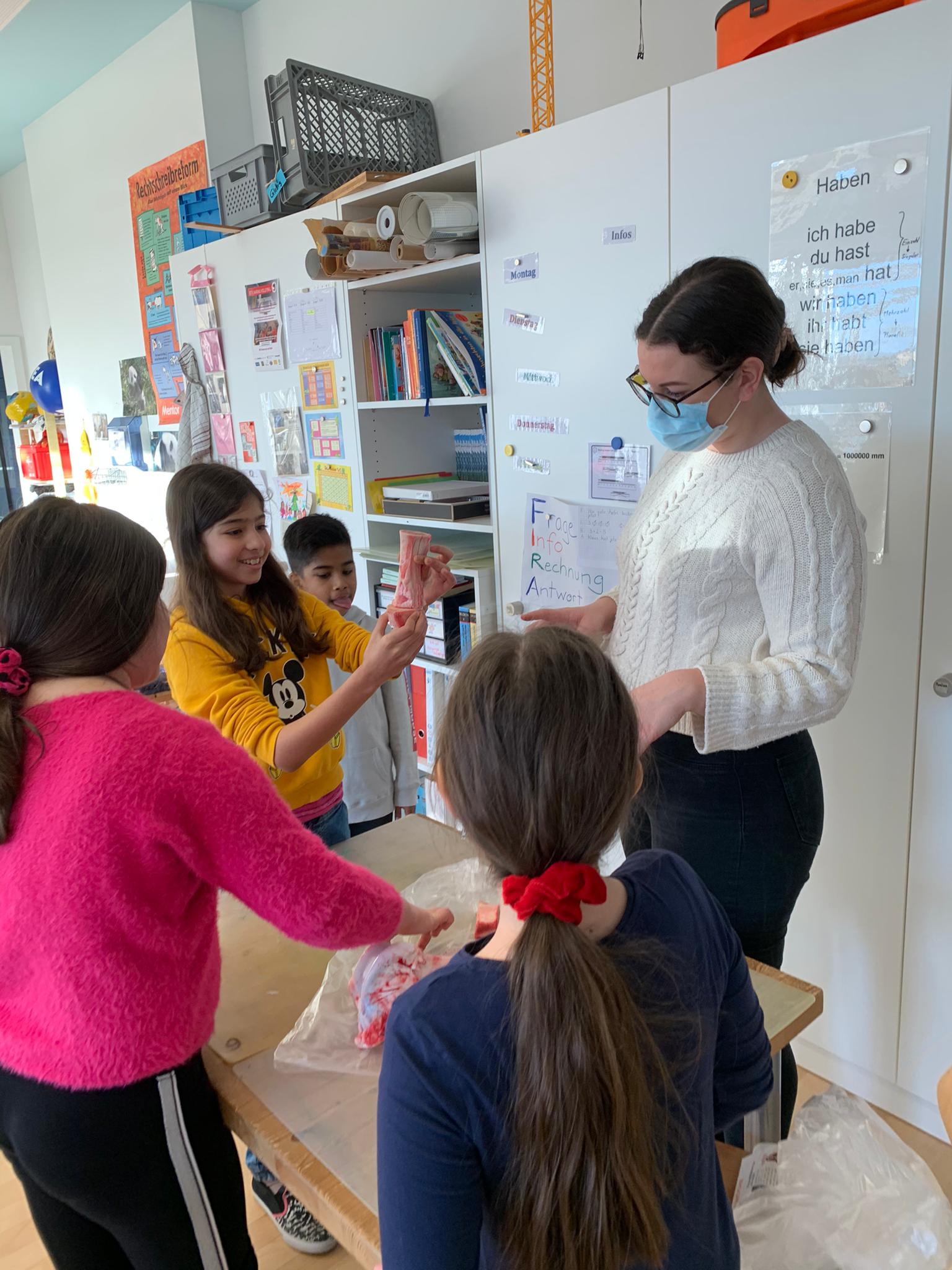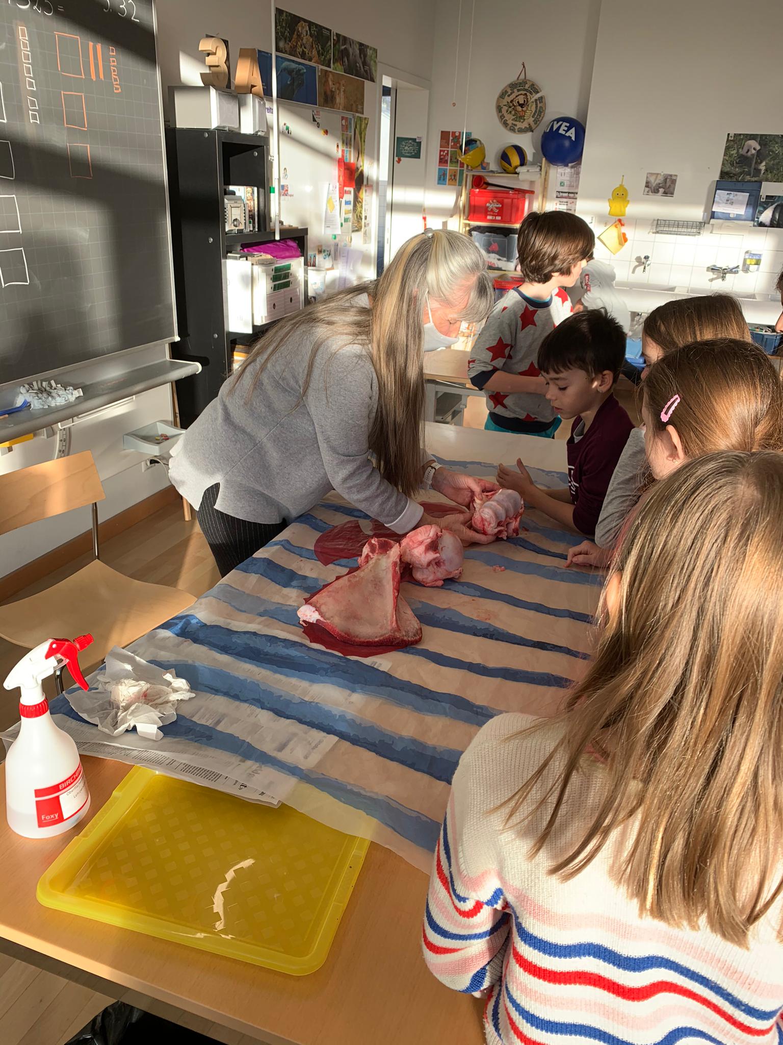 Den Körper "begreifen". Anhand von Rinderknochen sieht sich die 3a die Funktion und den Aufbau von Gelenken an, untersucht das Knochenmark und erkennt Sehnen und Muskelansätze.