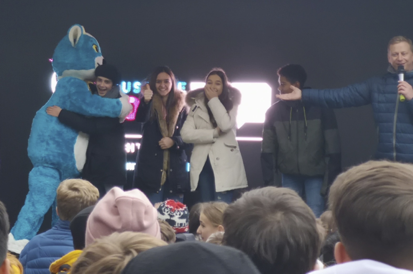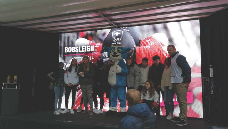 Als Abschluss durften die Jugendlichen auf die Bühne für ein Foto mit Yodli vor der olympischen Kulisse.