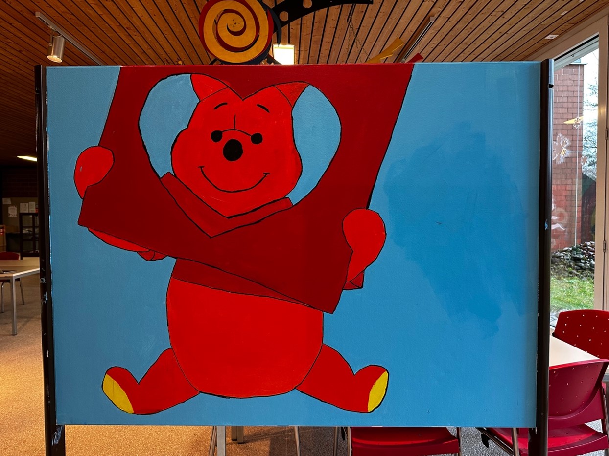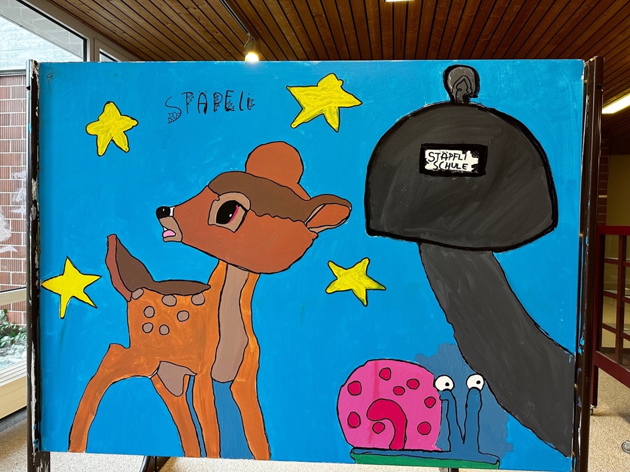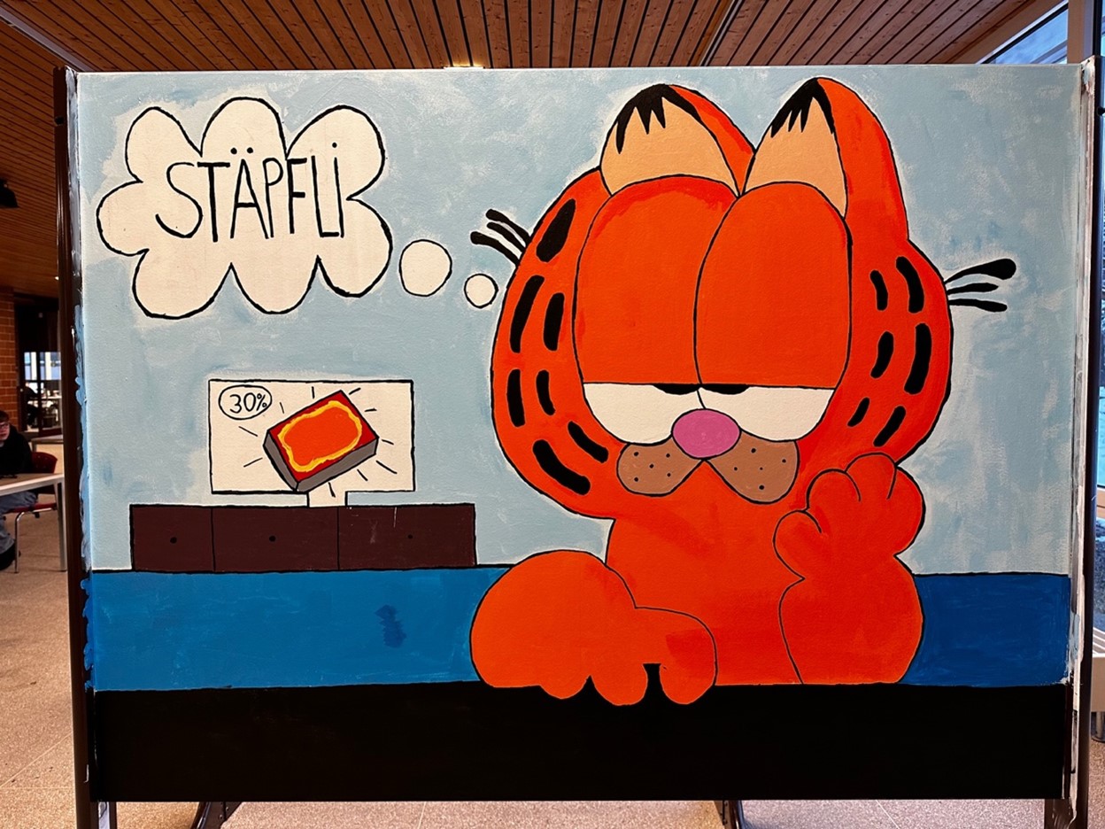 Die Schülerinnen und Schüler der 1. Oberstufe haben die alten, grauen Stellwände neu angemalt. Die Stellwände sehen jetzt super aus. Das Foyer des Schulhauses wirkt nun viel erfrischender und fröhlicher.