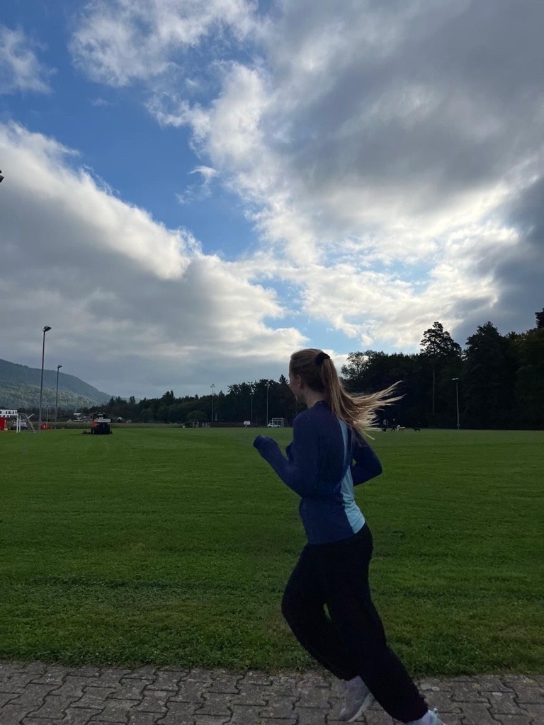Am Morgen war es kühl und die Läufer*innen versammelten sich am Sportplatz und es war nicht windig. Zuerst liefen die Mädchen, dann die Knaben. Mit einem Pfiff rannten die Mädchen schon los ...