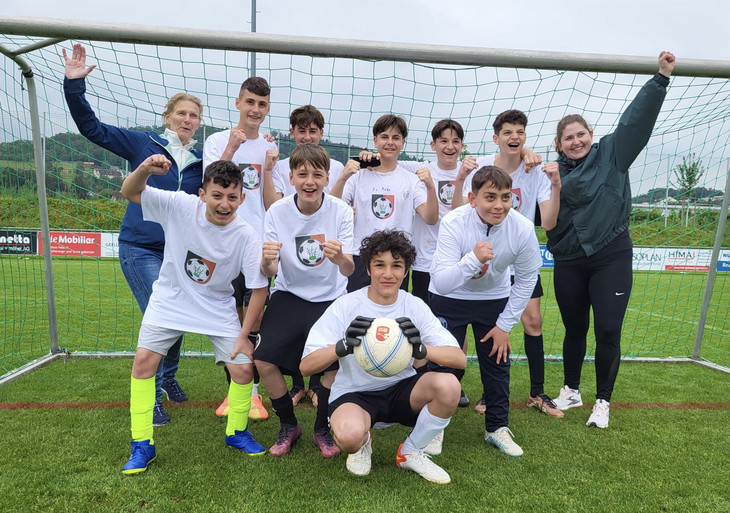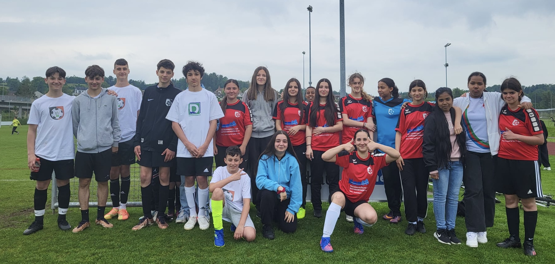 Der 24.5.2023 war ein Glückstag! Wir waren mit der Klasse am CS Cup in Mellingen an der kantonalen Ausscheidung der Schulfussball-Schweizermeisterschaft. Um 10 Uhr haben wir uns im Fussball-Tenue am Bahnhof Aarau getroffen und sind mit dem Zug losgefahren. Auf dem Fussballfeld in Mellingen angekommen, haben wir die Klamotten gewechselt, unser selbst gemachtes T-Shirt im TTG angezogen und uns auf das erste Spiel vorbereitet. Wir spielten mit einer Mädchen- und einer Knabenmannschaft. Nicht alle haben mitgespielt. Die anderen Schülerinnen und Schüler haben uns mit dem selbst gemalten Plakat angefeuert und motiviert.