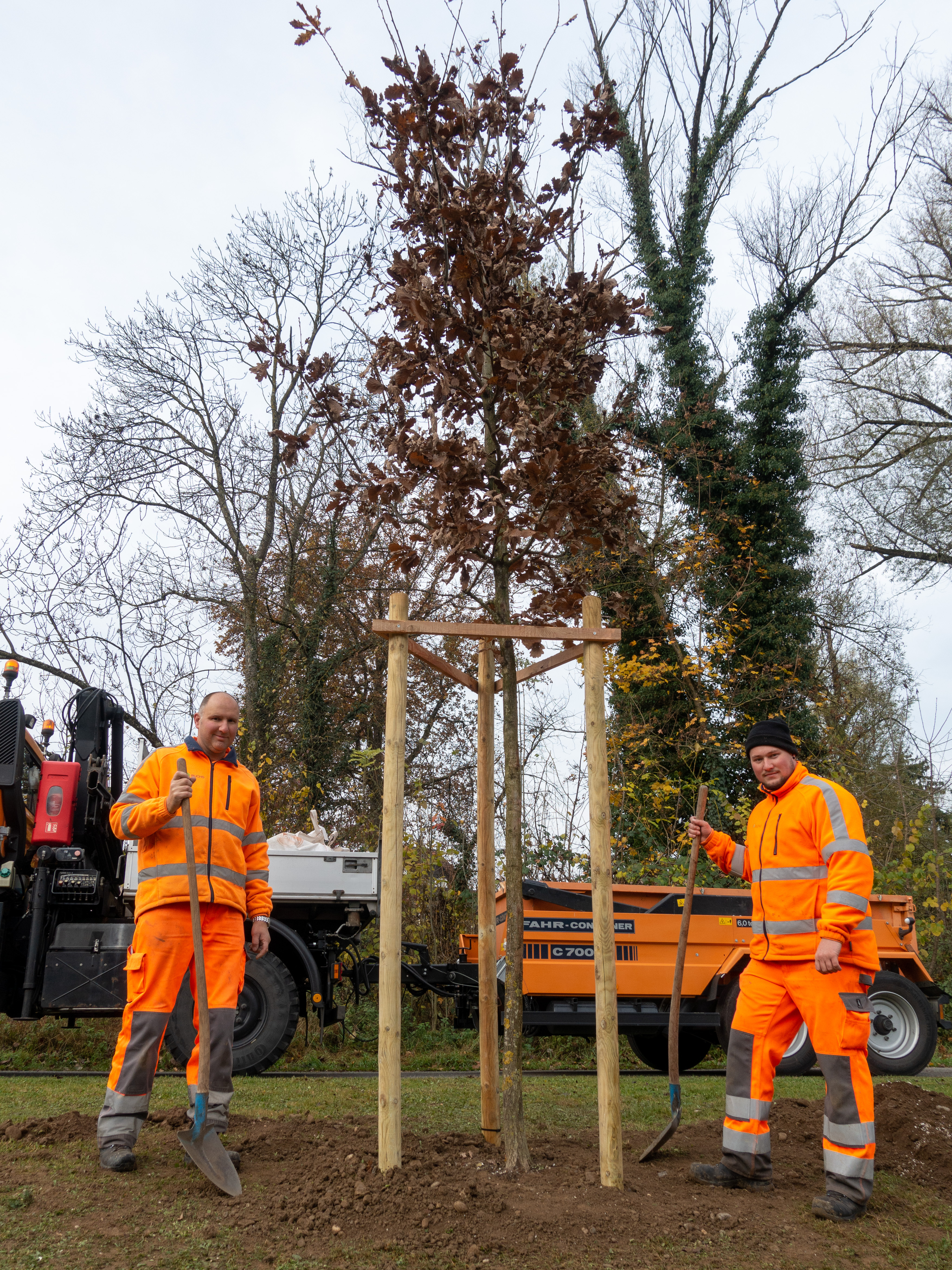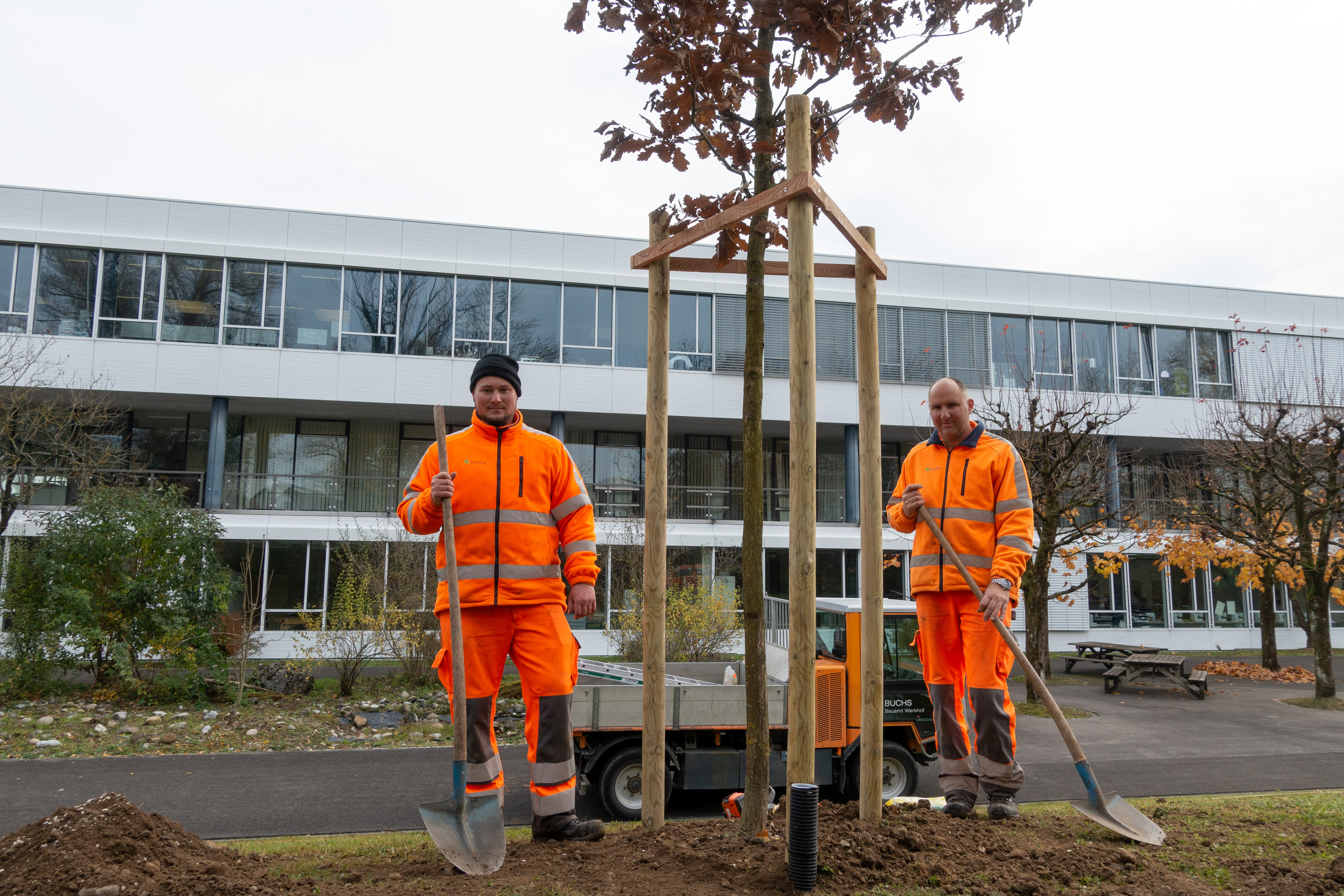 Am 10.11.21 wurde unser Schulhaus noch einmal gewürdigt. Dani Lehner und das Bauamt unter der Leitung von Matthias Keller setzten einen Baum, der auch zukünftige Schüler und Schülerinnen, sowie Lehrpersonen an das Jubiläumsjahr erinnern wird.