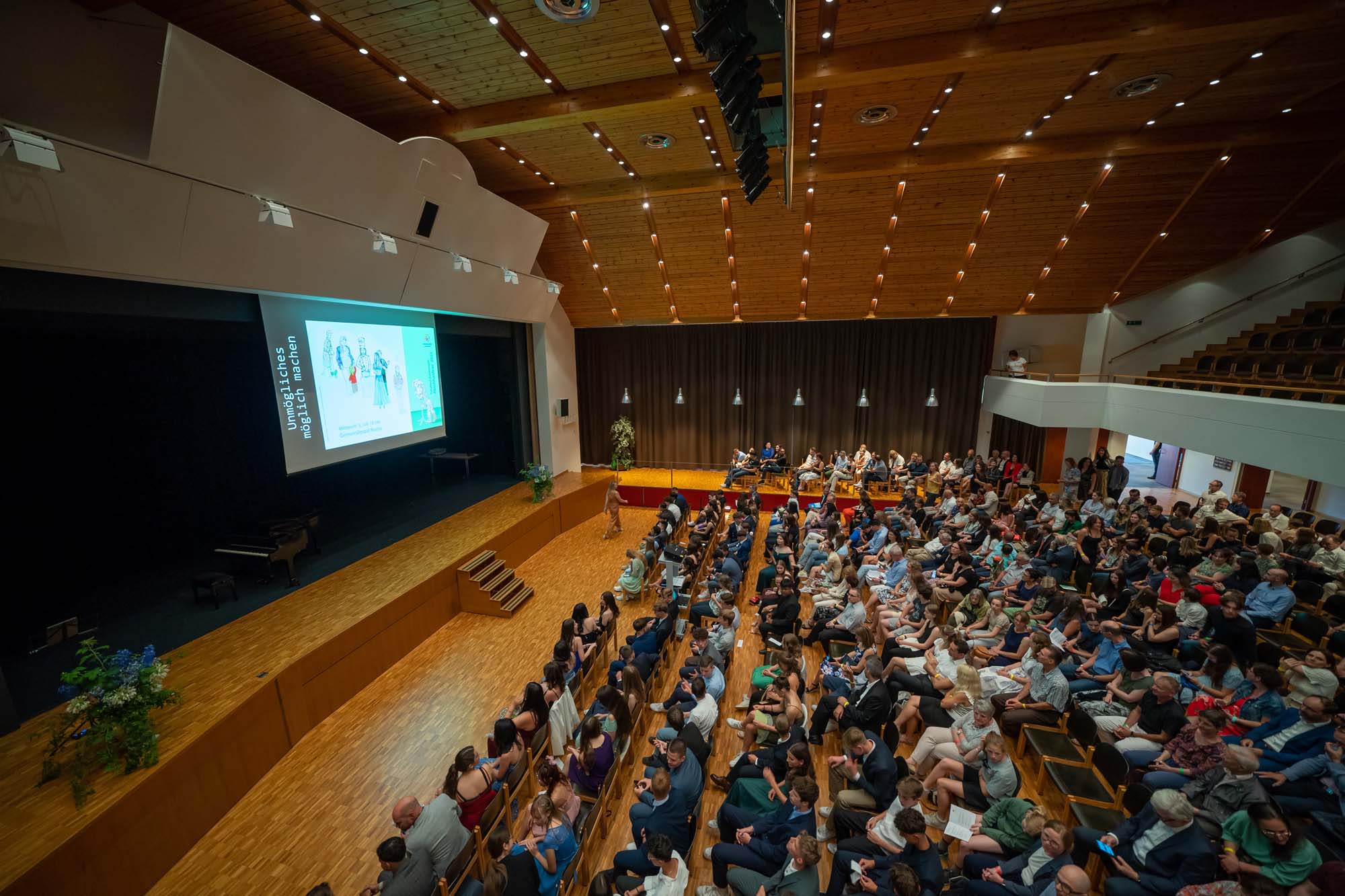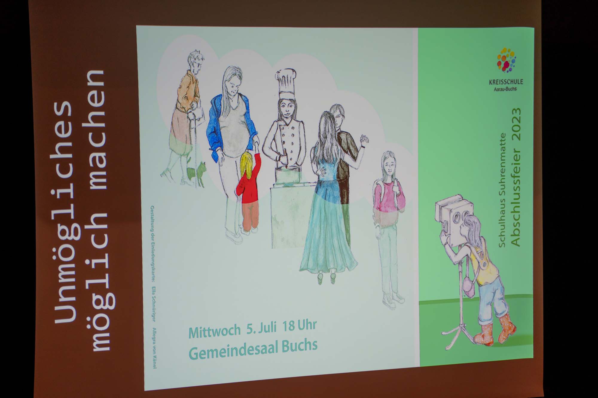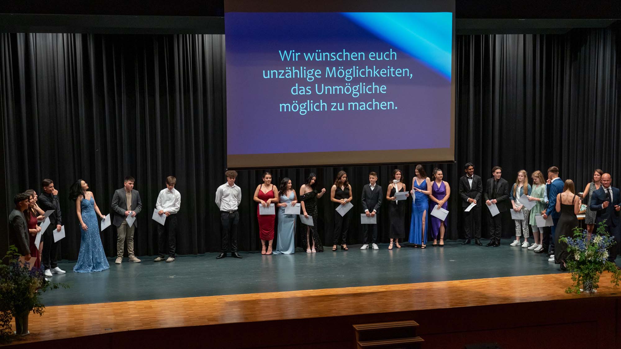 Wiederum bei schönstem Wetter fand am 5. Juli 2023 die Abschlussfeier der Suhrenmatte im Gemeindesaal statt. Aufgeregt, schön angezogen und frisch frisiert warteten die B3a, B3b, B3c und die S3a auf ihren grossen Auftritt. Unter dem Motto "Unmögliches möglich machen" stand auch die Rede des Schulleiters Patrik Brack, in der er die Schüler und Schülerinnen dazu aufforderte, nicht aufzugeben und ihr Bestes zu geben, um Unmögliches möglich zu machen. Scheinbar unmöglich schienen auch die Talente von Yumiko Huguenin, die, begleitet am Piano von ihrer Mutter, auf der Geige einen Satz aus dem Mendelsohn-Violinkonzert vorspielte, sowie von Nina Jovic und Berina Becirbasic, die ein Lied von Bruno Mars vorsangen. Bei der Zeugnisübergabe, beim anschliessenden Apéro und bei den endgültigen Verabschiedungen blieben nicht alle Augen trocken. Wir wünschen allen austretenden Schüler und Schülerinnen alles Gute und viel Erfolg!