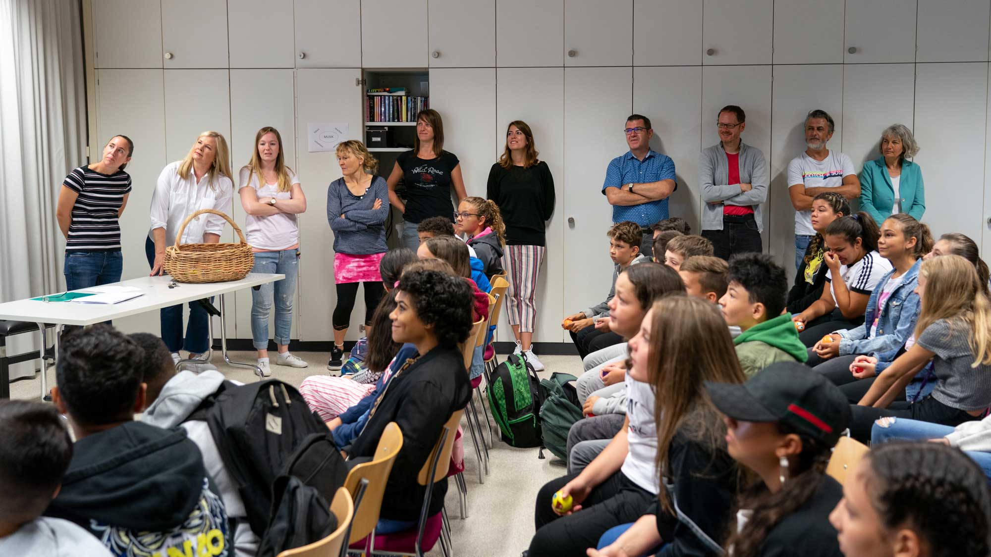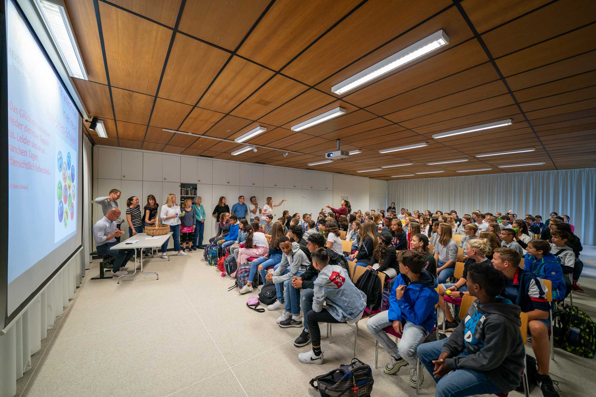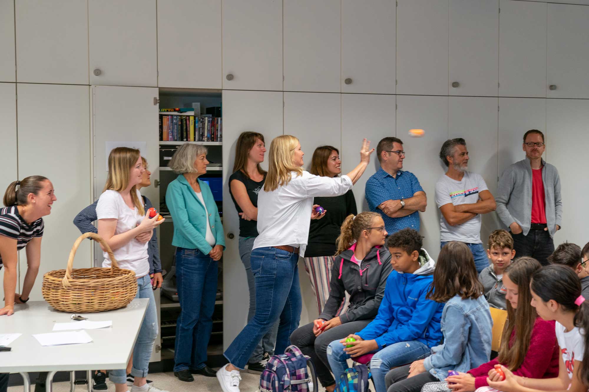 Als kleines Begrüssungsgeschenk erhielten die Jugendlichen dann auch passend zum Thema einen persönlichen «Anti-Stress Ball». Die Klassenlehrpersonen schlüpften in die Rolle der Werfer und die Schüler/innen hatten alle Hände voll zu tun, die Bälle zu fangen. Für eine gute Stimmung war gesorgt und ein mit Spannung erwartetes Schuljahr hat begonnen.