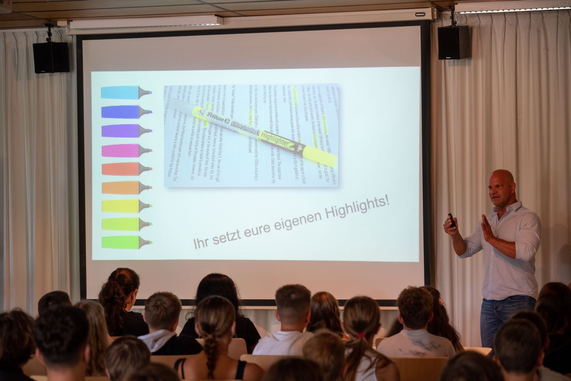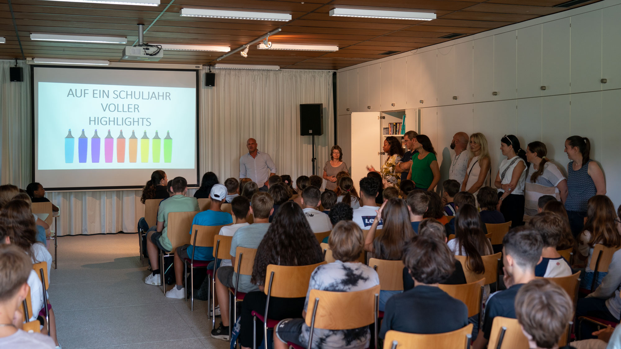 Unter dem Motto "Auf ein Schuljahr voller Highlights" wurden die neuen Schüler und Schülerinnen der 1. Oberstufenklassen am letzten Montag in der Suhrenmatte begrüsst. Der Schulleiter Patrik Brack schaffte bei seiner Begrüssung Vorfreude auf die kommenden Highlights dieses Schuljahres, wie zum Beispiel der Ausdauersporttag, das Schulhausfest oder die Themenwoche. Er ermunterte die neuen Schüler und Schülerinnen aber auch, ihre eigenen Highlights zu setzen, indem sie sie sich für die Schule, ihre Leidenschaften und ihre Mitschüler und Mitschülerinnen im Schulhaus einsetzen. Damit dies sicher gelingt, durften alle einen neuen Highlighter mitnehmen. Wir wünschen allen neuen Schüler und Schülerinnen einen guten Start, eine unvergessliche Zeit und viel Erfolg in der Suhrenmatte!