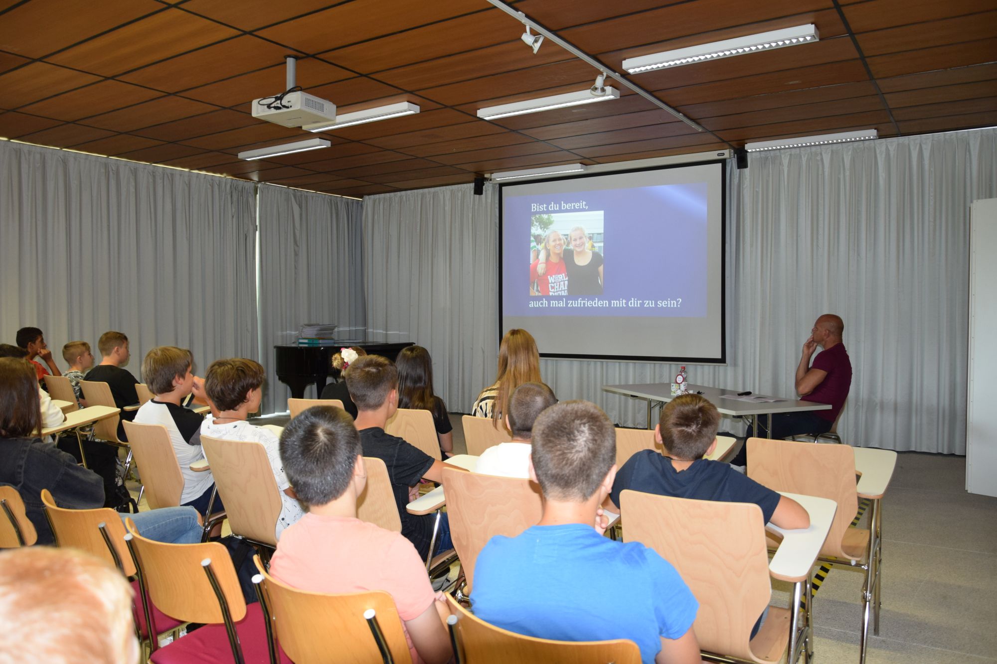 Diese Fragen – und viele mehr - wurden den Schüler/innen als Einstieg in einer Powerpoint Präsentation gestellt. Sie war mit passenden Fotos von vergangenen Schulanlässen bebildert und mit Musik untermalt. Die Fragen konnten alle Schülerinnen und Schüler still für sich selber beantworten.