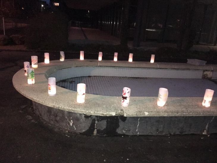 Wir nahmen kleine Gläser und Kerzen mit. Am Sonntagabend, den 13. Dezember, 17.00 Uhr haben wir die Lichter vor dem Schuleingang Suhrenmatte auf dem Brunnen aufgestellt und die Teelichter angezündet.