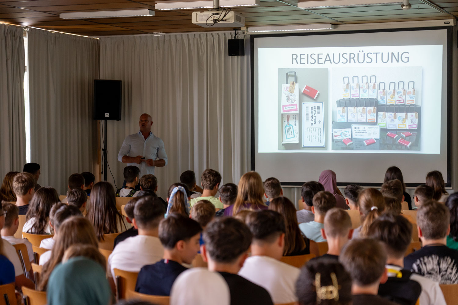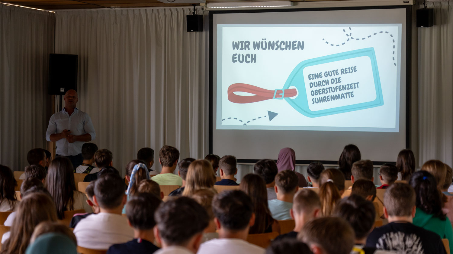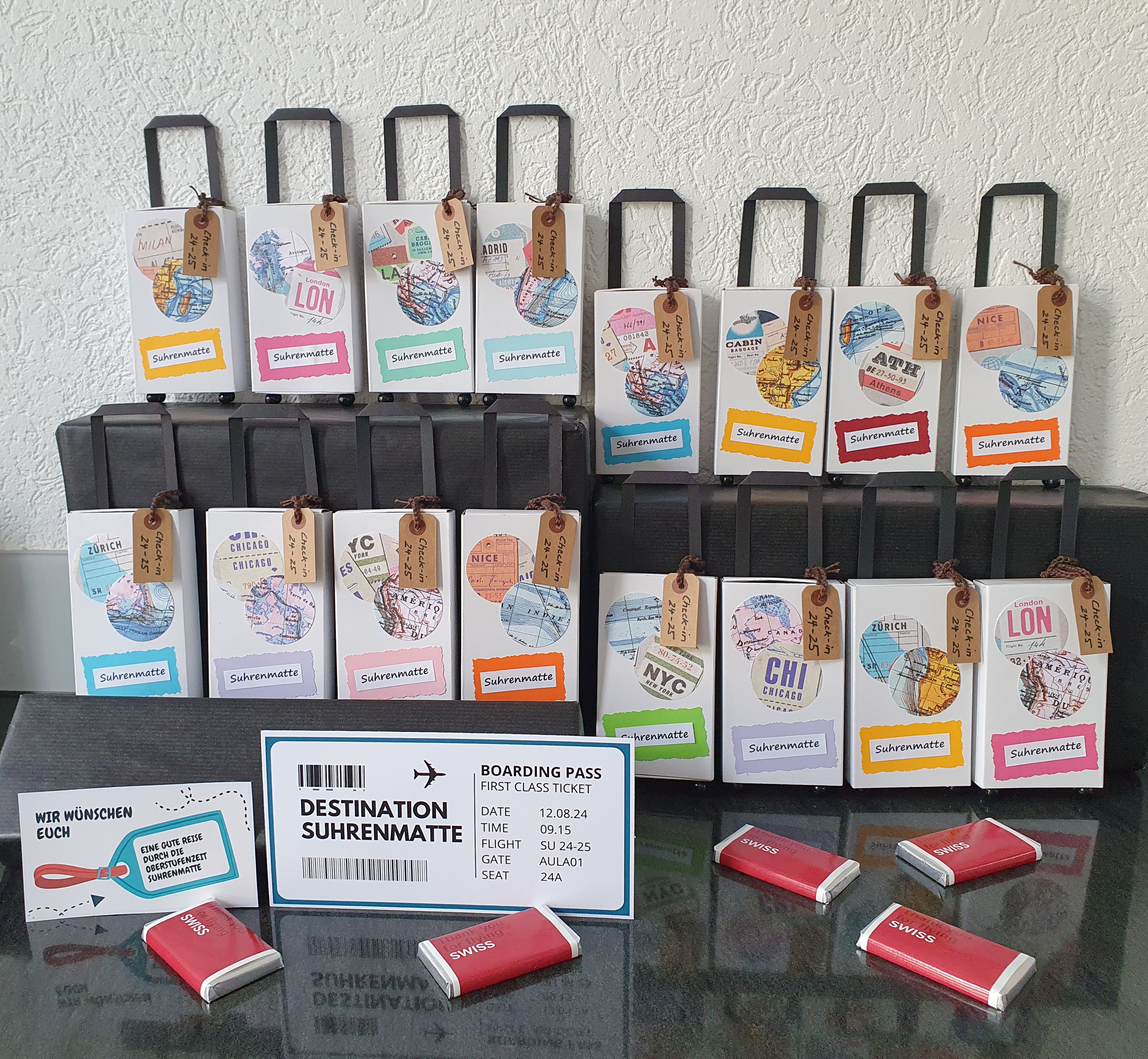 Jede/r Schüler/in erhielt einen „Boarding Pass“ für die Destination Suhrenmatte sowie einen mit guten Wünschen und einem Swiss Schöggeli gefüllten „Rollkoffer“. Die Schulleitung verglich die bevorstehende Schulzeit mit einer Flugreise, auf der die Klassenlehrpersonen als Captains und die Fachlehrer/innen als Cabin Crew die Schüler/innen auf allen Flughöhen, in verschiedenen Geschwindigkeiten, über die Wolken hinweg und hin und wieder auch durch eine Gewitterzone steuern.