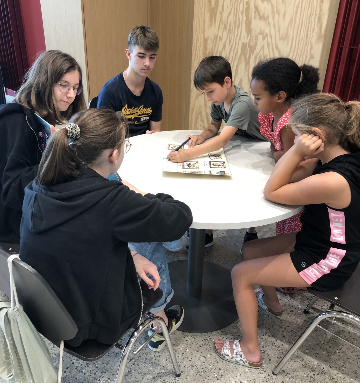Als es soweit war und die S1a vor dem Risiacher stand, wurden alle Teams an verschiedene Tische gebracht, wo sie sich einrichten konnten. Es waren alle Schüler:innen ein wenig nervös. Mit viel Freude haben sie vorgelesen. Wenn die Geschichte fertig war, wechselten die 1. Klasskinder an den nächsten Tisch zu einer anderen Geschichte.