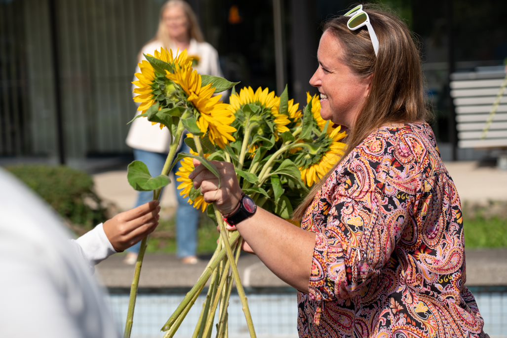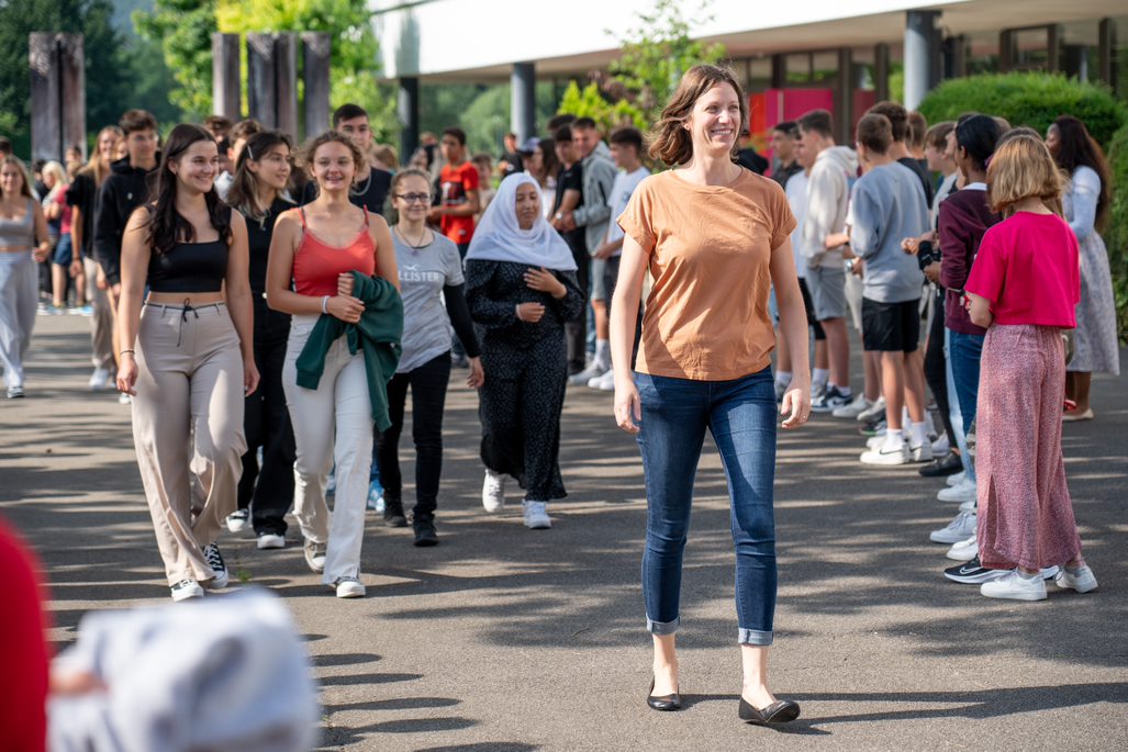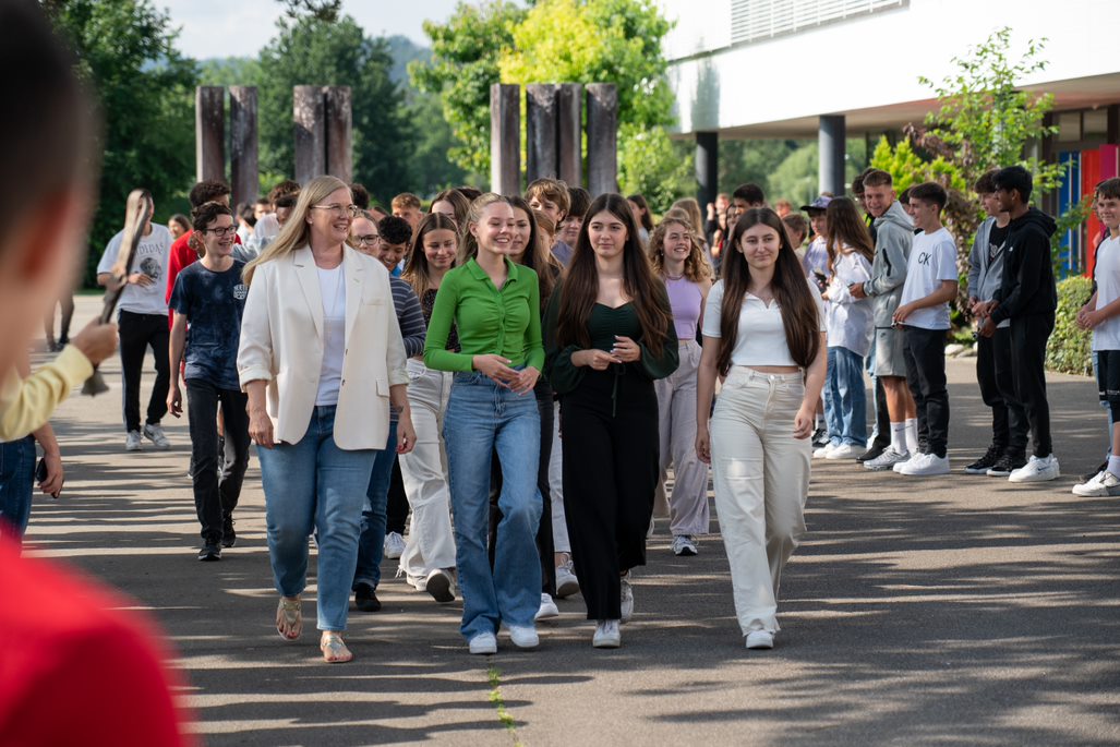 Mit einem weinenden und einem lachenden Auge durften alle austretenden Schüler und Schülerinnen der Suhrenmatte heute über den roten Teppich das Schulhaus verlassen und unter tosendem "Gebimmel" der vielen Glocken der anderen Klassen über den Schulhausplatz laufen, um am Ende eine Sonnenblume überreicht zubekommen. Alle ein letztes Mal.....aber am Abend stand die Abschlussfeier an, auf die sich alle freuten.