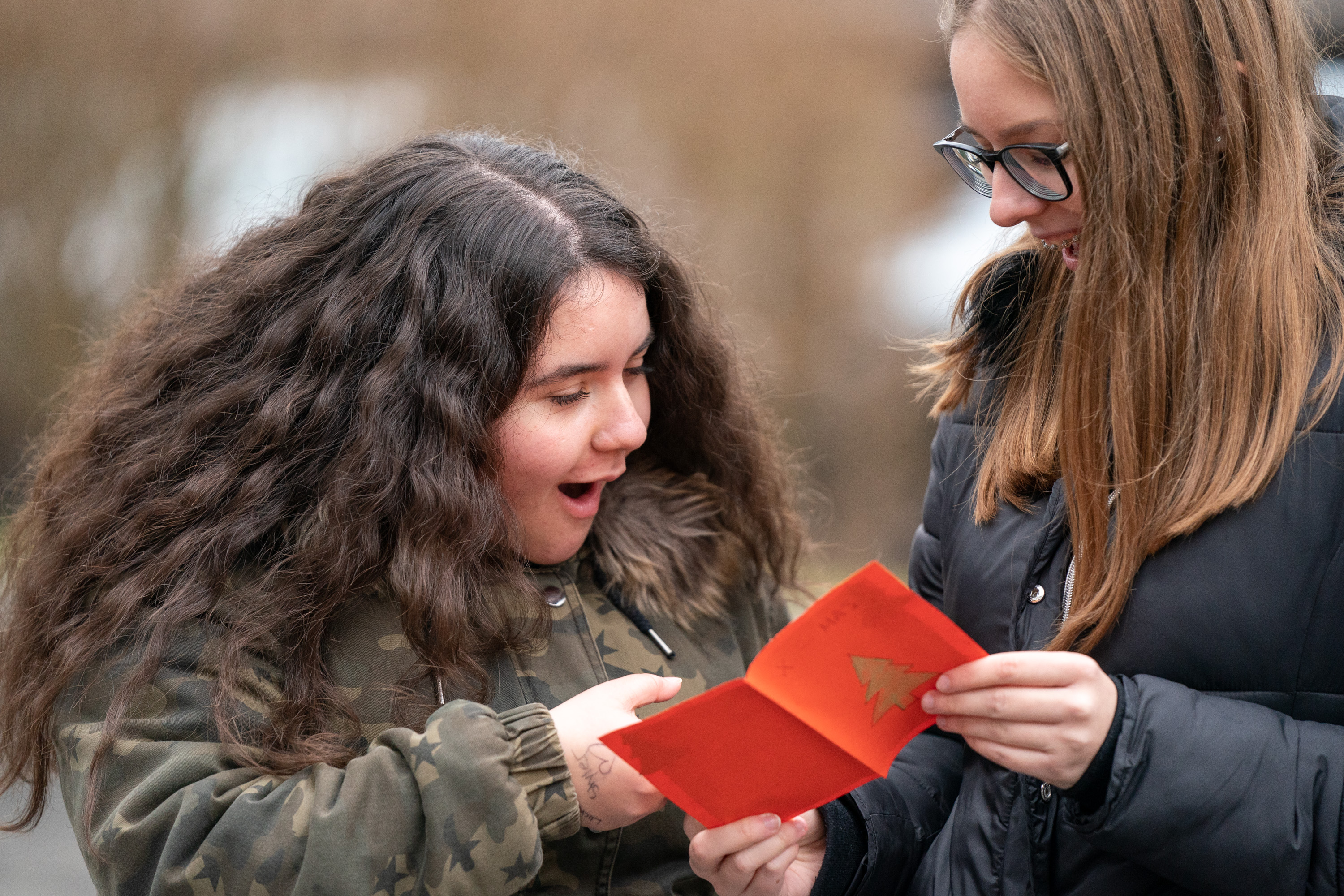 Höhepunkt der Feier war die feierliche Übergabe der persönlichen Weihnachtskarten. Alle Schüler/innen hatten im Vorfeld der Feier einen Namen gezogen und schrieben dieser Person einen weihnachtlichen Gruss. Die Spannung war gross, wer hatte wohl wem eine Karte geschrieben?